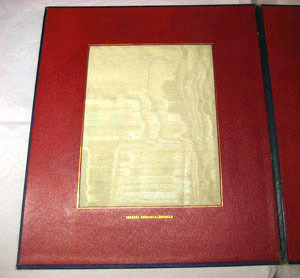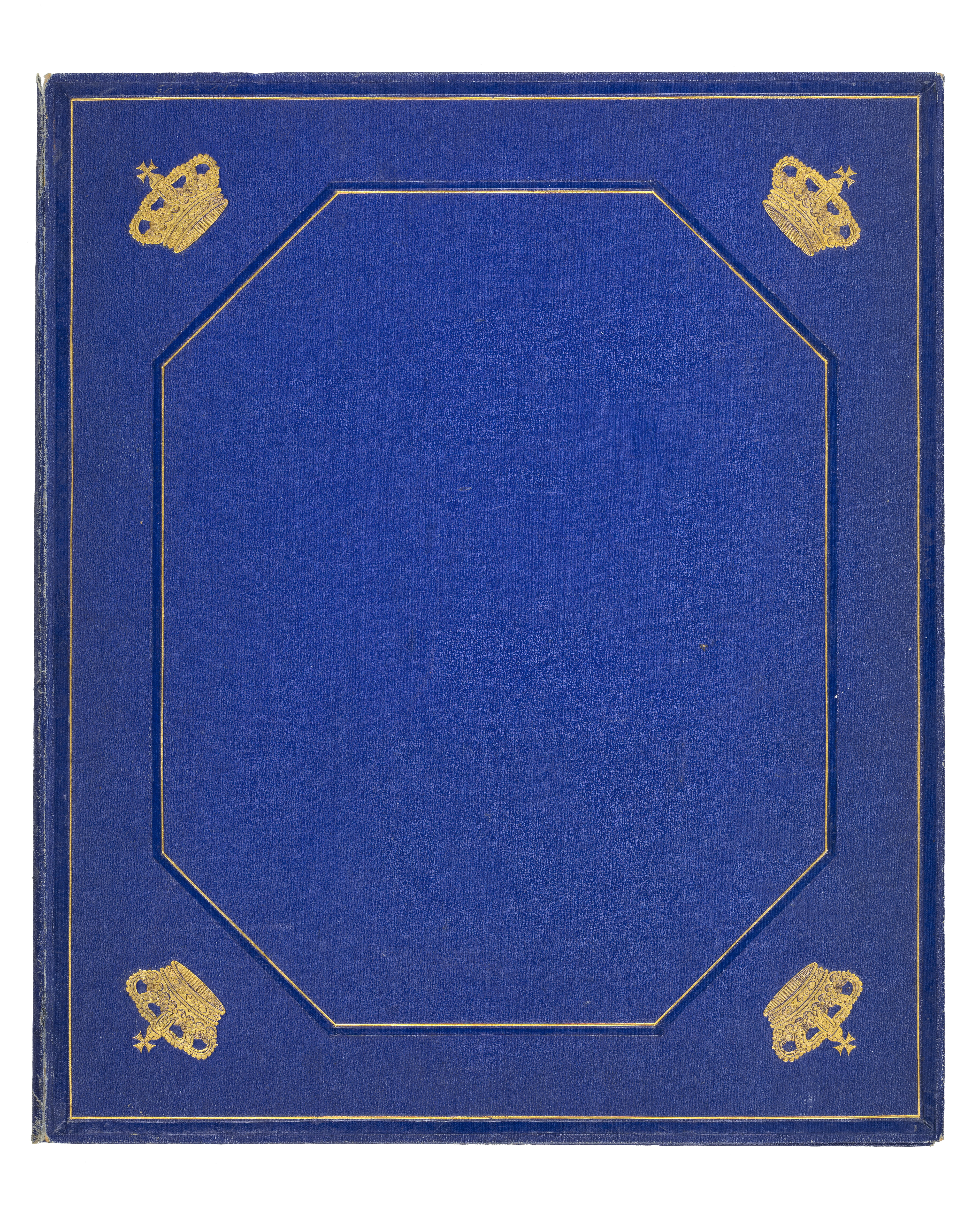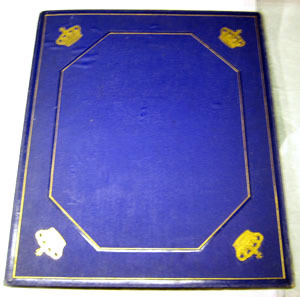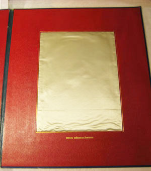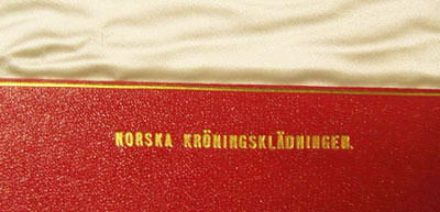 Album av pressad papp, klädd med klot som efterliknar marokängskinn, på utsidan blå och på insidan av röd klot. Ryggen är på insidan har en blågrön ton. Albumets utsida inramas både på fram- och på baksidan av en slät och blank ram, bredd 7 mm och innanför en smal guldram. En åttkantig blank, slät,ram på albumets mitt, bredd 4 mm, samt med en smal guldram innanför. Intill den åttkantiga ramen finns fyra kungliga kronor i guld, en krona i vardera hörn. Mitt på albumets framsida Sveriges riksvapen i guld, 85 x 70 mm. Invändigt i albumet finns på vänster sida ett stort rektangulärt tygprov (längd 305 mm, bredd 232 mm) inramat av en smal guldram. Tygprovet är av benvit silvermoaré med varpris med flotterande silverinslag. Under tygprovet är präglat i guld: "SVENSKA KRÖNINGSKLÄDNINGEN.". Invändigt på pärmens högra sida finns ett tygprov av lika storlek (längd 305 mm, bredd 232 mm) inramat av en smal guldram. Tygprovet är av benvit sidenatlas. Nedanför tygprovet är präglat i guld: "NORSKA KRÖNINGSKLÄDNINGEN.". Tygproverna är från drottning Sofias två kröningsklänningar: den som användes vid kröningen i Sverige och den som användes vid kröningen i Norge. Tygprovet till den svenska klänningen är från K A Almgrens sidenväveri, Stockholm, medan tygprovet till den norska klänningen är från Albert Valentin & Cie, hovleverantör, Stockholm. Jämför med kröningsklänning inv.nr 19105, 19121 samt 19122. Jämför med litografi inv.nr 33944 samt 33945.