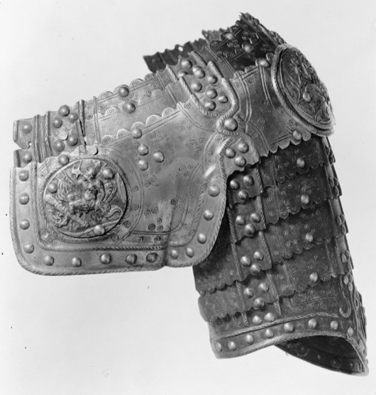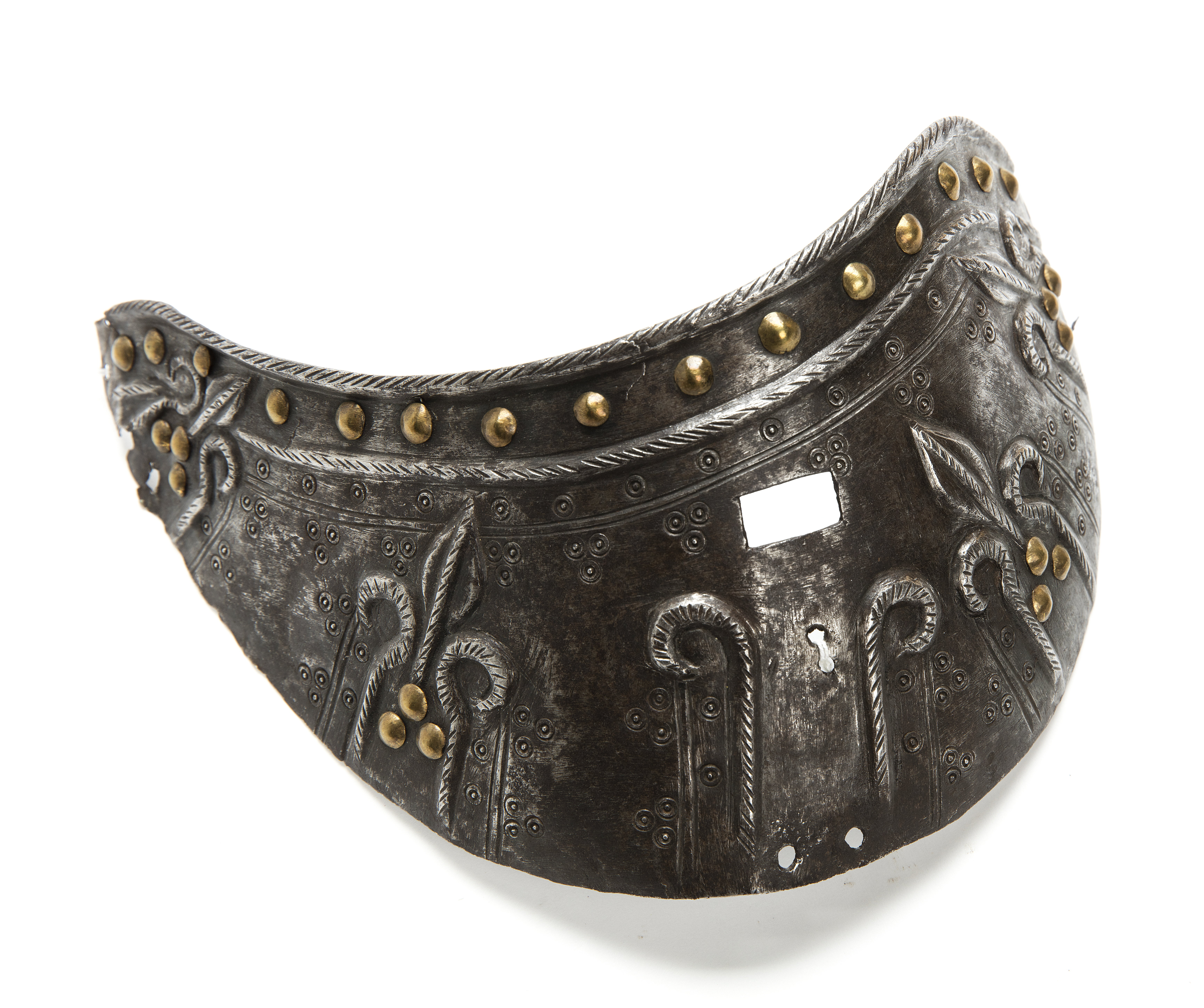 I en sedel undertecknad av Jurgen Kreffling i Stockholm den 4/12 1647 anhåller denne om betalning omfattande fem daler för det arbete harneskmakaren utfört då han blånerat De la Gardies rustning och satt på förgyllda bucklor. Med stor sannolikhet utgör denna skena en del av just den nämnda rustningen (se litteratur). |