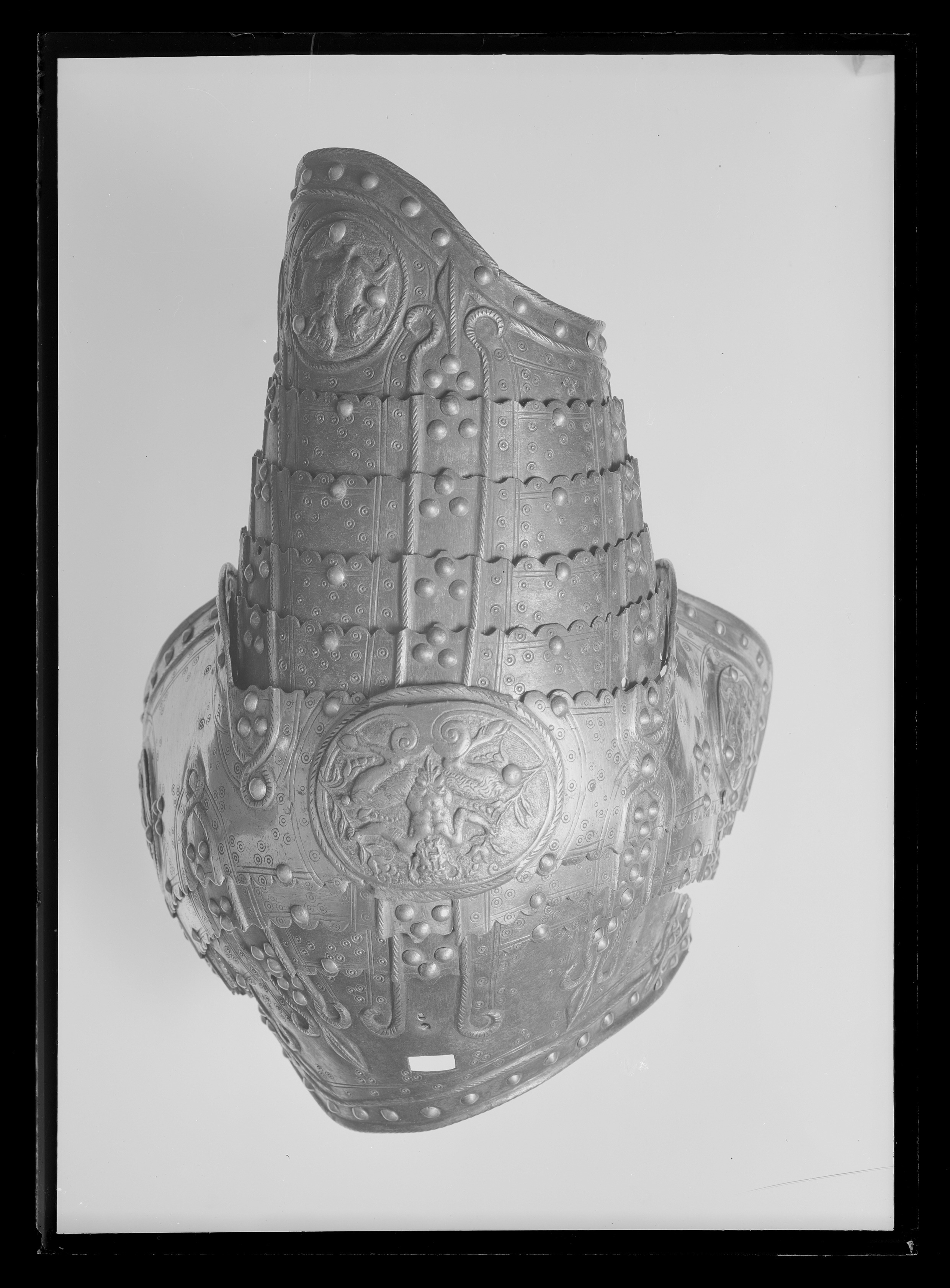 Översta skenan till vänster axelstycke till rustning som har tillhört Magnus Gabriel De la Gardie. Njurformad välvd skena av stål med spår av blånering. Mitt på axeln, cirka 35 mm från överkanten urtag för rem som ska fästa i ringkragen. Nedanför detta återfinns ytterligare två små hål som tornet har varit fäst i. Mitt på, vid nedkanten, två hål. Längs överkanten och ca 20 mm in från samma kant, parallellt med denna, från baksidan driven och från framsidan mejslad repstavsdekor. Mellan dessa repstavar en nitrad av mässingsnitar. Nedanför den inre repstavsdekoren en rad av punsad ringar med prickar innanför. Därefter två parallella mejslade linjer. Under dessa nio stycken grupper om tre punsade ringar med prick i. Från nederkanten och uppåt fem motsvarande repstavsdekorer som avslutas med utåtsvängda ändar och ett spetsig blad, det mittersta dekorpartiet saknar bladet. Skenan är märkt med fyra triangulära punsningar (ordningsföljd i relation till övriga delar och hur de ska monteras). Plåten är förhållandevis intakt. Torn för remmen saknas. Rester av originaltygkant under nitbrickorna. Grovt filad och raspad yta. (tjocklek på plåten 0,8-1,6 mm). Hör samman med skena inv.nr. 23148, 23149 men är inte monterade med dessa.