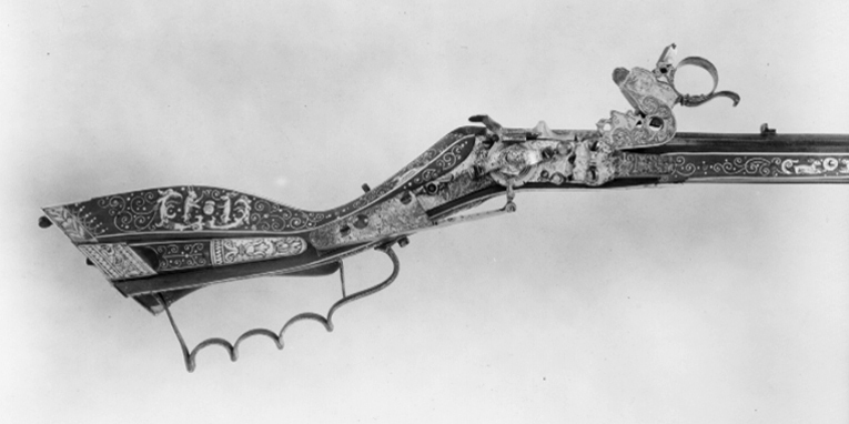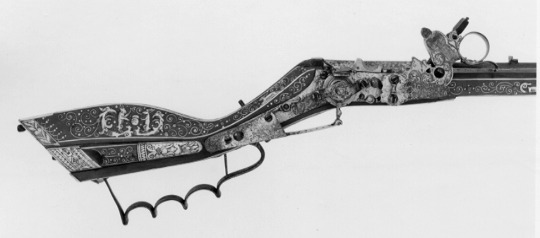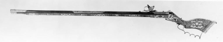Åttsidig, blånerad pipa med 10 räfflor, bombredd 3,2 mm. Punsad och förgylld dekor i tre fält samt på svansskruvbladet. Riktmedel: Ståndsikte av stål, förgyllt stolpkorn. Fästning: Pipan fäst med krysskruv underifrån (främre varbygelskruven) samt två och ett halvt (urspr. fyra) pipstift av ben. Hjullås av teschitztyp, utvändigt hjul och slagfjäder. Låsbleck, hjulbrygga, slagfjäder och hanfjäderbleck förgyllda och med punsad dekor. Förgylld fängpanna och eldskärm. Fängpannelock med graverad dekor, rörlig arm. Hane med lös överkäke och ringformigt fingergrepp, hög, fyrsidig käkskruv med kulformig ände. Mellan hankropp och underkäke en genombruten skärm, graverad, grotesk mask vars skägg övergår i en fågel. På överkäken likaså en fågel. Två tryckknappar med spår av förgyllning på huvudena. Balusterformig hanstudel. Fästning: Två låsskruvar med förgyllda huvuden. Rak, förgylld avtryckare. Avtryckarbleck av ben i form av en hund. Brun helstock, kolvlängd 185 mm. Inläggningar av ben, grönfärgade hornpunkter. Slät bakplåt med kantbård. På anslaget ett symmetriskt rankmönster. På utsidan förgylld varbygel av stål med 3 fingerlägen. Fyrkantig spetsrörka, genombruten rörka samt näsband av ben. På framstocken inläggningar i form av harar och hundar. Tillbehör: Laddstock av trä, l: 841 mm (avbruten, ursprunglig?).