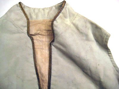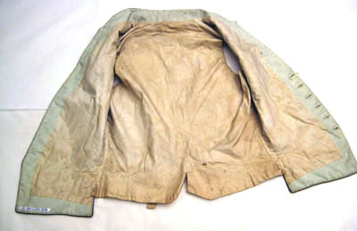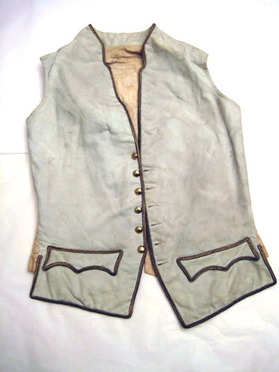 Västen är sydd av ljust celadongrönt tyg av ylle. Västen knäpps ihop med sex stycken rundade förgyllda knappar, 14 mm breda och knapphålen är 18 mm breda. Kragen är rak och 48 mm hög. Ryggen är sydd av vit bomull och har ett spännslå av mässing. På ryggen längst ned är en sprund 45 mm lång.