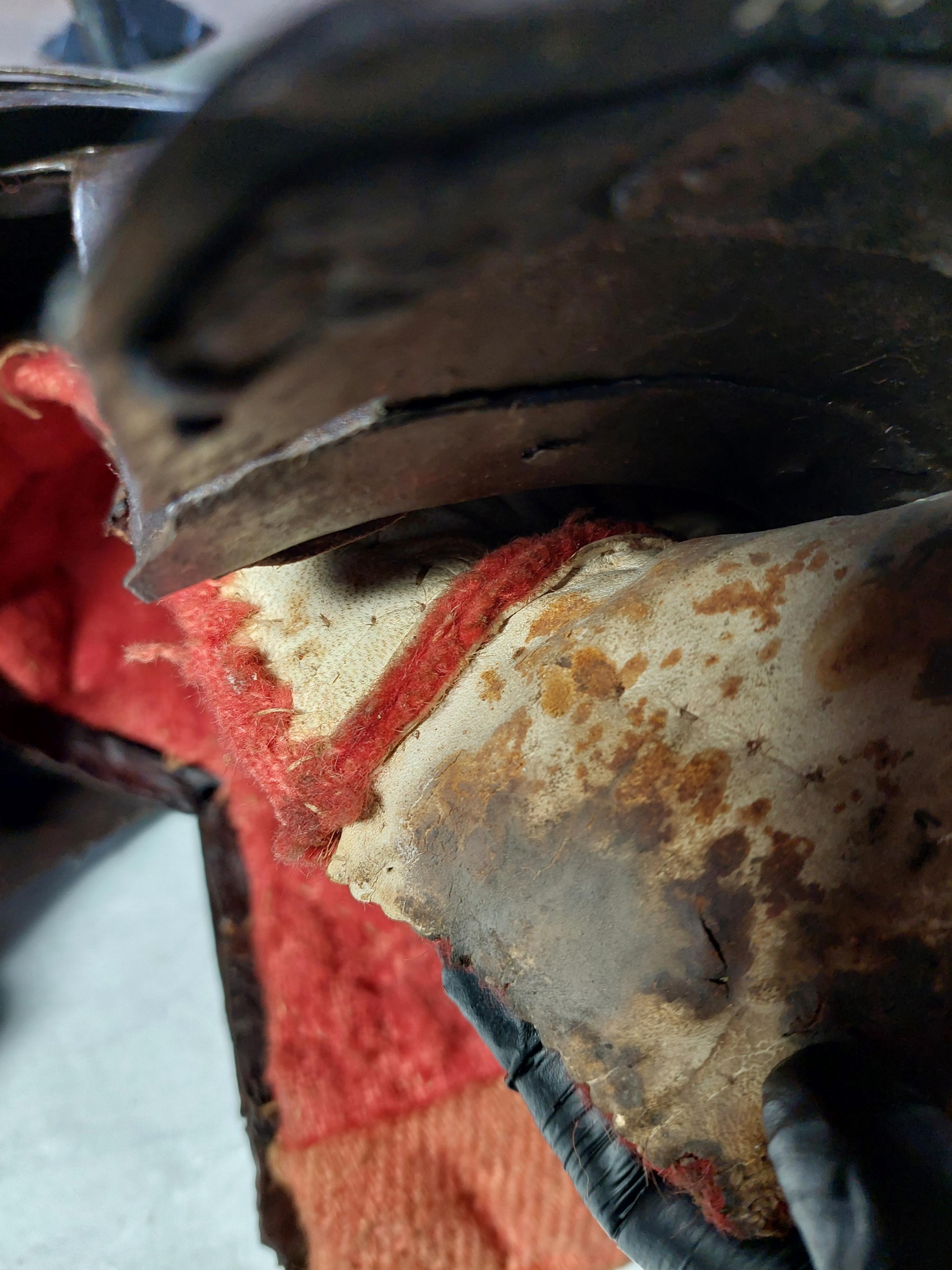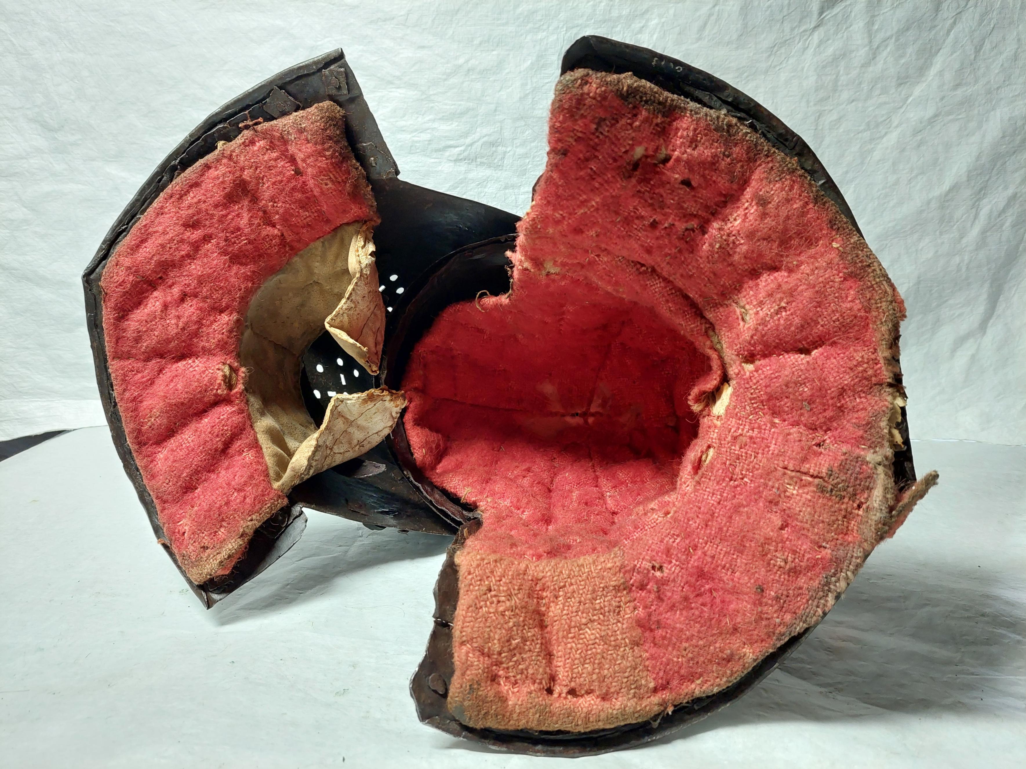 KOMPLETTERANDE BESKRIVNING Sluten hjälm av kyrassiärtyp i sju delar av blånerat stål med stålnitar med pålödda mässingskållar. Ursprungligen ej samhörande med rustning 6812. Kvalitén på hjälmen är lägre än på rustningen. Detta syns exempelvis på de råare kanterna, som inte filats i större grad. Kragens delar samhör inte ursprungligen med resten av hjälmen. Delarna har nitats samman senare, Kragdelarnas ytbehandling avviker från resten av hjälmen, vars yta har tydligare verktygsspår. Ålåtskarvning vid höger visirnit, sannolikt från tillvekrningen. Foder av skinn och ylle. Ylle vävt i tuskaft samt en skarvad bit i kypert. Vid hakpartier skinnfoder.