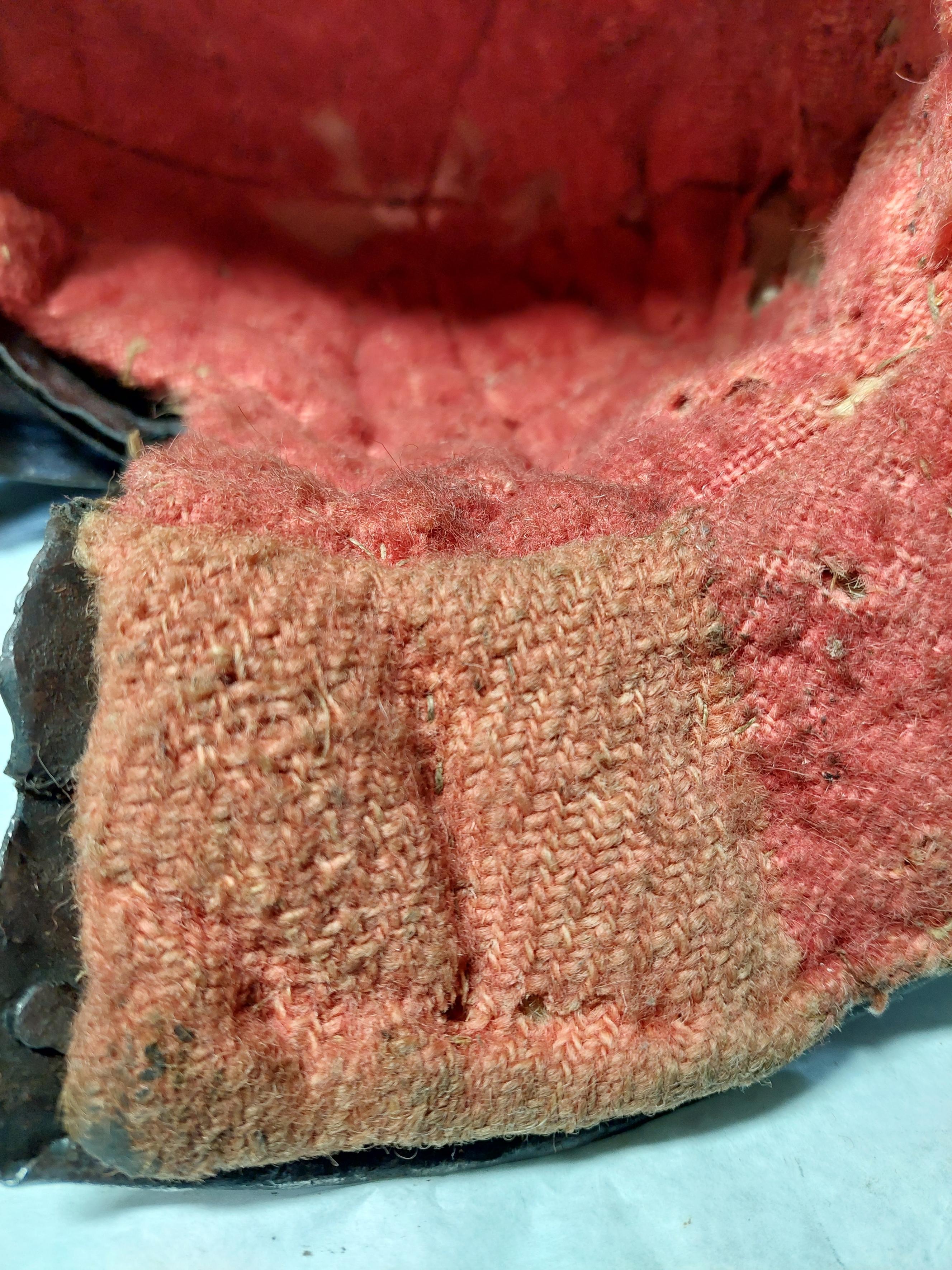 Av blånerat stål med nitar av mässing. Hjälmklocka med kam och plymhållare. Hjälmen med hake på höger sida - fästes i ögla på hjälmklockan. Visiret med tapp för att underlätta upplyftandet. Foder av rött, tuskaftsvävt ylletyg.