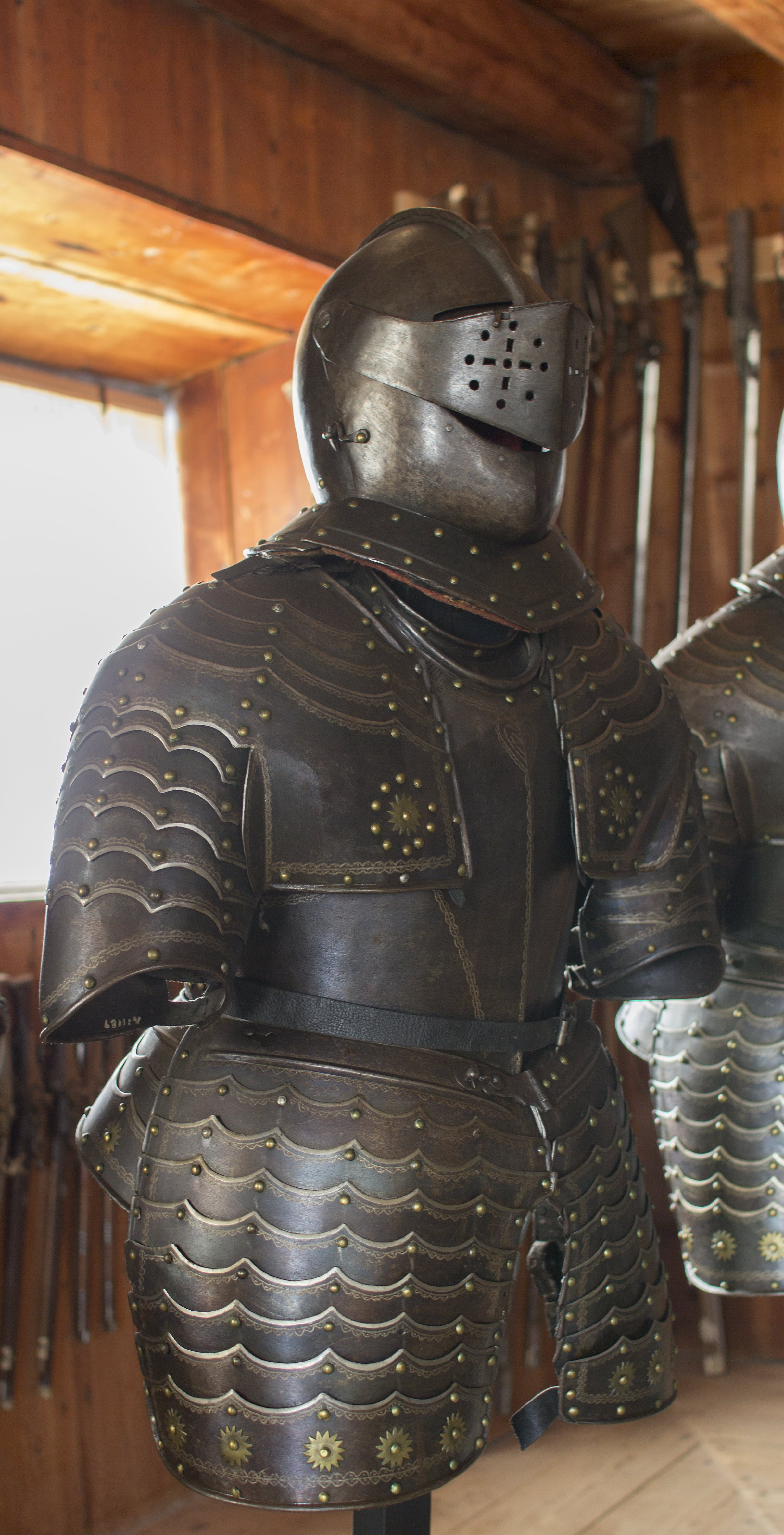 KOMPLETTERANDE BESKRIVNING Sluten hjälm av kyrassiärtyp i sju delar av blånerat stål med stålnitar med pålödda mässingskållar. Ursprungligen ej samhörande med rustning 6812. Kvalitén på hjälmen är lägre än på rustningen. Detta syns exempelvis på de råare kanterna, som inte filats i större grad. Kragens delar samhör inte ursprungligen med resten av hjälmen. Delarna har nitats samman senare, Kragdelarnas ytbehandling avviker från resten av hjälmen, vars yta har tydligare verktygsspår. Ålåtskarvning vid höger visirnit, sannolikt från tillvekrningen. Foder av skinn och ylle. Ylle vävt i tuskaft samt en skarvad bit i kypert. Vid hakpartier skinnfoder.