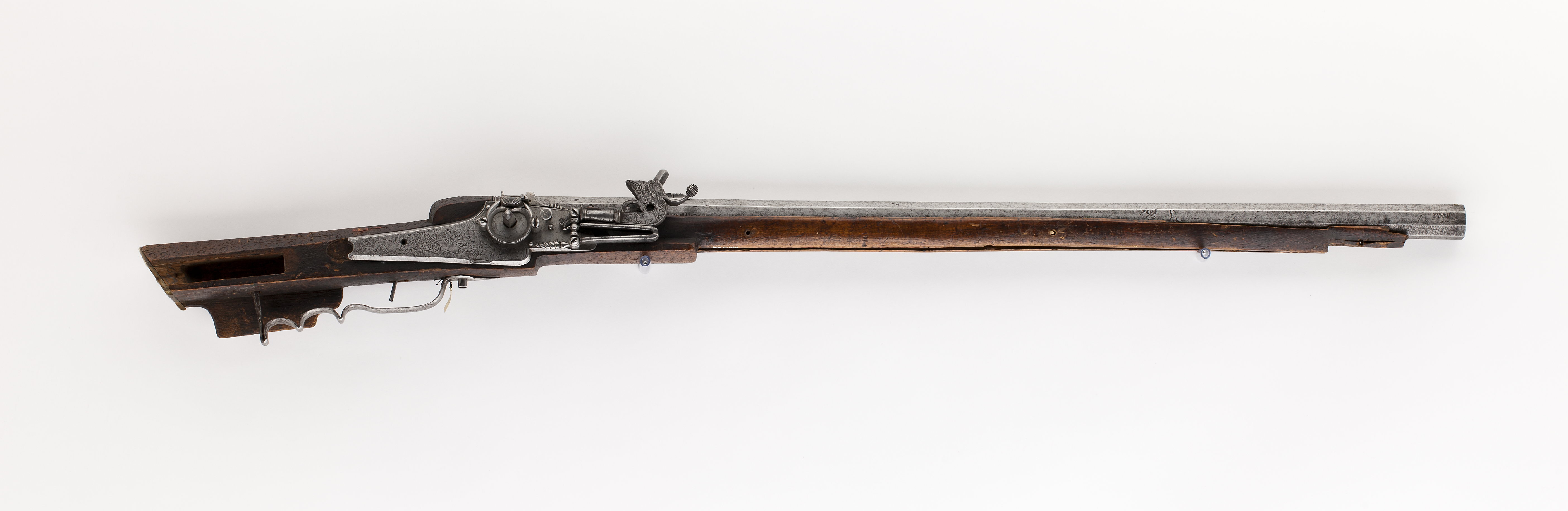 Åttsidig, räfflad pipa av stål, åtta räfflor, godstjocklek vid mynningen: 9 mm. På de tre övre faserna på pipbasen tre räfflade vulster. Kort, rektangulärt svansskruvblad. På de tre övre faserna vid pipbasen, bakom siktet samt på överfasen framför siktet dubbla dekorstämplar, på kammarens översida stämplat: O H, på sidofaserna fyrbladiga dekorstämplar. Riktmedel: Kulissikte av stål, stolpkorn av mässing, båda inlaxade. Fästning: Tre häften. Pipan fäst med krysskruv underifrån (varbygelns skruv) samt ett pipstift av stål (spik). Hjullås av tysk typ med plant låsbleck, fasade kanter, bakänden konkavt insvängd. På låsblecket graverad rankdekor samt däri två hundar(?) samt en naken, fiolspelande kvinnofigur, underkroppen övergående i ranka. Utvändigt hjul fäst med ring och skruvar kl. 3 och 9. Fängpanna med låg krutskärm, rundad, räfflad ytterkant, fängpannelock med rörlig arm, grepp med plan överände med kryssdekor, framände med täta, tunna ringar. Tryckknapp med svagt välvt, skivformigt huvud med kryssdekor. Hane med balusterformig kropp, kroppens främre del och halsen fyrsidig med genombruten, s-formig skärm på huvudet. Lös överkäke med uppåtsvängt fingergrepp, avslutat med räfflad kula. Käkskruv med fyrsidigt huvud. På halsen ett graverat ansikte, käkarna graverade som odjurshuvud. Räfflad, balusterformig studel, hanfjäder med rundade kanter, fjäderlöv med långt, spiralvridet blad. På låsets insida streckdekor. Fästning: Två låsskruvar. Avtryckare: Rak avtryckare. Helstock av brunt trä med tysk kolv, kort vinge med volut vid framänden. På kolven yttäckande, stämplad dekor i form av rundbågar och i bågarna kugghjulsliknande figurer. Bakplåt av horn, stödkulan saknas liksom kolvlådelocket. Två runda låsskruvbrickor av ben med graverad dekor. Bakom låset en urfallen, sköldformig inläggning. Näsband och topprörka saknas. Varbygel av stål, lång med två och ett halvt fingerläge baktill, framänden spetsig, fäst med krysskruven, bakre stolpen inskruvad i kolven.