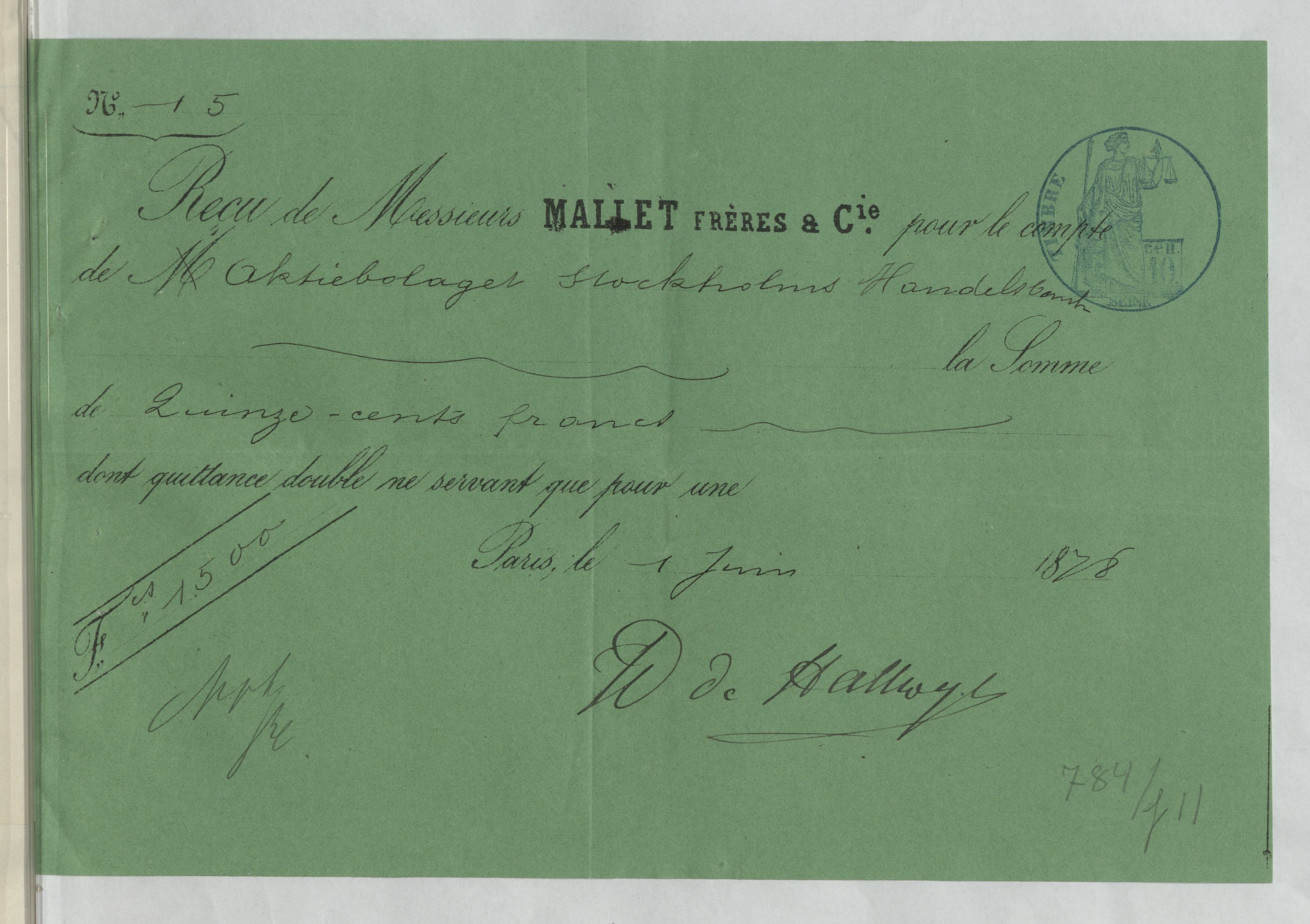 Kvitto från Aktiebolaget Stockholms Handelsbank rörande Mallet Frères & C:ie, Paris