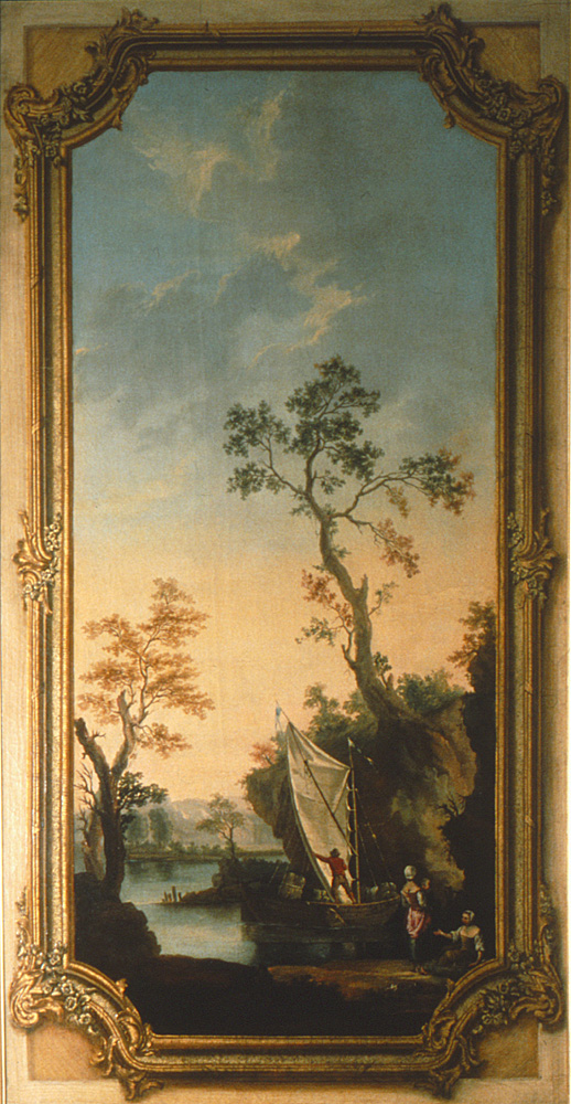 Flodlandskap med båt och figurer i aftonbelysning. Okänd konstnär. Ej sign.