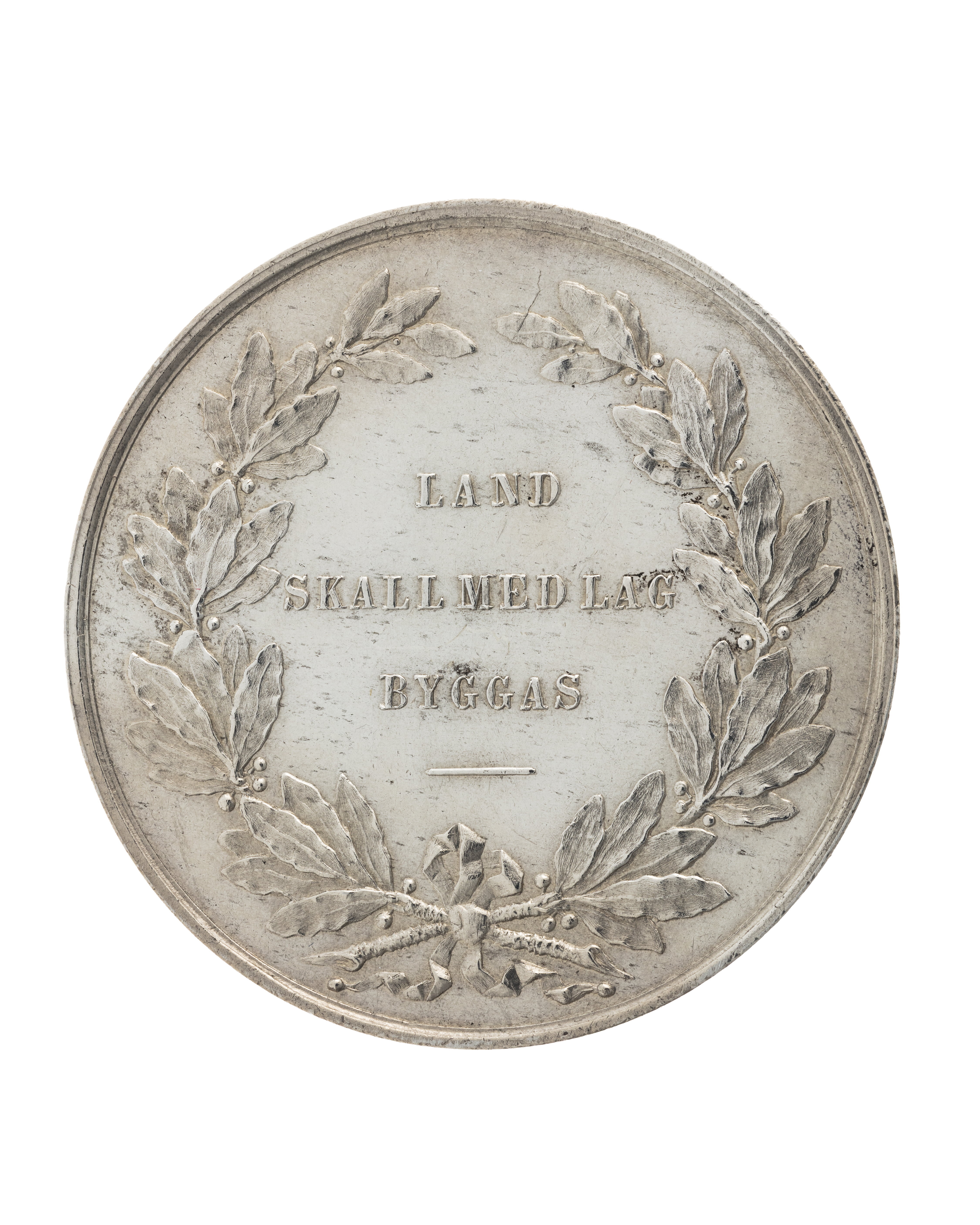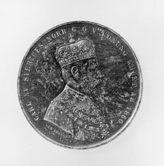 Kastpenning av silver, 7,5:e storleken, från konung Karl XV:s (1826-1872) kröning i Stockholms storkyrka 1860-05-03. Åtsida: Karl XV, bröstbild, profil h, skägg, kunglig krona, mantel, spetskrage, Nordstjärne-, Svärds- och Serafimerordens kedjor, Carl XIII:s ordenstecken om halsen, signatur vid avsnittet: "LEA AHLBORN", text: "CARL XV SVERIGES NORR. G. O. V. KONUNG KRÖNT ÅR 1860.". Frånsida: lagerkrans, text: "LAND // SKALL MED LAG // BYGGAS". Slät rand.