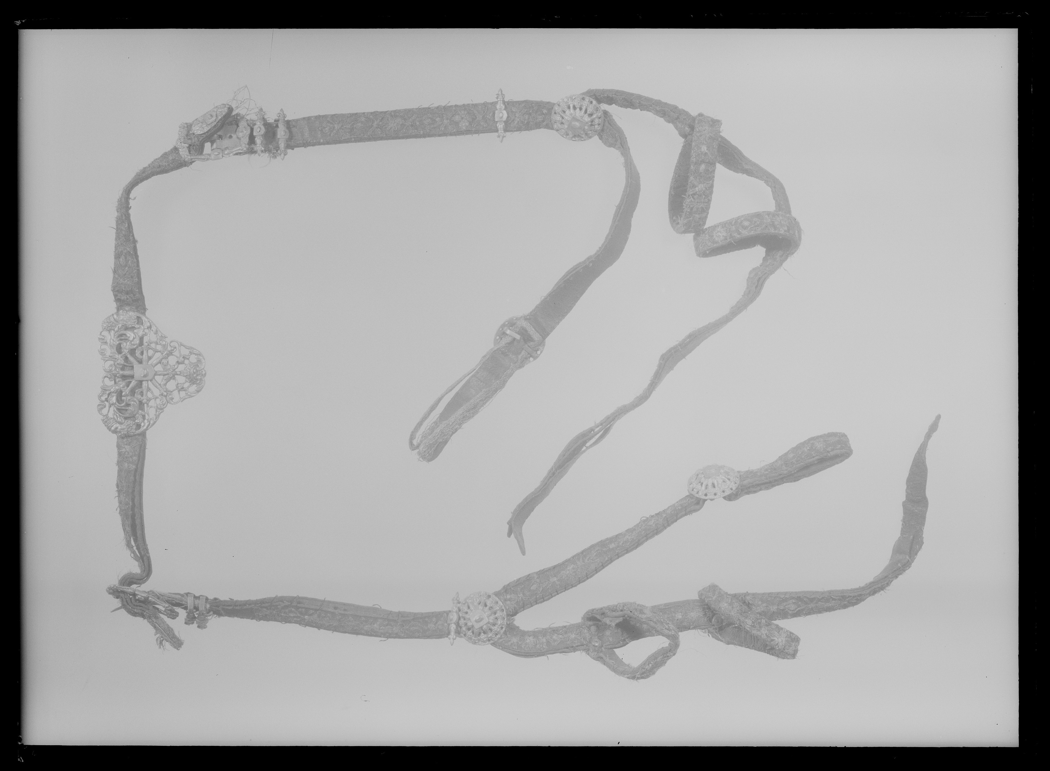 Hufwudstället och Tygelnäro af rödt saffian stickadt med guld samt guldgalon omkring; beslaget består i 50 (överstruket, tillskrivet 51) pucklor ohc söljor af förgyldt drifvet silfver samt 6 kedjor af dito för pannan.