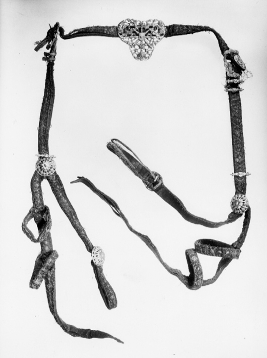 Hufvudstället med Tygeln af rödt Saffian stickat lika som Förbögeln med Guld, samt en Guldgalon omkring. Beslaget uti Pucklor och SÖljor, består af 53 stycken, däraf en nemligen den största plåten öfver NOsen sönder, hvilken är förgylt och at 6lödigt Silfver, arbete nätt drifvit, saamt 6 st Kedjor framför Pannan af samma Materia /:3 Söljor feltes 1803:/