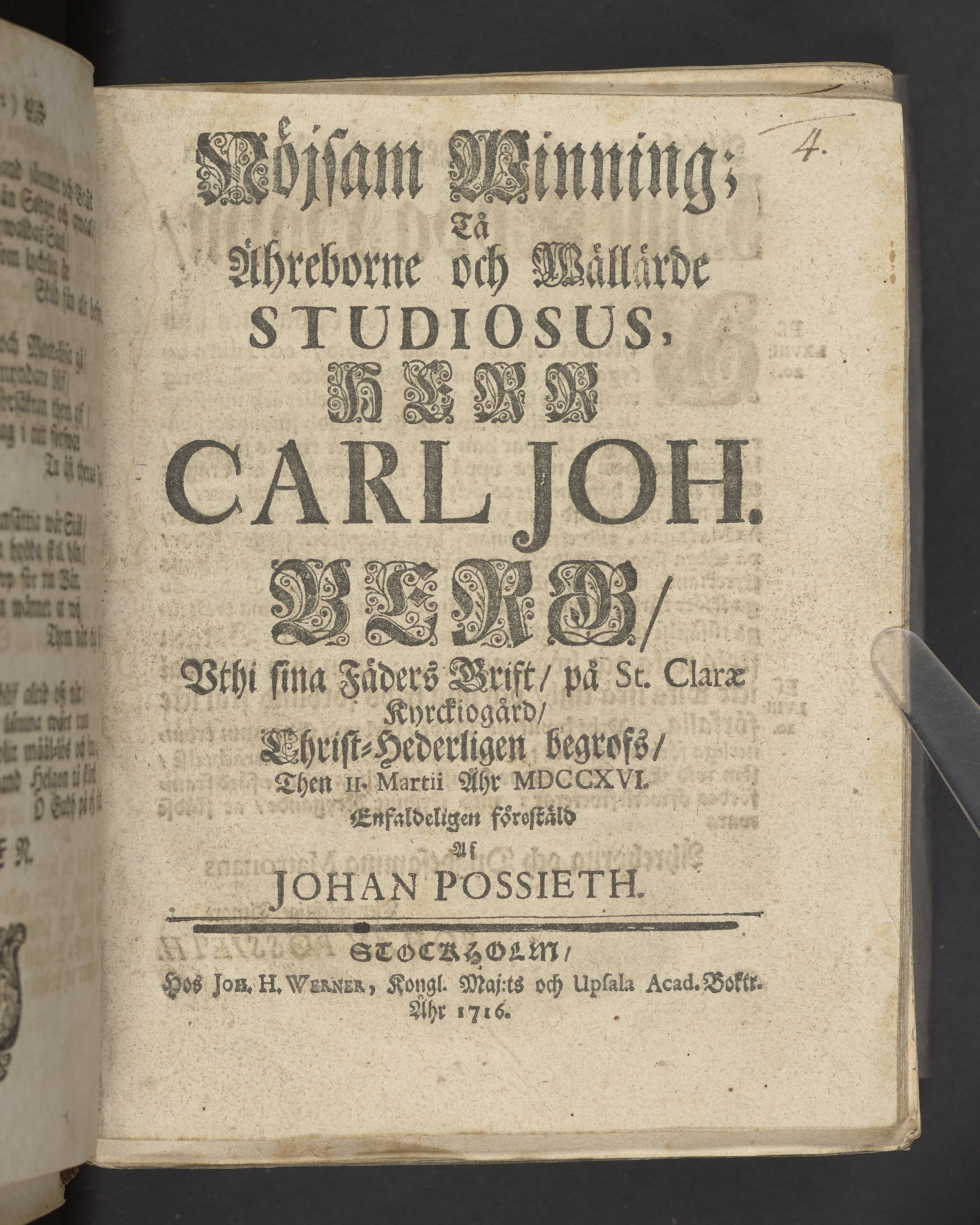 Nöjsam winning; tå ähreborne och wällärde studiosus, herr Carl Joh. Berg, vthi sina fäders grift, på St. Claræ kyrckiogård, christ-hederligen begrofs, then 11. martii åhr MDCCXVI. Enfaldeligen förestäld af Johan Possieth. Stockholm, hos Joh. H. Werner, kongl. maj:ts och Upsala acad. boktr. åhr 1716.