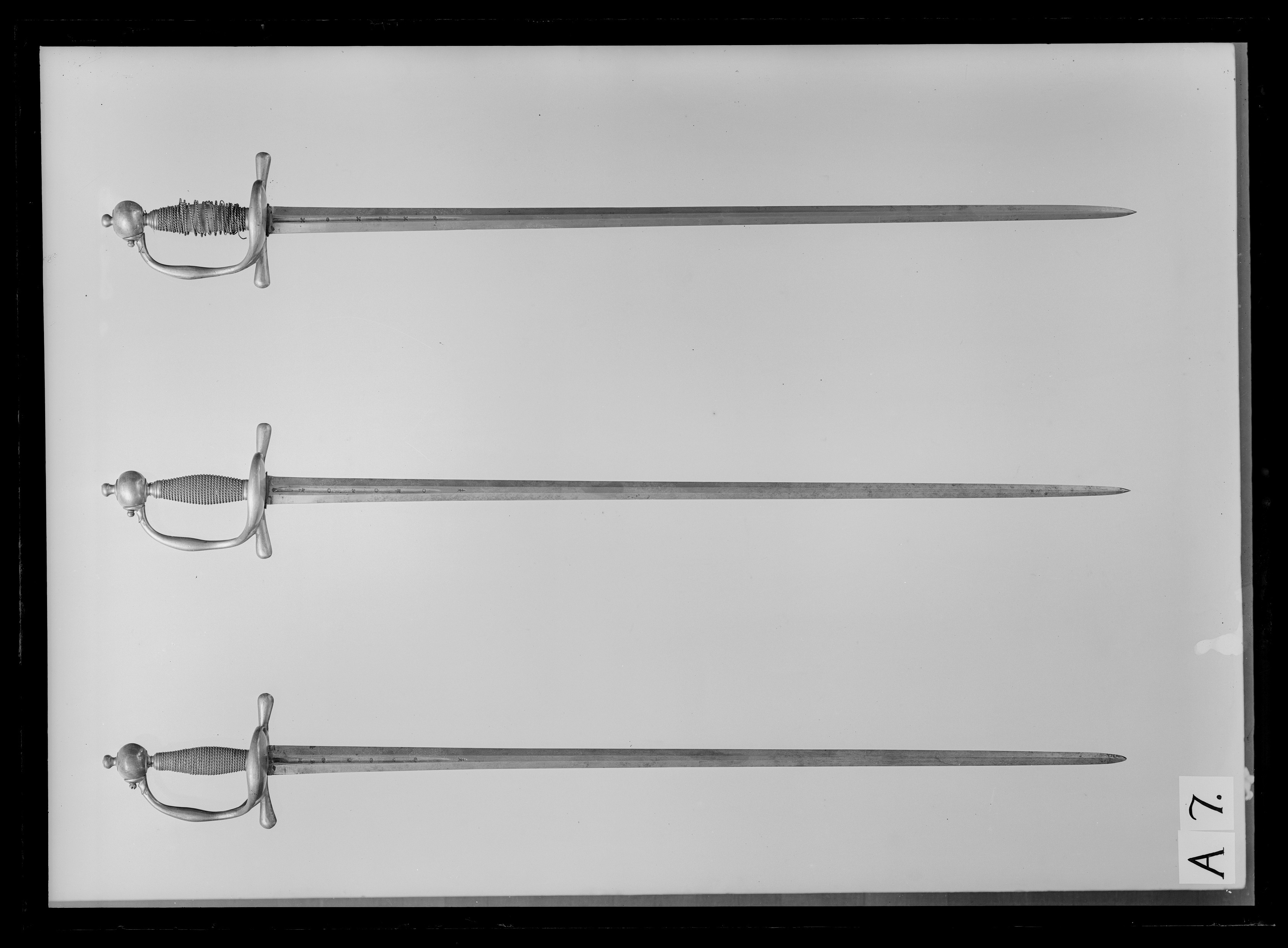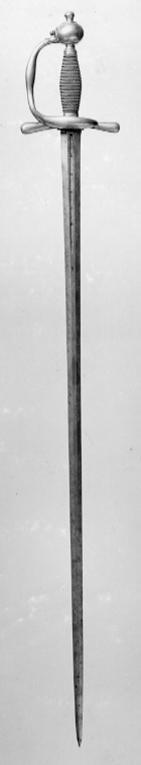 Sverige, Klinga Vira bruk. Modellenlig. Mässingsfäste och proberstämplad klinga. Upptill på handbygelns utsida svärdfejare (gelbgjutare) stämpel: " L " i kvadratiskt fält. På insidan av främre parerstångens ytterände stämpel i form av en öppen krona. Proberstämpeln P ej synlig vid klingans bas. (sannolikt inslagen högre upp på tången).