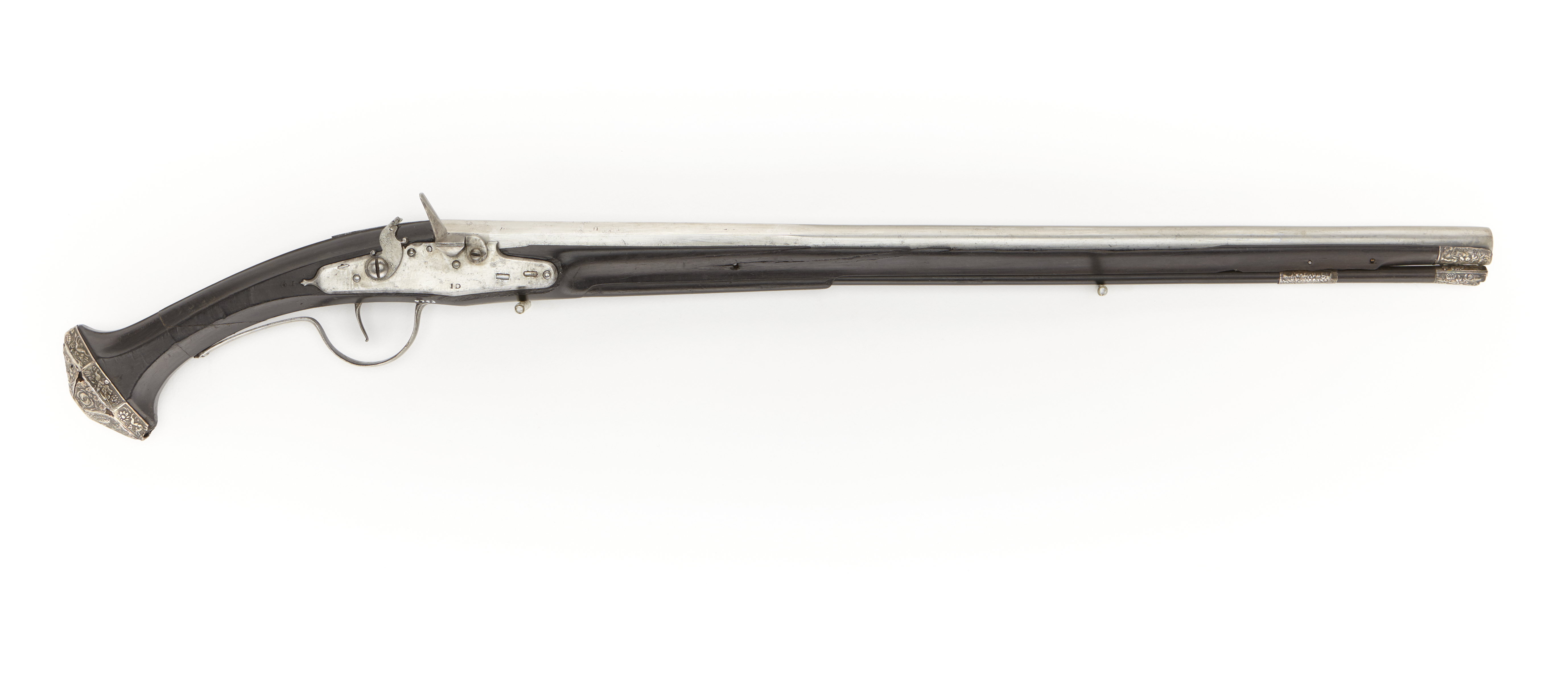 Rund, över kammaren åttkantig, slätborrad pipa. På kammaren finns en nött stämpel: "CE" eller "CD" under en stjärna. Två piphäften. Flintlås. Plant låsbleck med fasade kanter, baktill avslutat i en liten spets. Platt hane, avbruten på halsen. Invändig eldstålsfjäder. Blecket är stämplat: "ID" (Stöckel nr 3265, Holland?, c. 1625). Nöt utan studel. Hel stock av svärtad ebenholts. Sexkantig kolvkappa av pressad silverplåt. Kolvhalsen har på sidorna en längsgående, något upphöjd, tillplattad del. Två låsskrivar. Pipstift. Näsband och rörka av pressad silverplåt. Fransk, skålformig varbygel. Tillbehör: Laddstock med doppsko av pressat silver. Märkt: 61 bakom låsblecket, stanstyp 5376.
