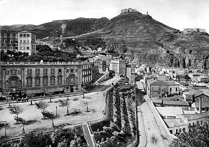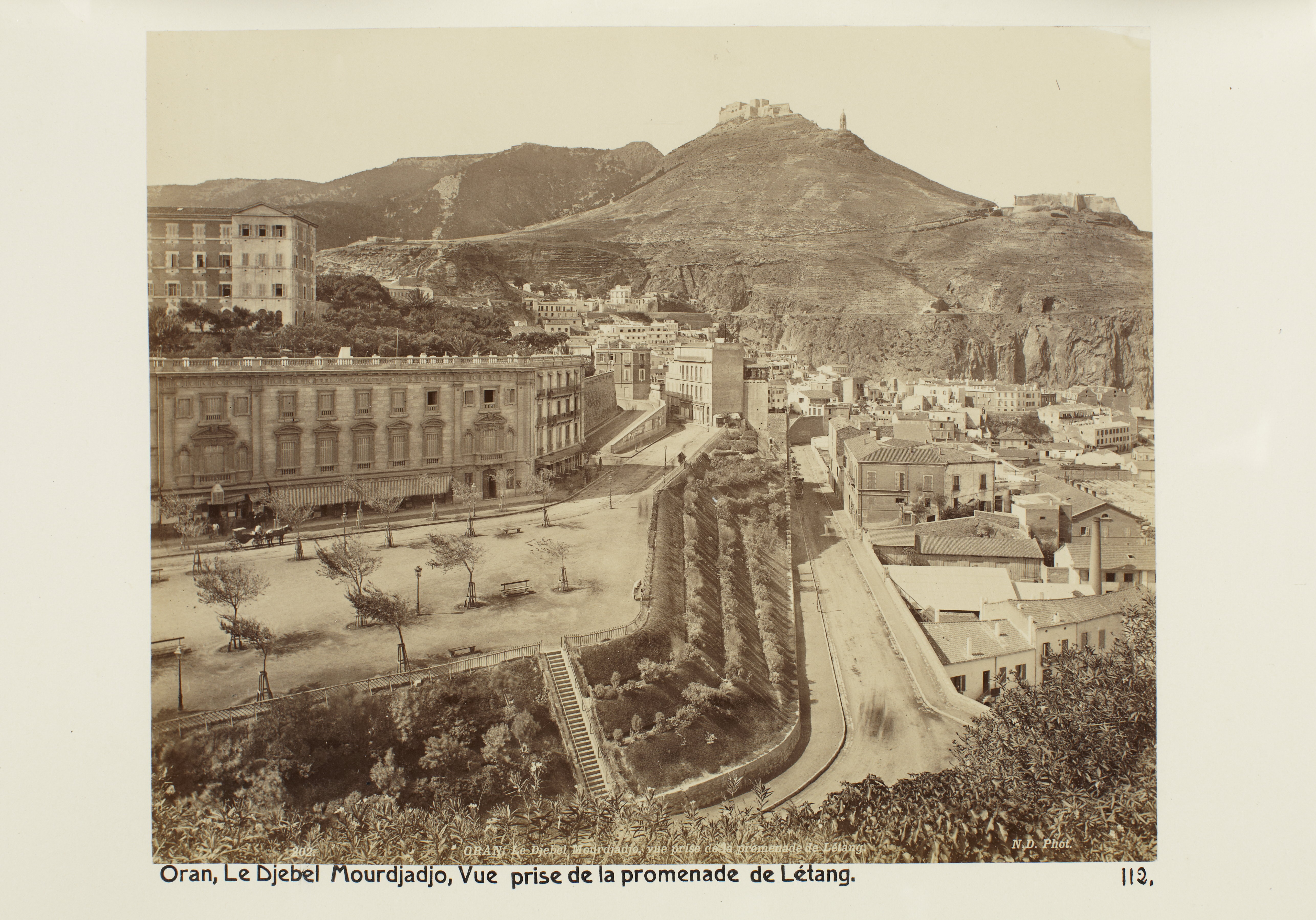 ORAN, Algeriet. Le djebel Mourdjadjo. Vy från dammpromenaden. Foto från resa genom Algeriet och Tunisien samt åter över Schweiz, 11 februari - 19 maj 1889. Samtliga foton i gruppen LXVI:F. är inköpta av Wilhelmina von Hallwyl i Alger, Biskra, Tunis, Constantine, Oran och Blidah vid hennes vistelse i nämnda städer tillsammans med sin make, Walther von Hallwyl, sin mor, Johanna Kempe, f. Wallis, dottern Irma samt fröknarna Caroline Pflaum och Ida Uhse. Uppgifterna kommer från fröken Ida Uhses reseanteckningar.