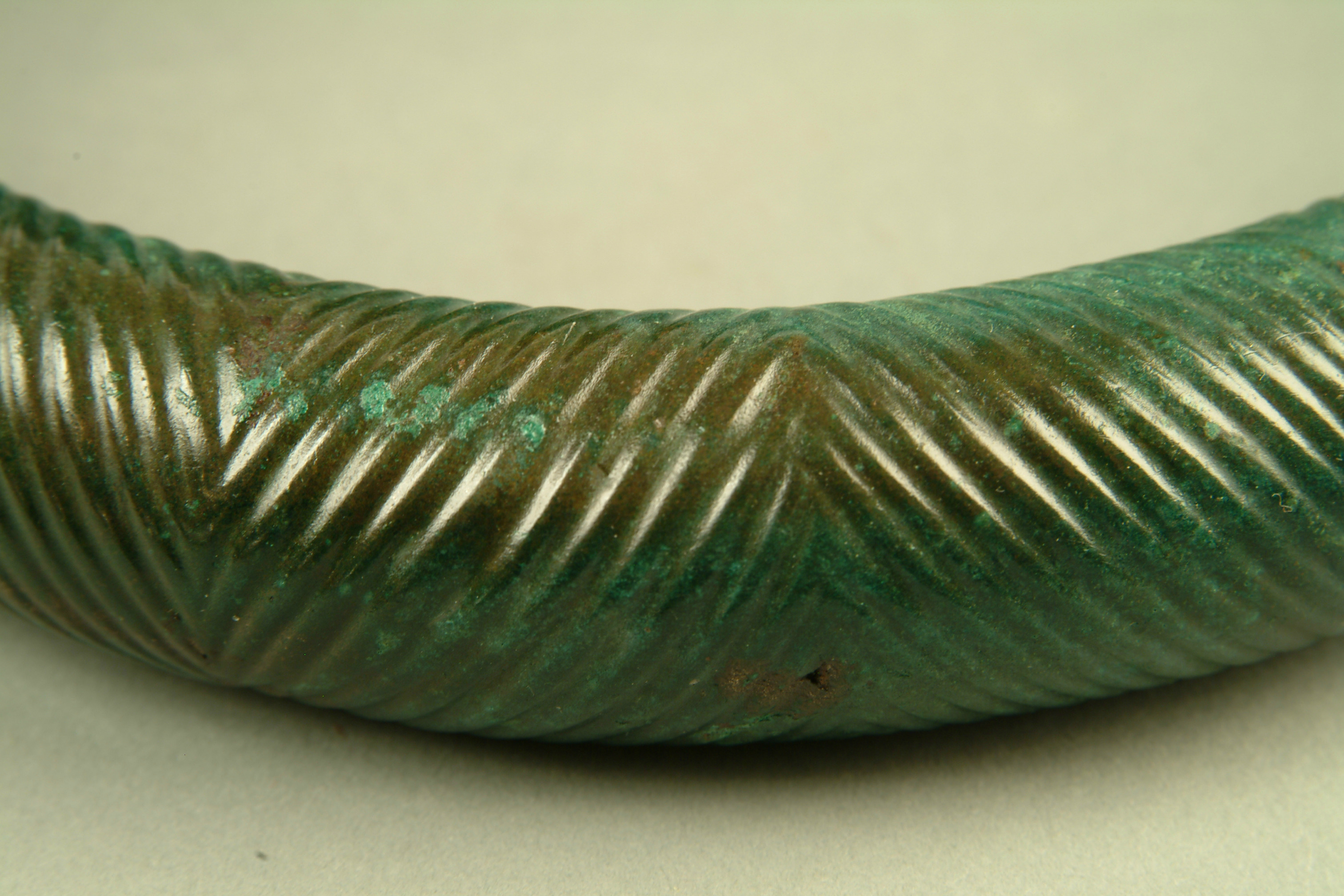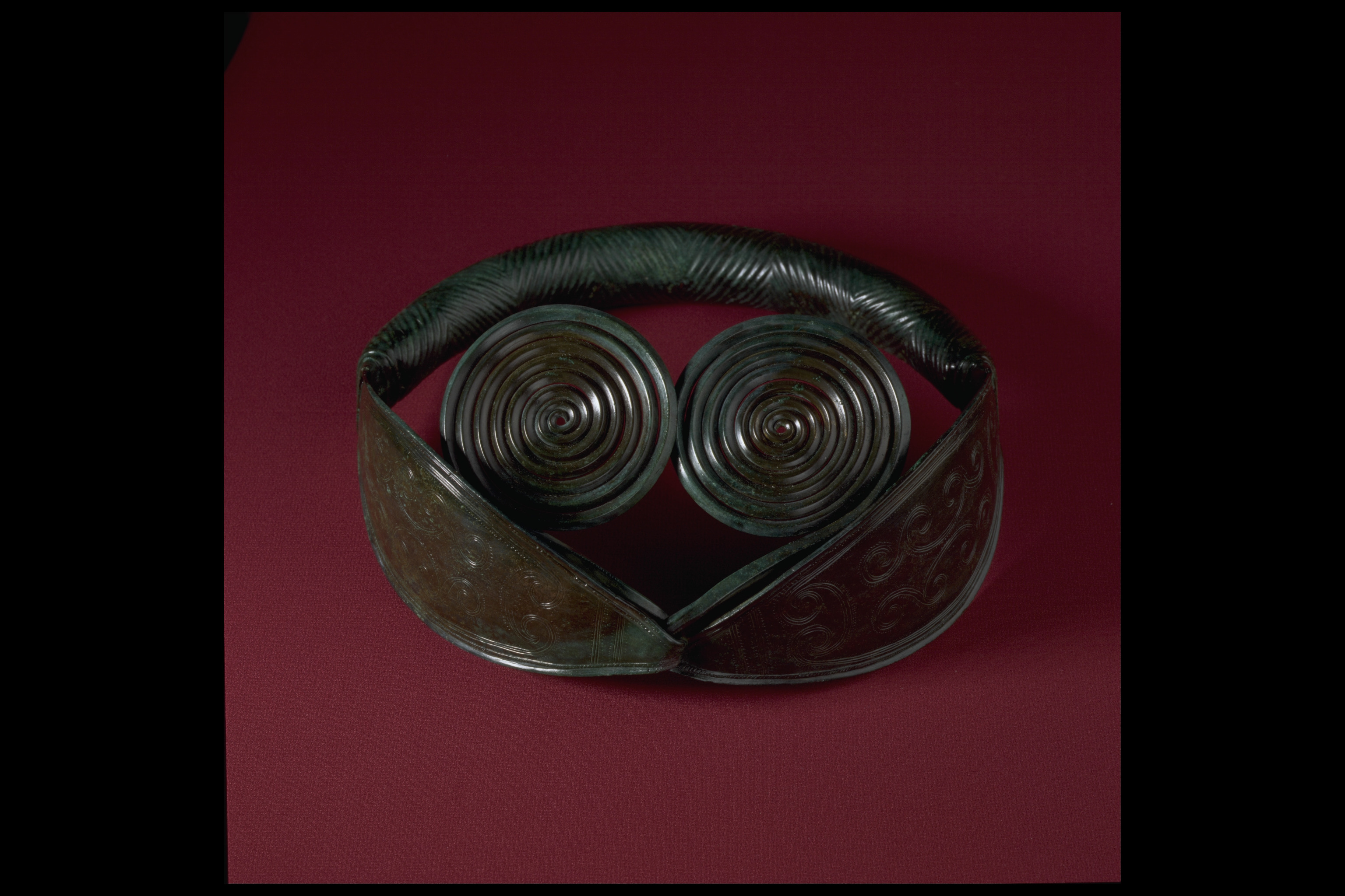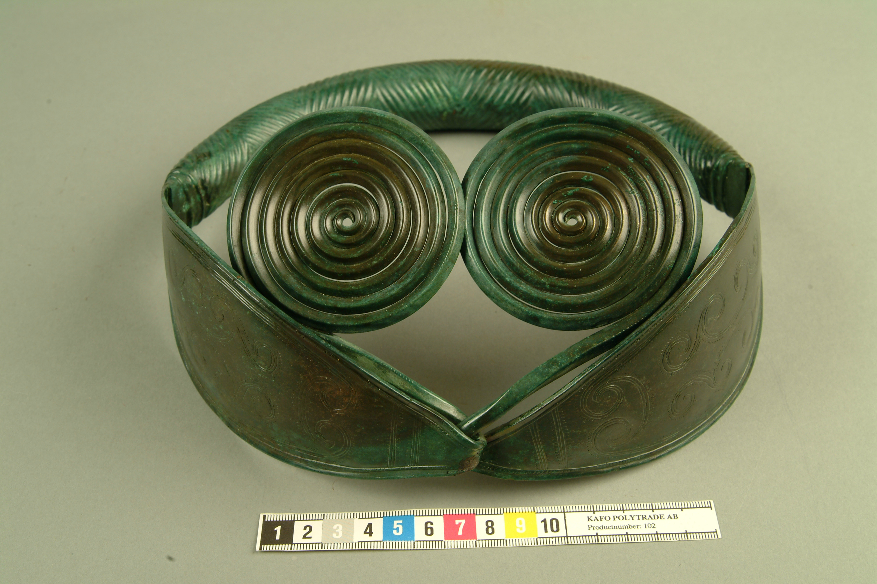 Halsring i brons med fastsittande spiraler. Halva ringen är trind och ihålig, snedräfflad åt två håll medan den andra hälften består av två med inpassade ornamentprydda breda skivor, som slutar i stora spiraler upprullade tenar. Dessa har böjts ned inåt ringen.