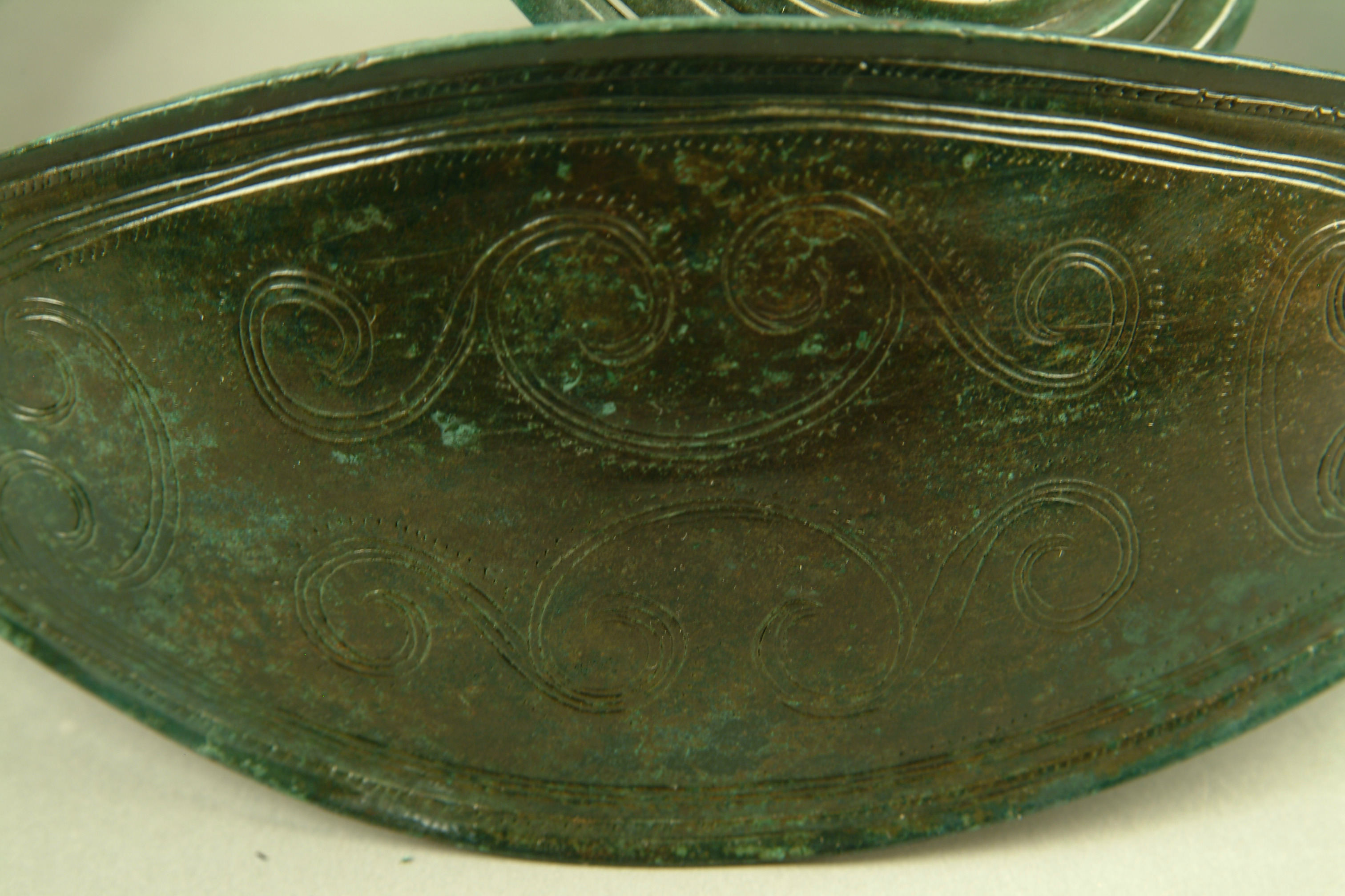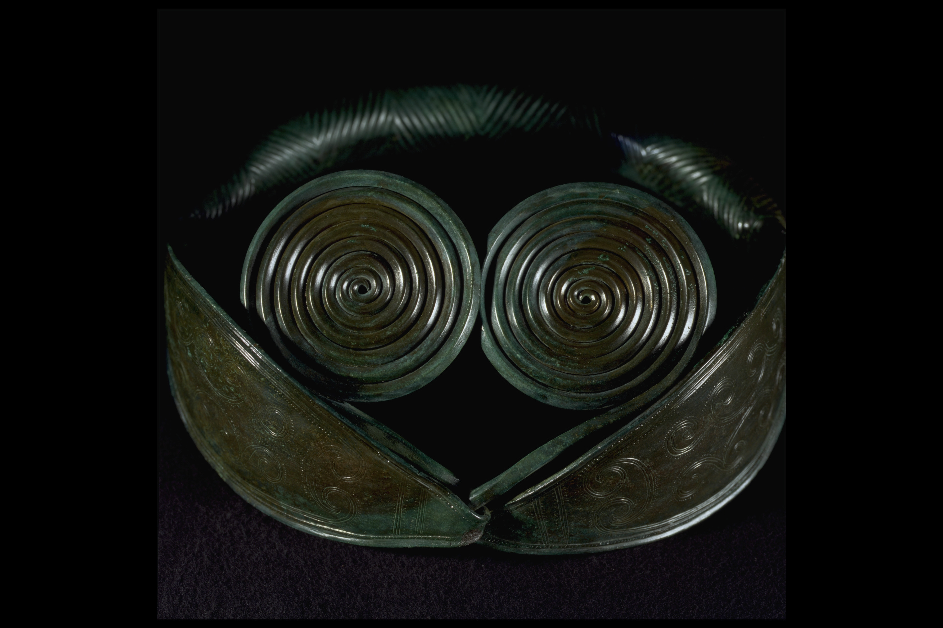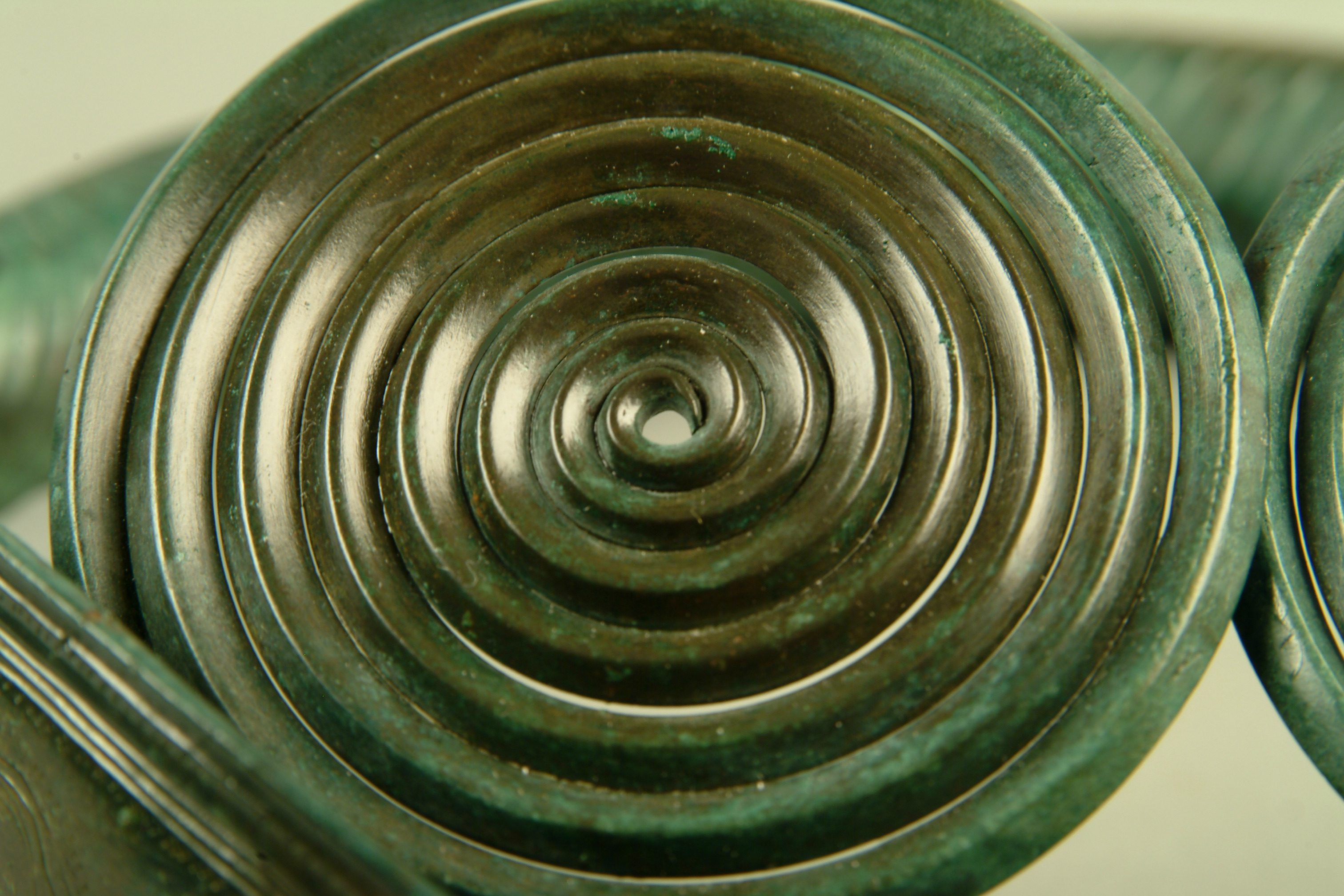 Halsring i brons med fastsittande spiraler. Halva ringen är trind och ihålig, snedräfflad åt två håll medan den andra hälften består av två med inpassade ornamentprydda breda skivor, som slutar i stora spiraler upprullade tenar. Dessa har böjts ned inåt ringen.