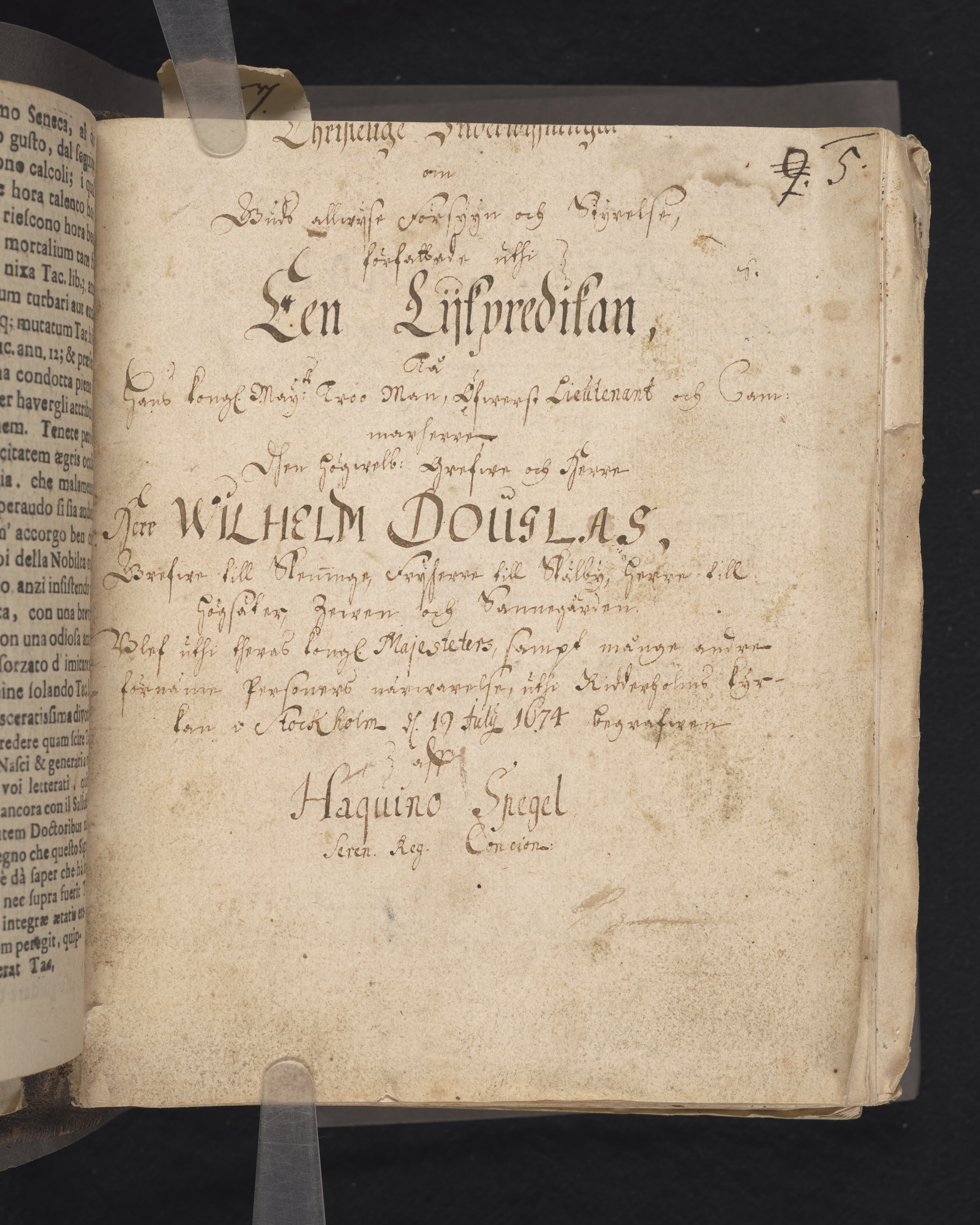 Christelige vnderwijsningar om Gudz allwijse försyyn och styrelse, författade vthieen lijkprädikan, tå ... öfwerst lieutenant och cammarherre ... grefwe ... Wilhelm Douglas, ... bleff ...vthi Ridderholms-Kyrckian i Stockholm den 19. julij 1674 begrafwen aff Haquino Spegel... [Avskrift]
