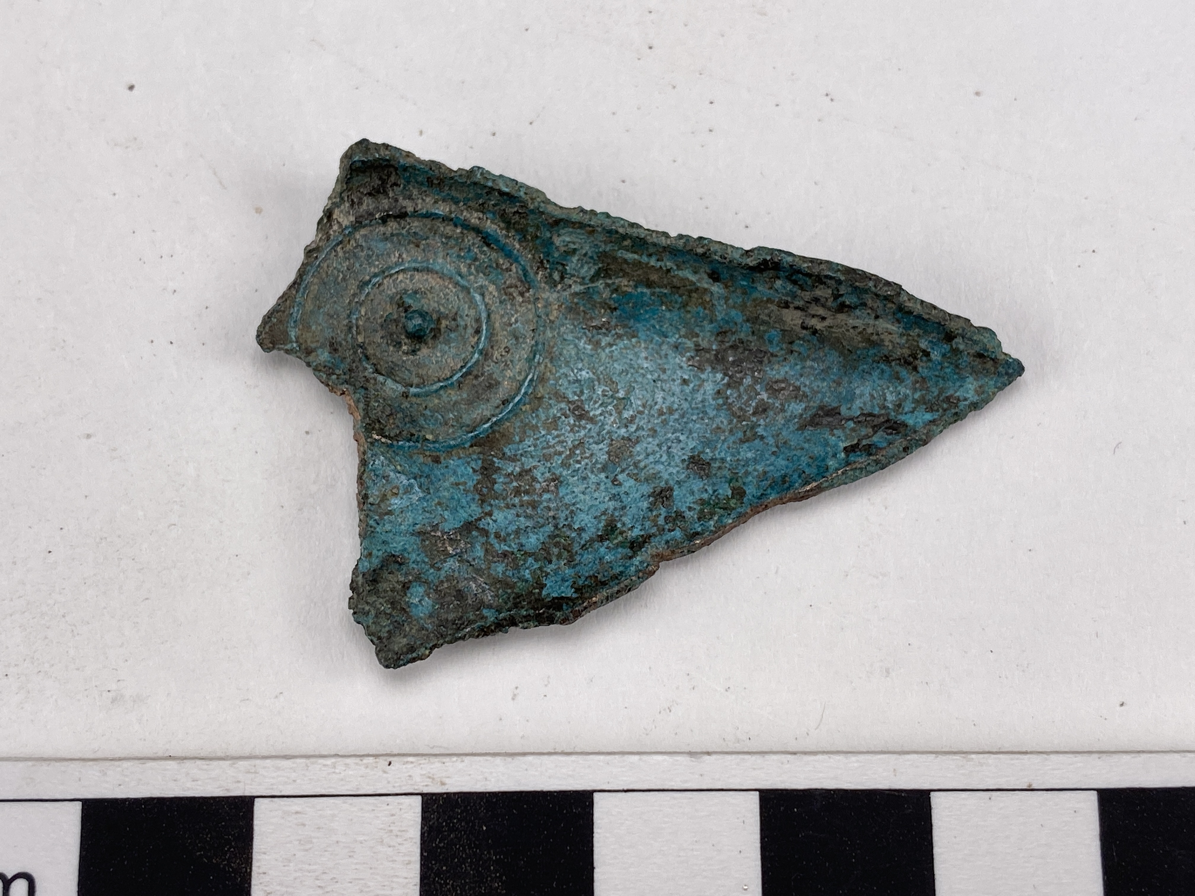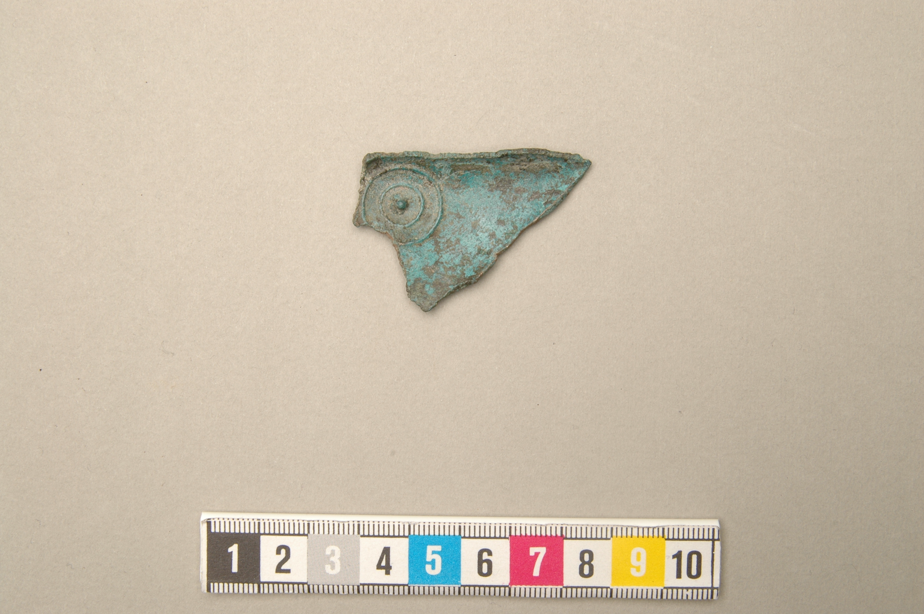 Bronsfragment med en ornering av upphöjda koncentriska ringar, möjligen tillhörande en bälteskål.