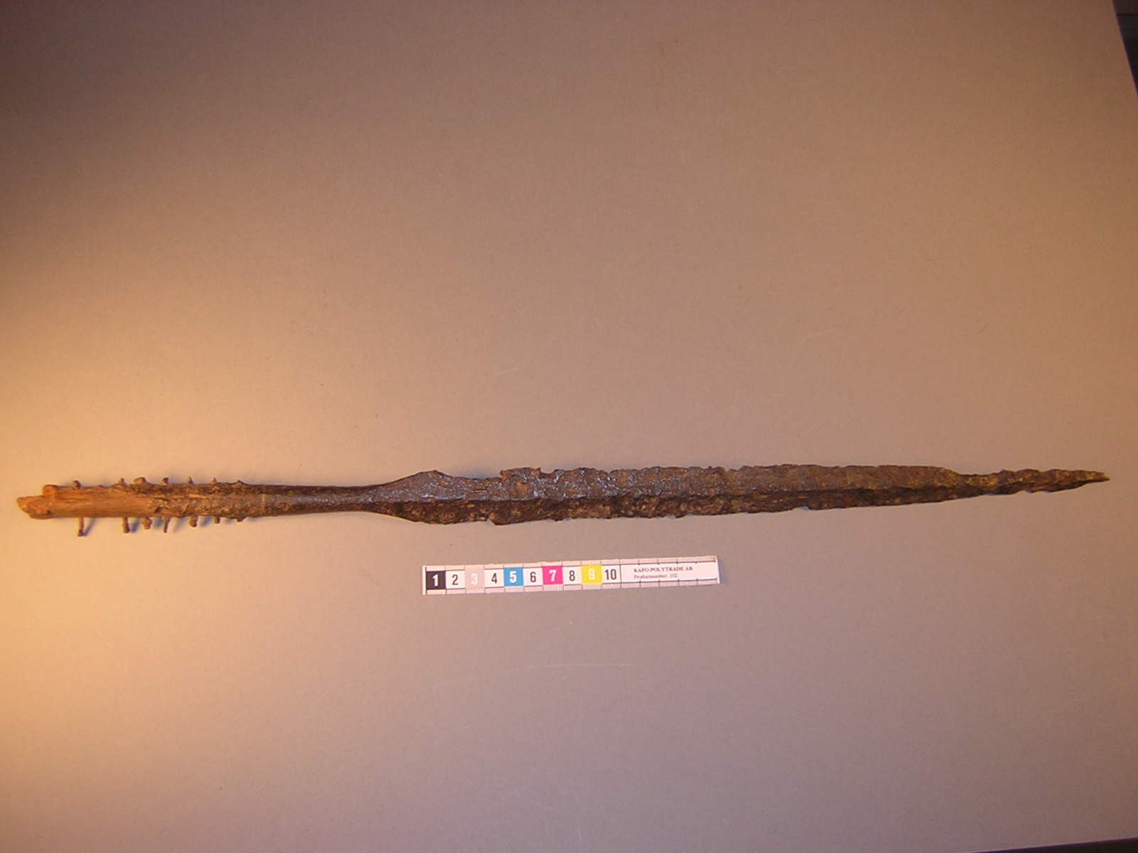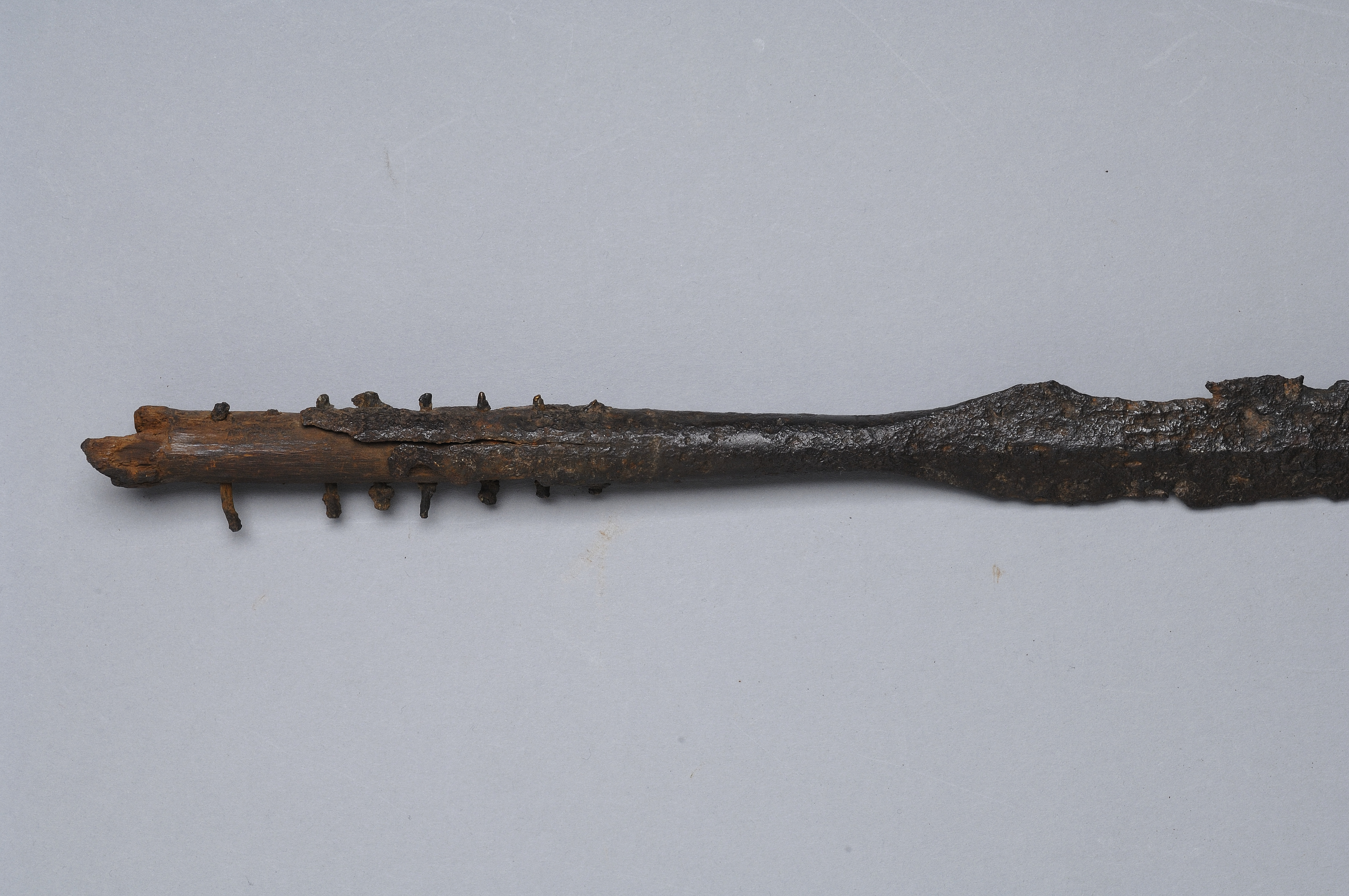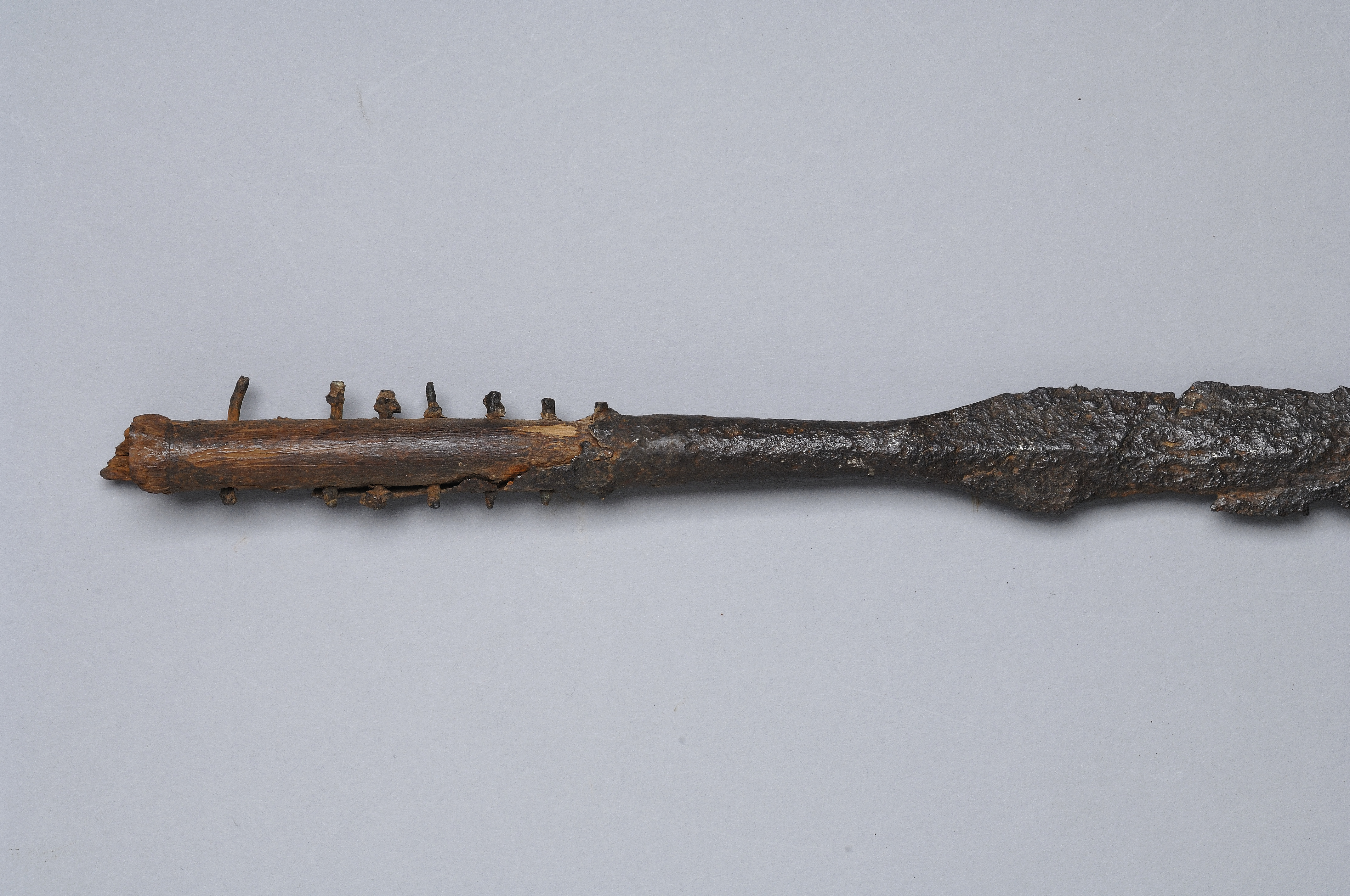 Långsmal spjutspets med 8 genomgående skaftnitar av brons.