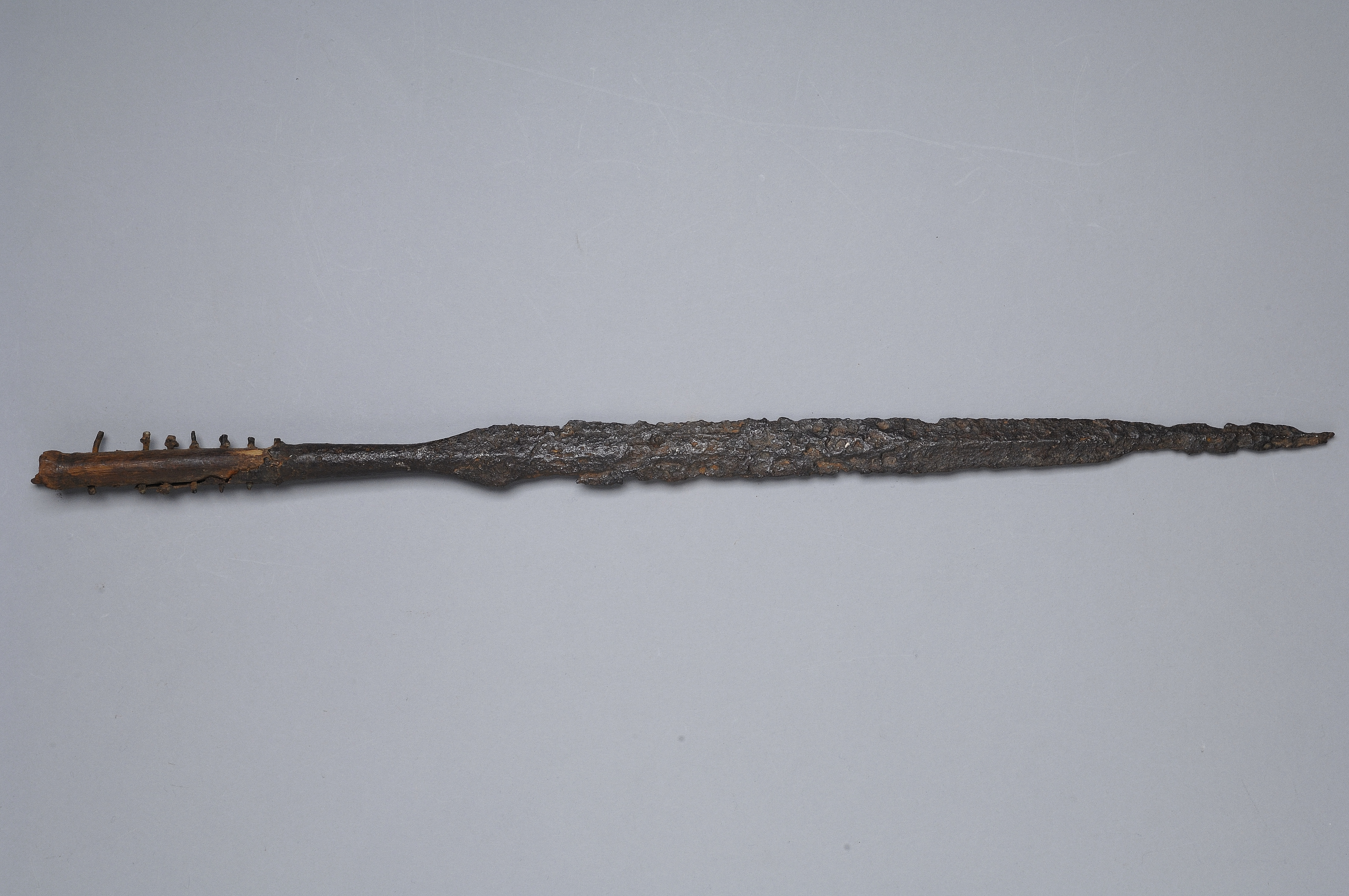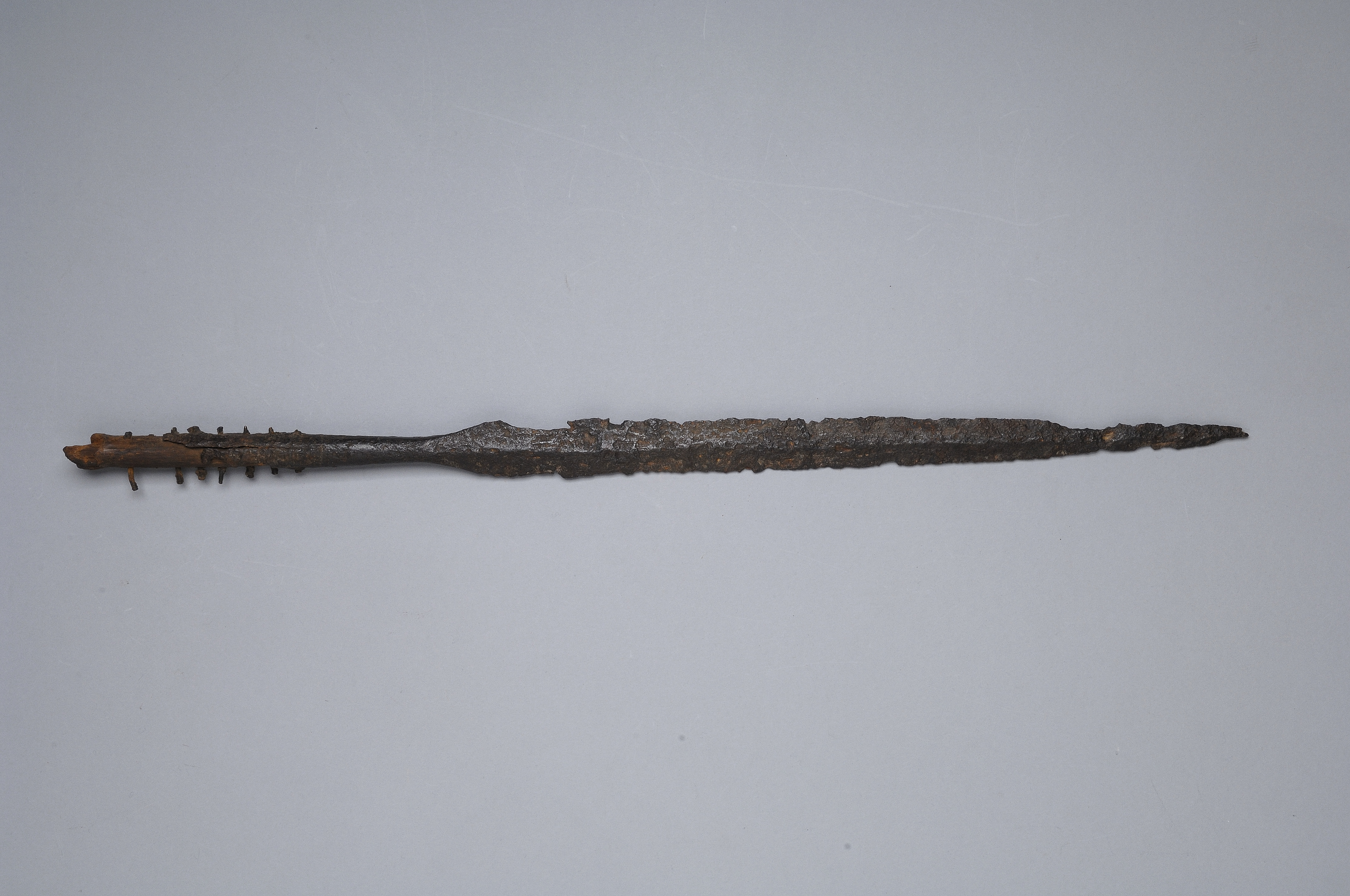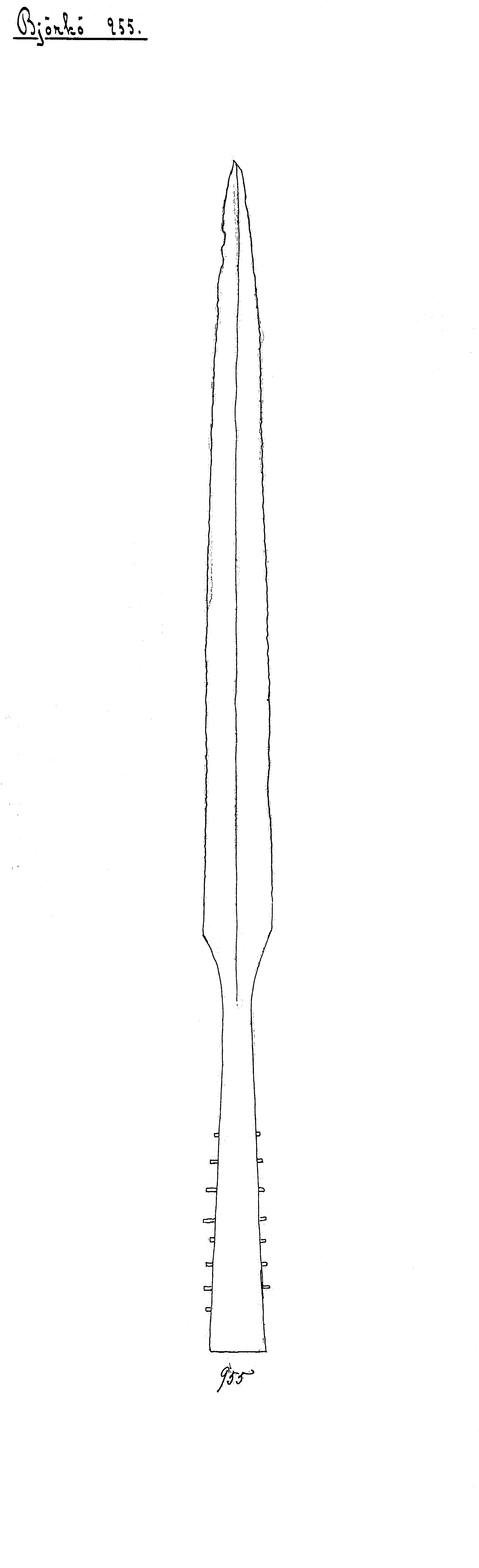 Långsmal spjutspets med 8 genomgående skaftnitar av brons.
