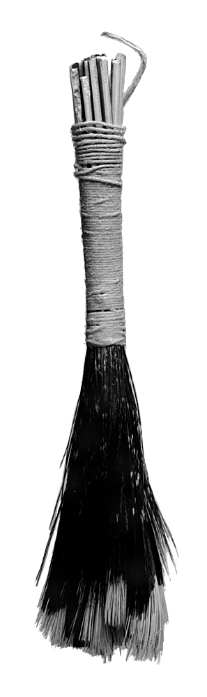VISP Av fågelpennor. Fanet svartbrunt, med vita toppar, spolarna vitgrå samt sammanhållna med en tät lindning av tvinnad hamptråd. Längd: omkring 17 cm. Använd vid påpensling av äggvita.