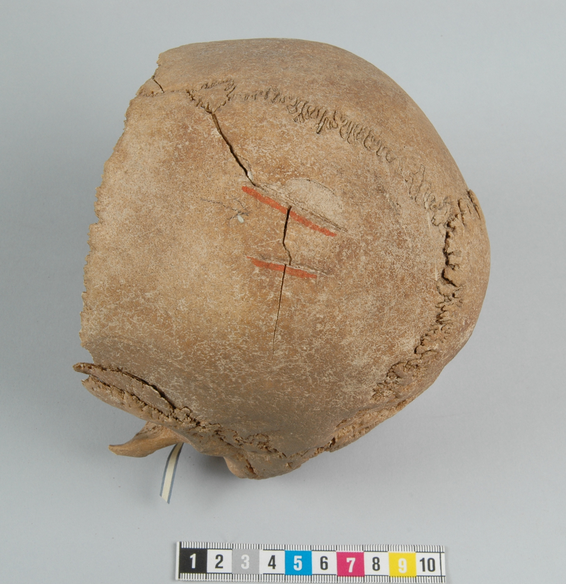 Kranium med två oläkta huggskador och en spricka i vänster hjässben. Även ett suturalben i sutura sagittalis, flera i sutura lambdoidea och uppdelning av vänster tinningben (squama temporalis partita).
