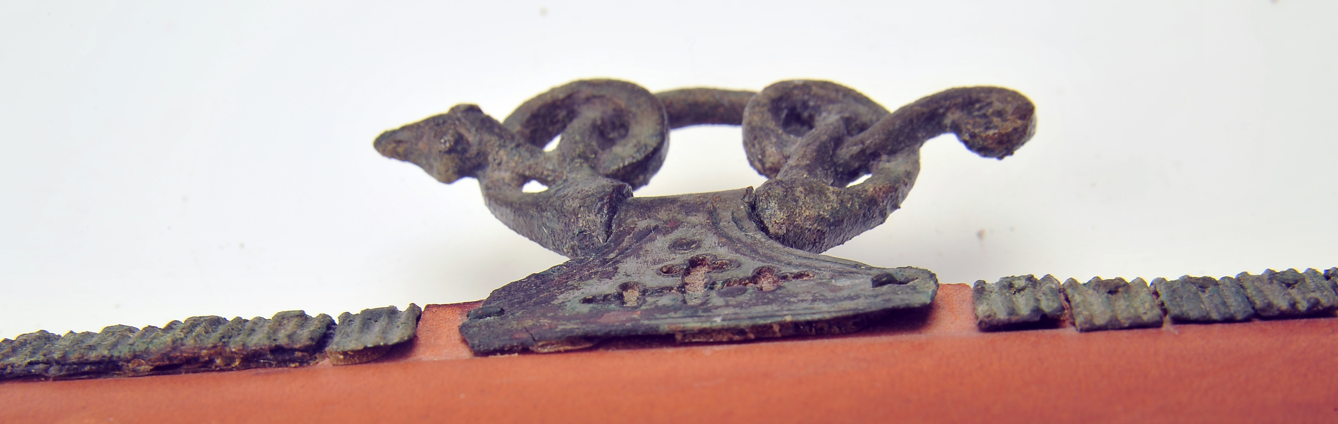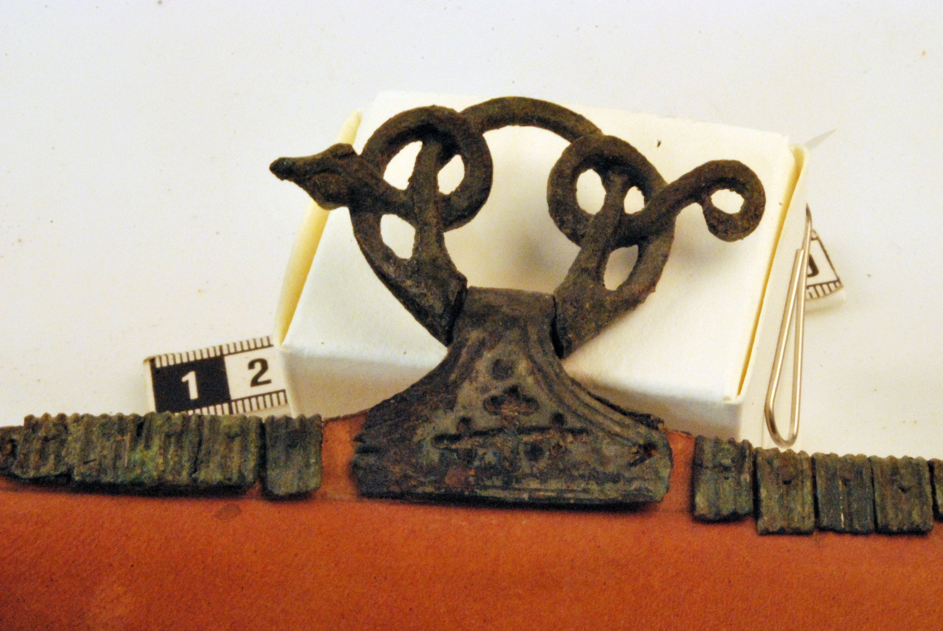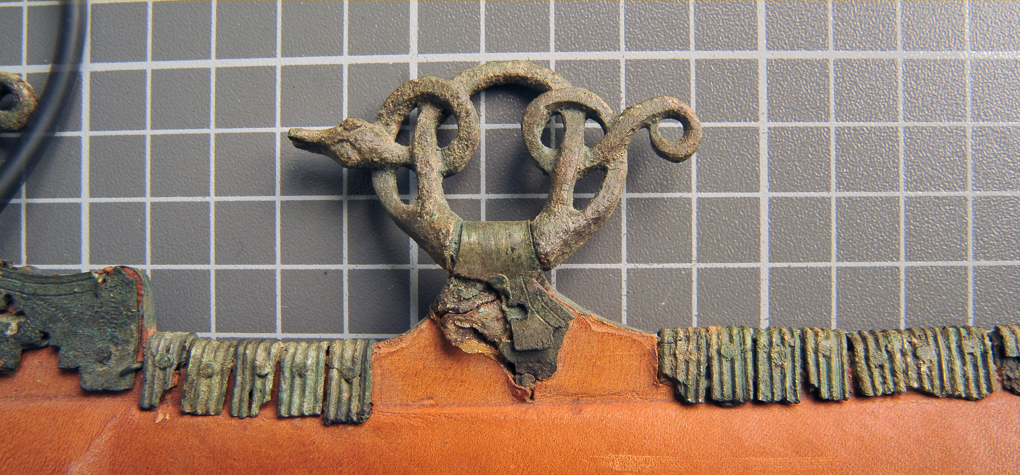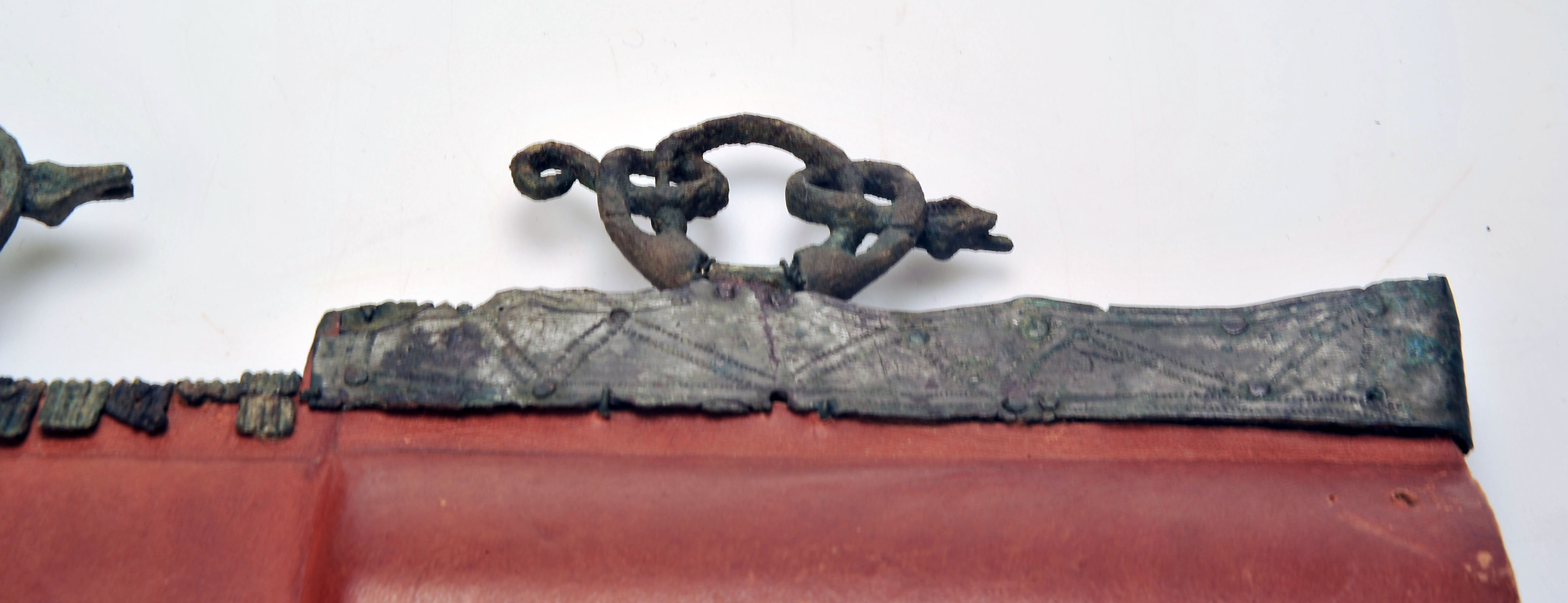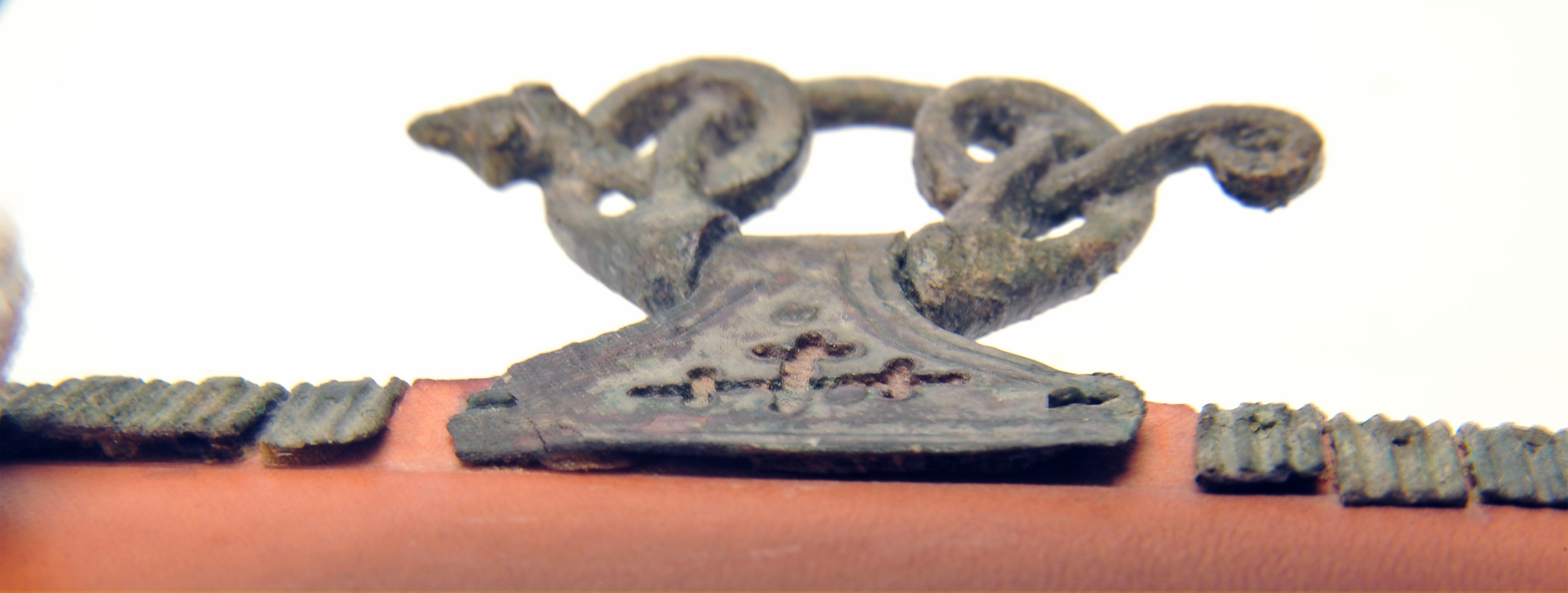 Kantbeslag och doppsko monterade på en rekonstruktion av läderslidan.