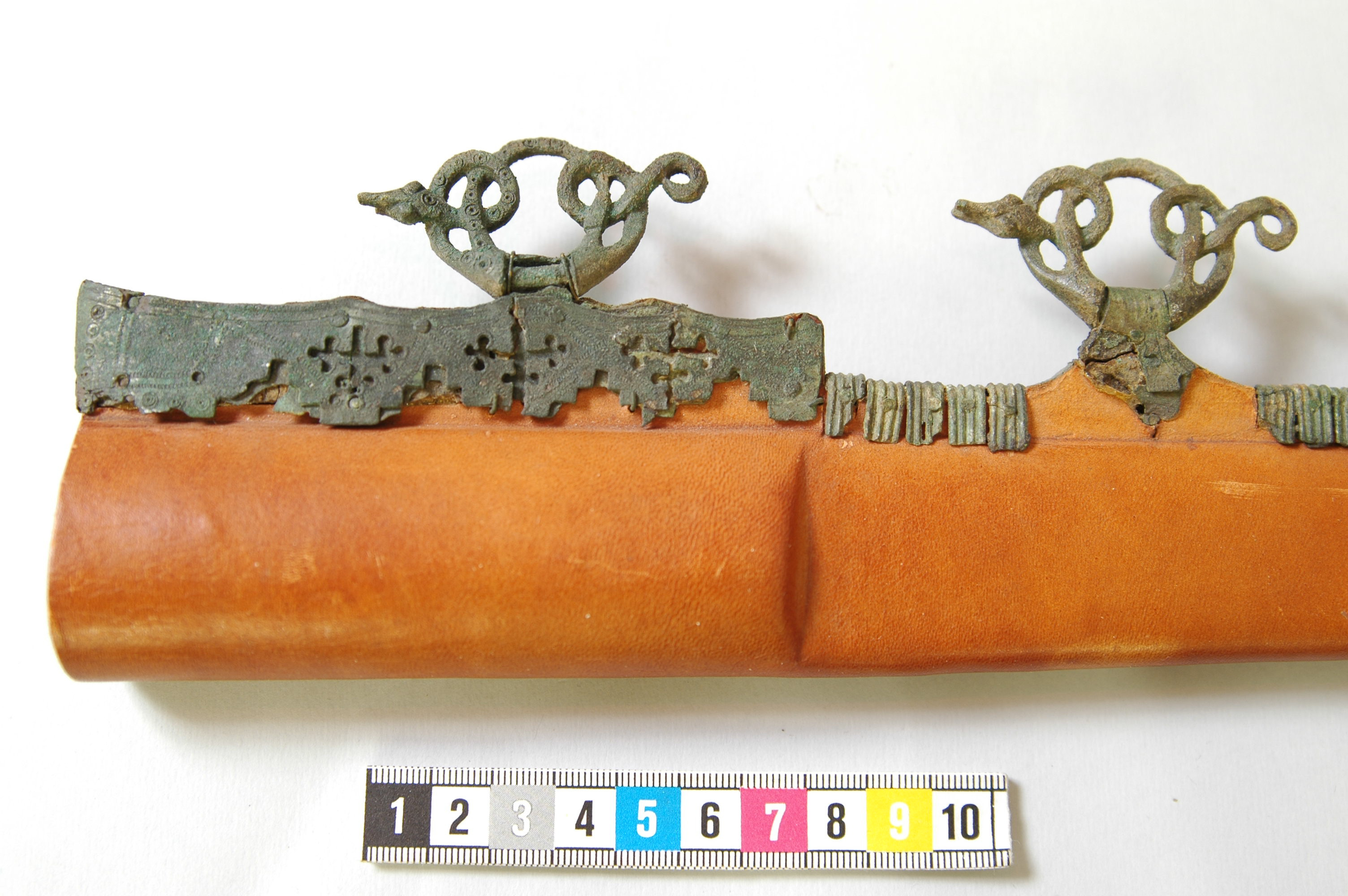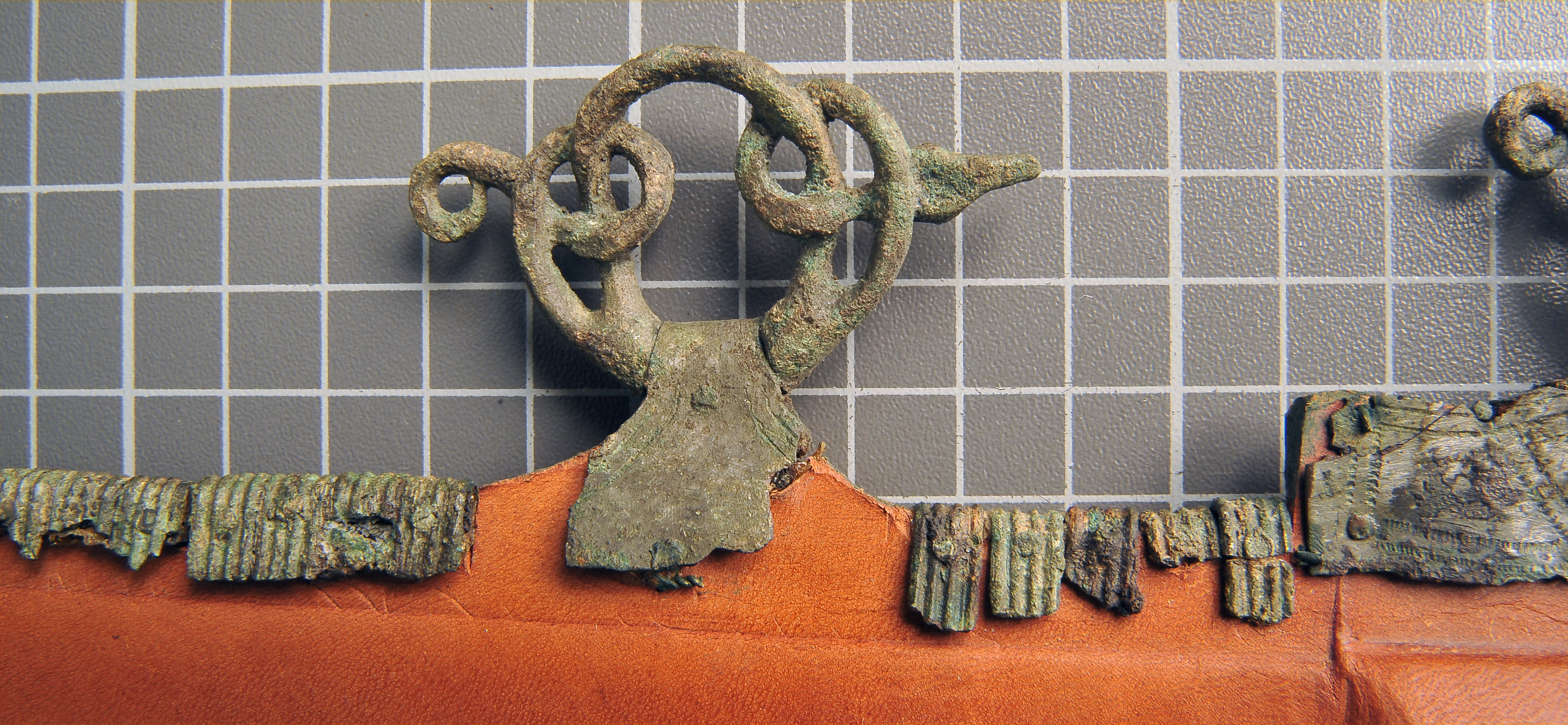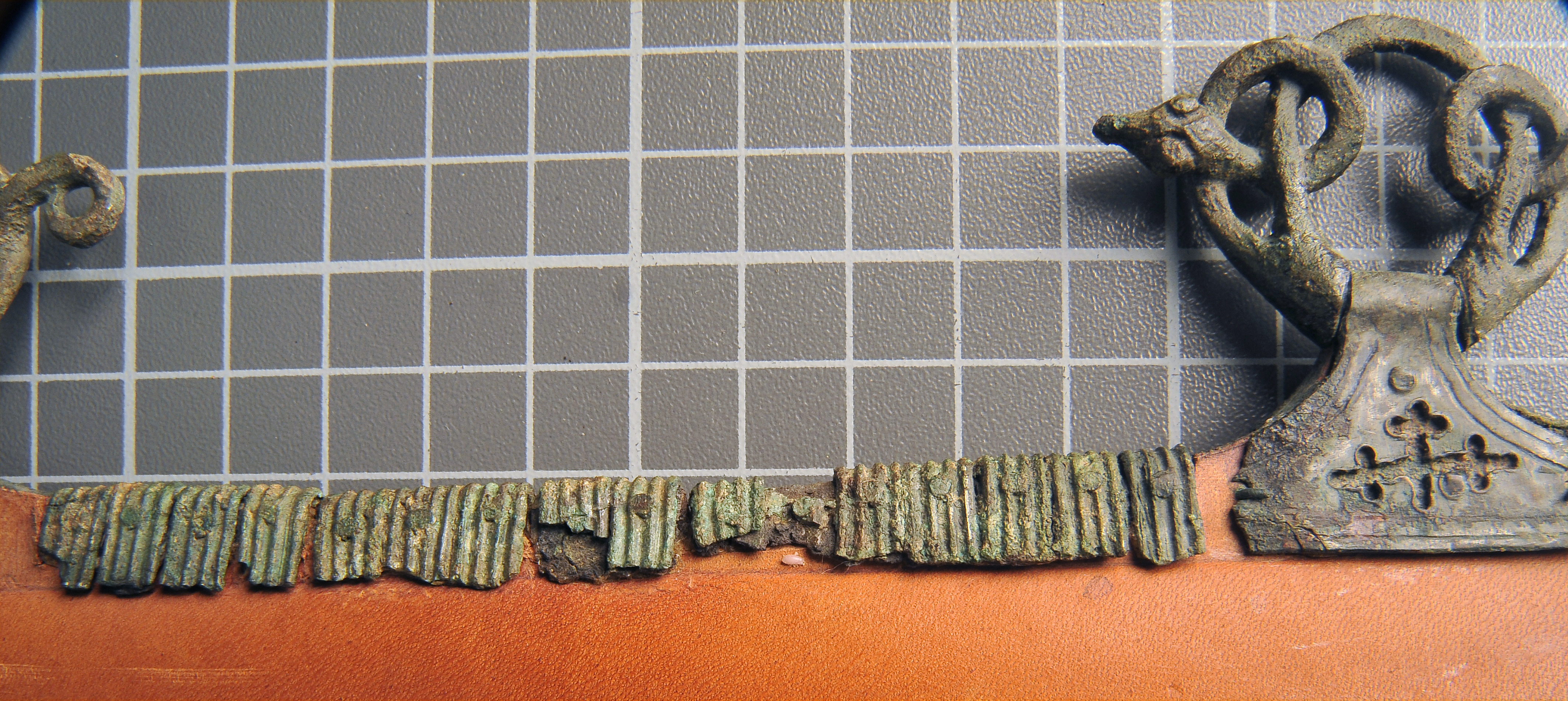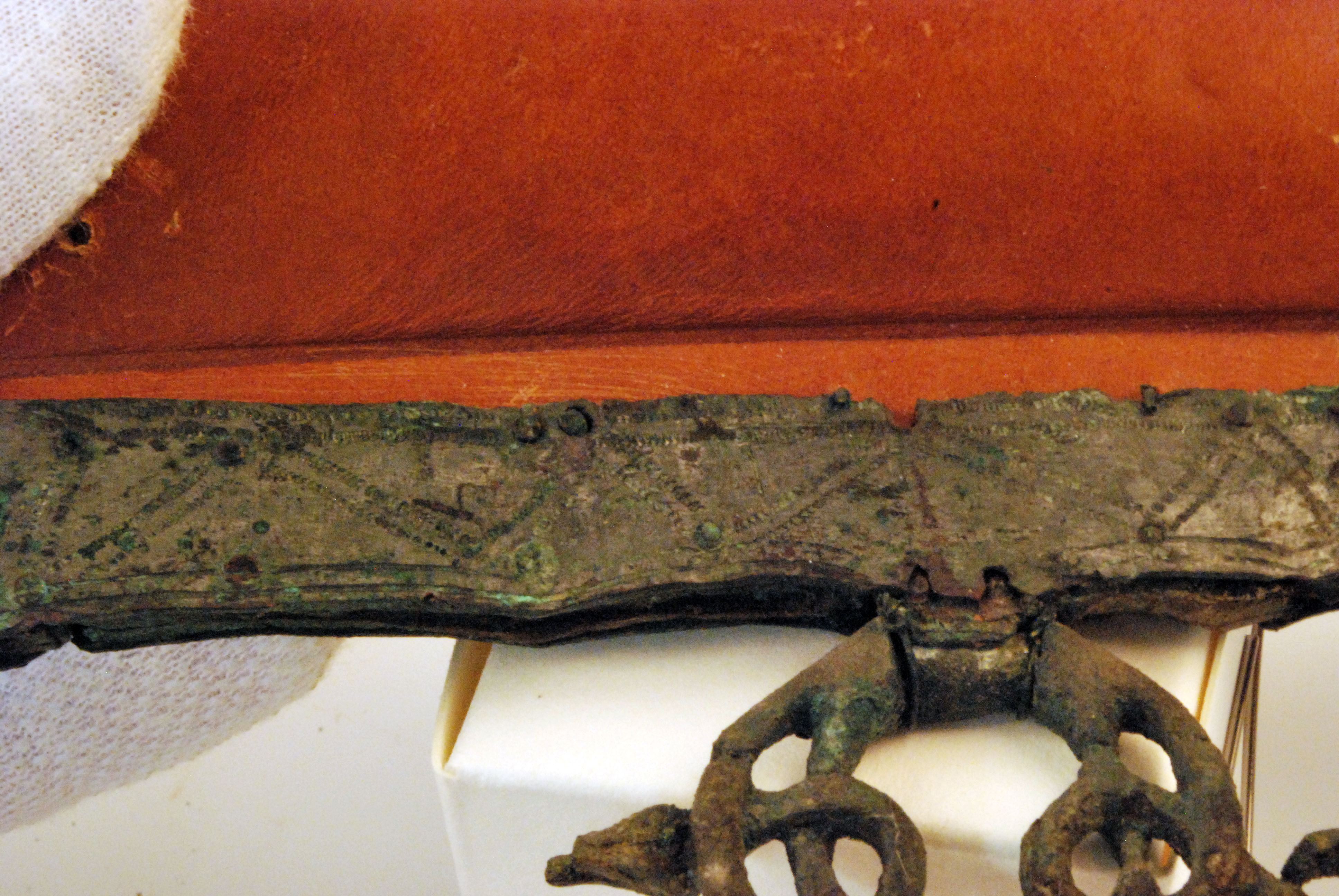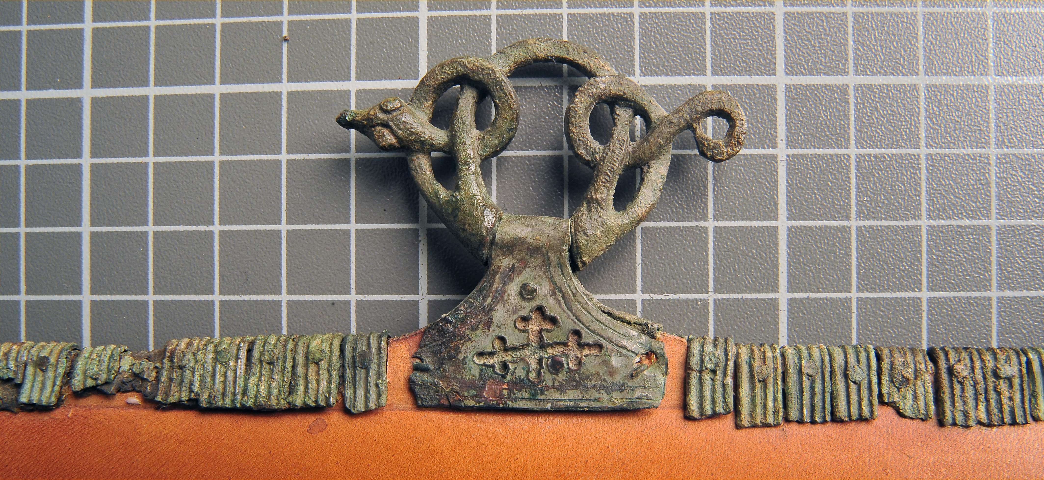 Kantbeslag och doppsko monterade på en rekonstruktion av läderslidan.