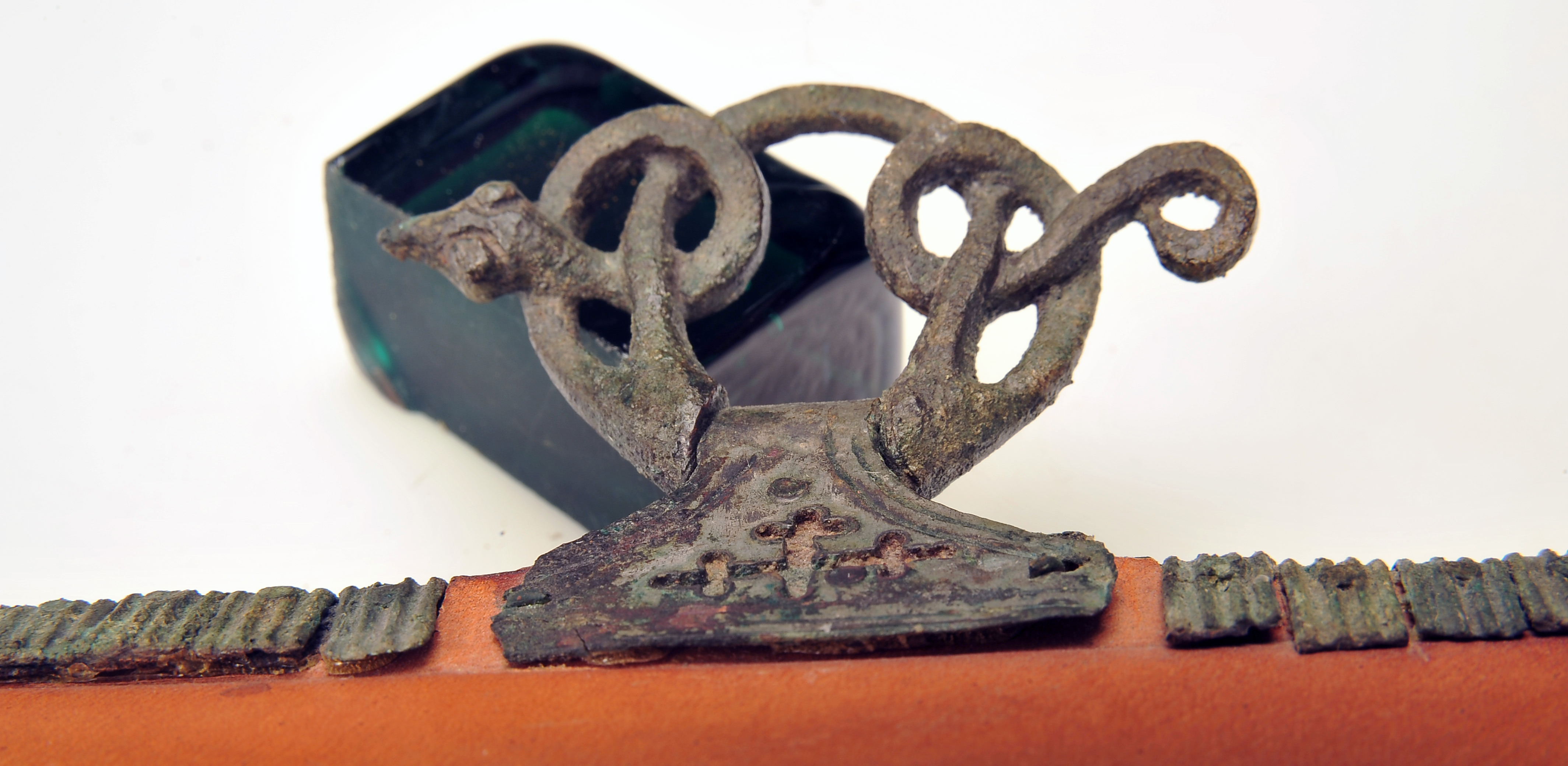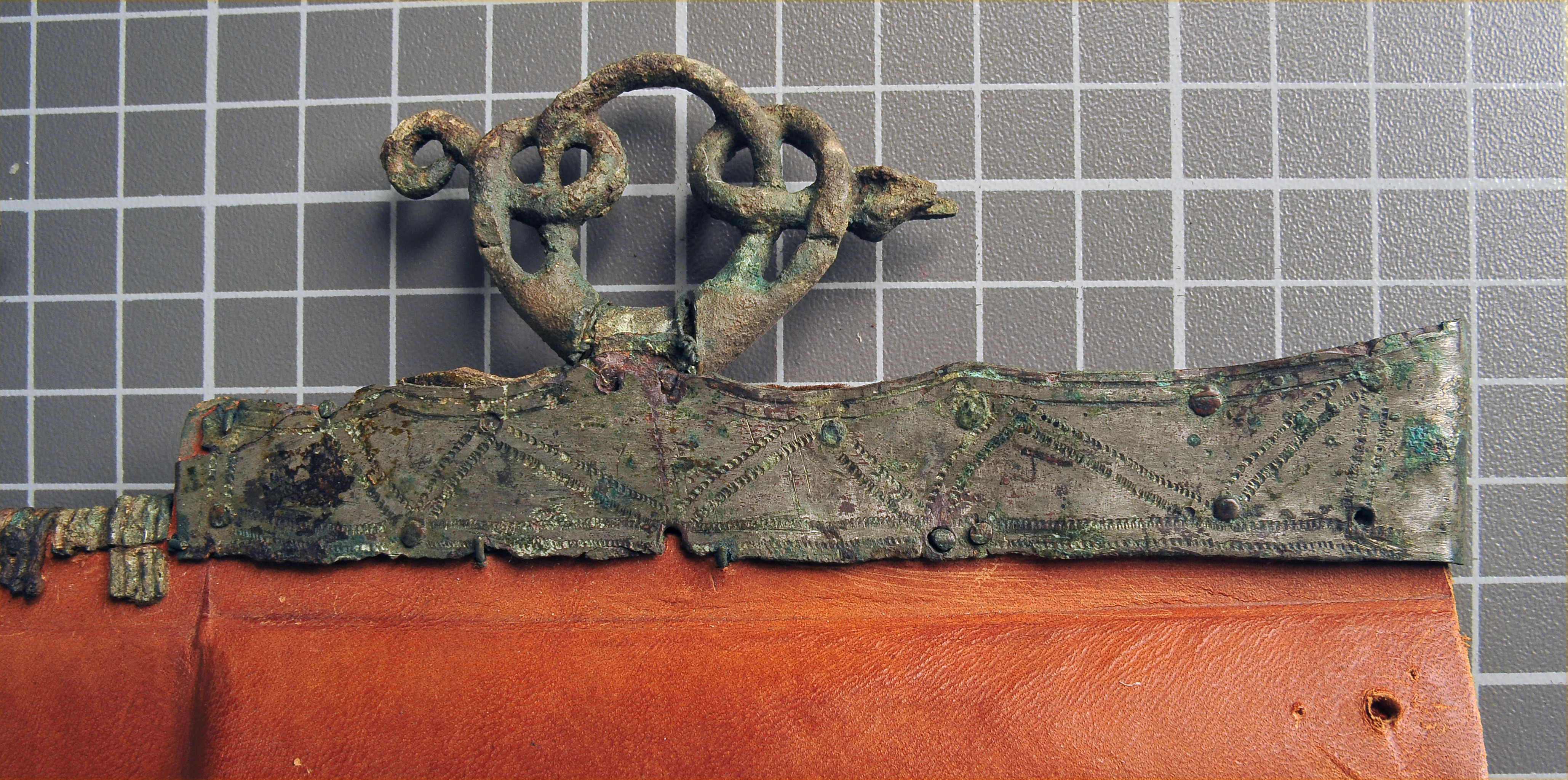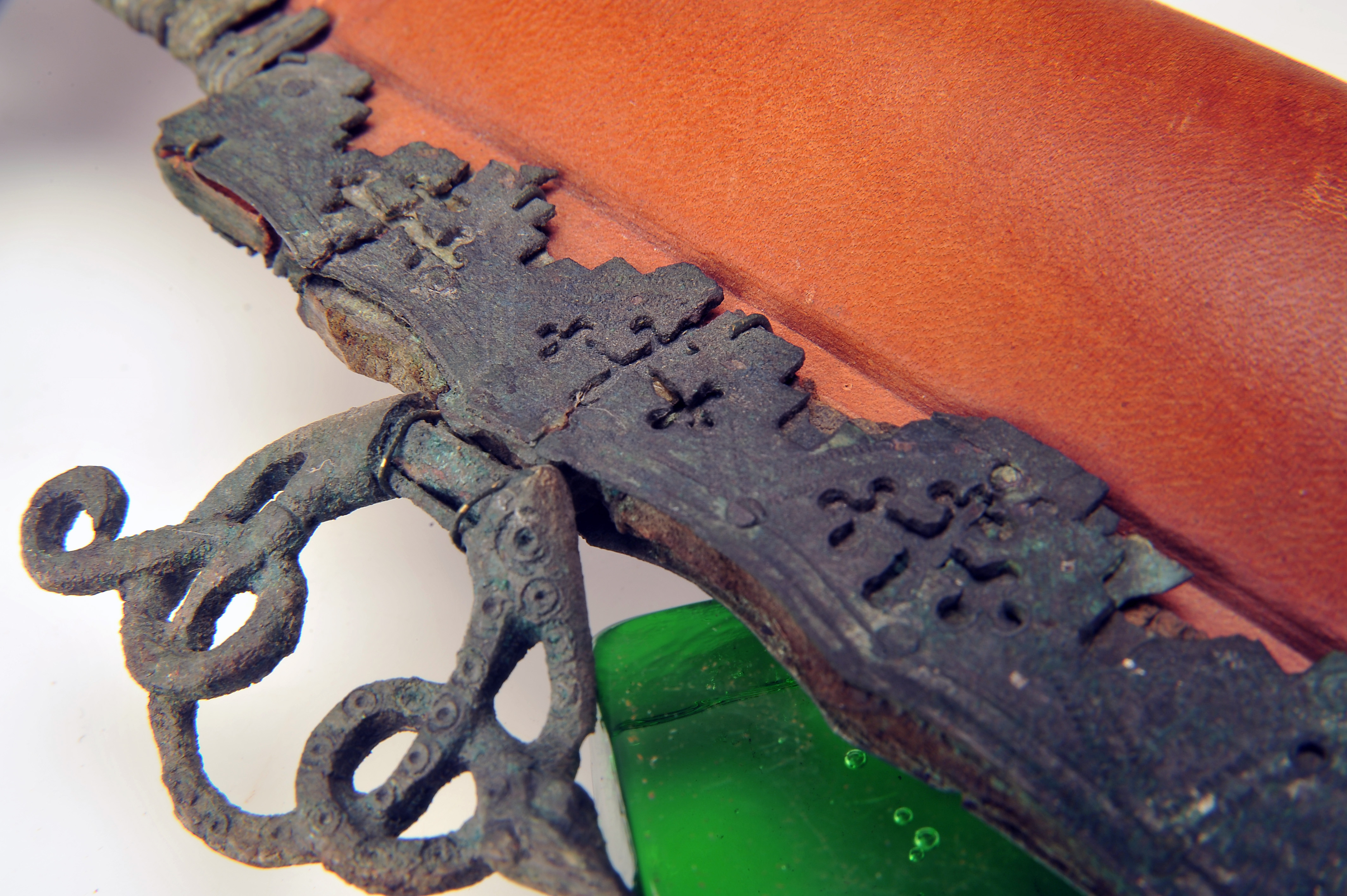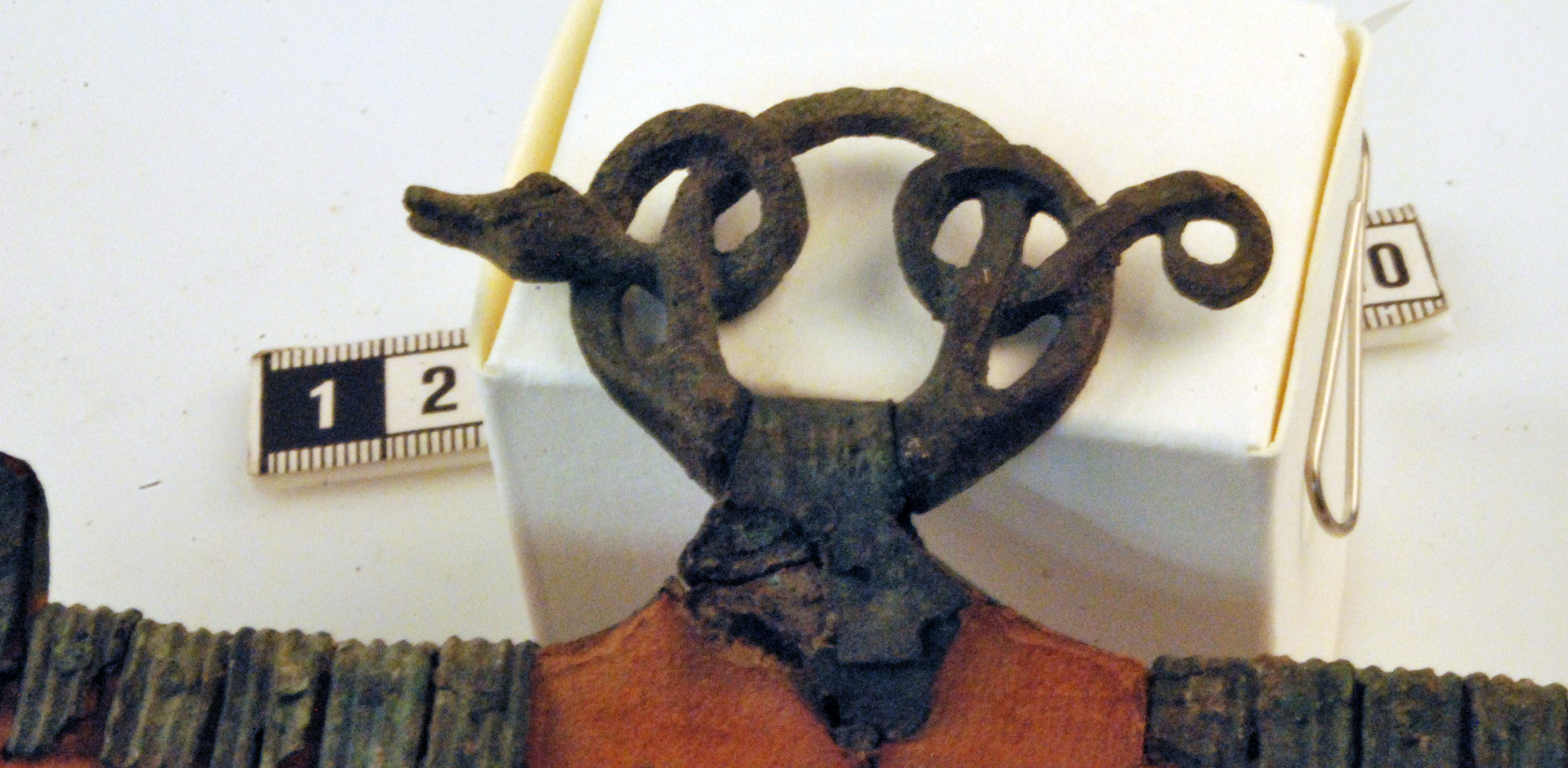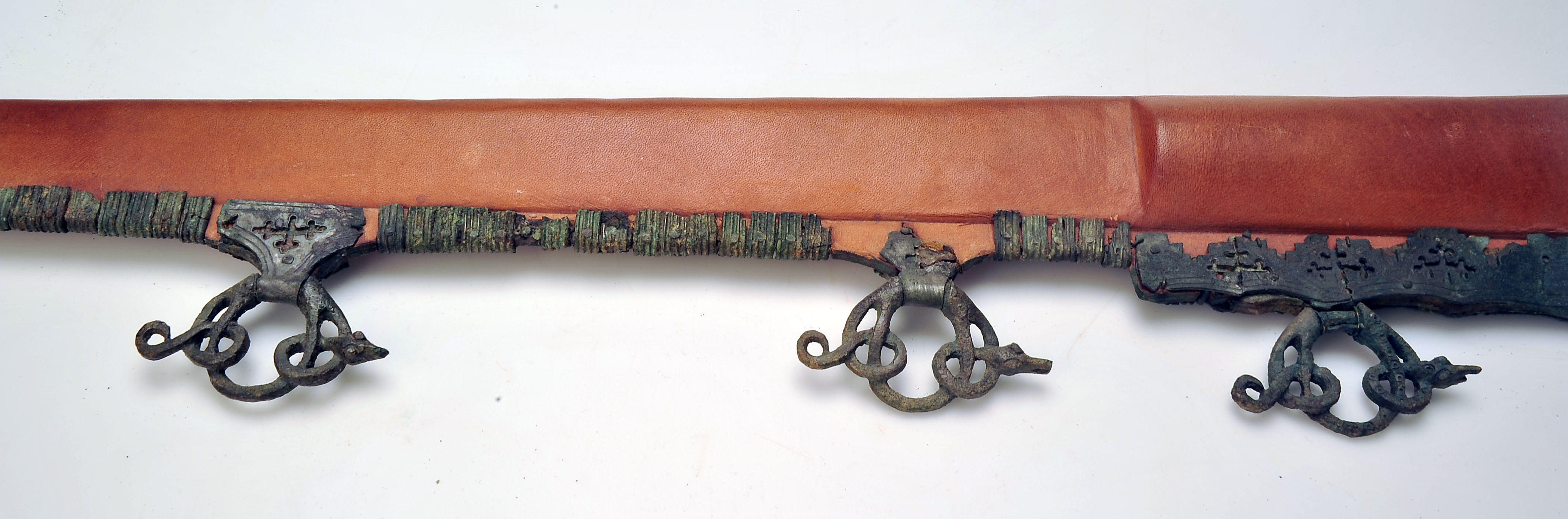Kantbeslag och doppsko monterade på en rekonstruktion av läderslidan.
