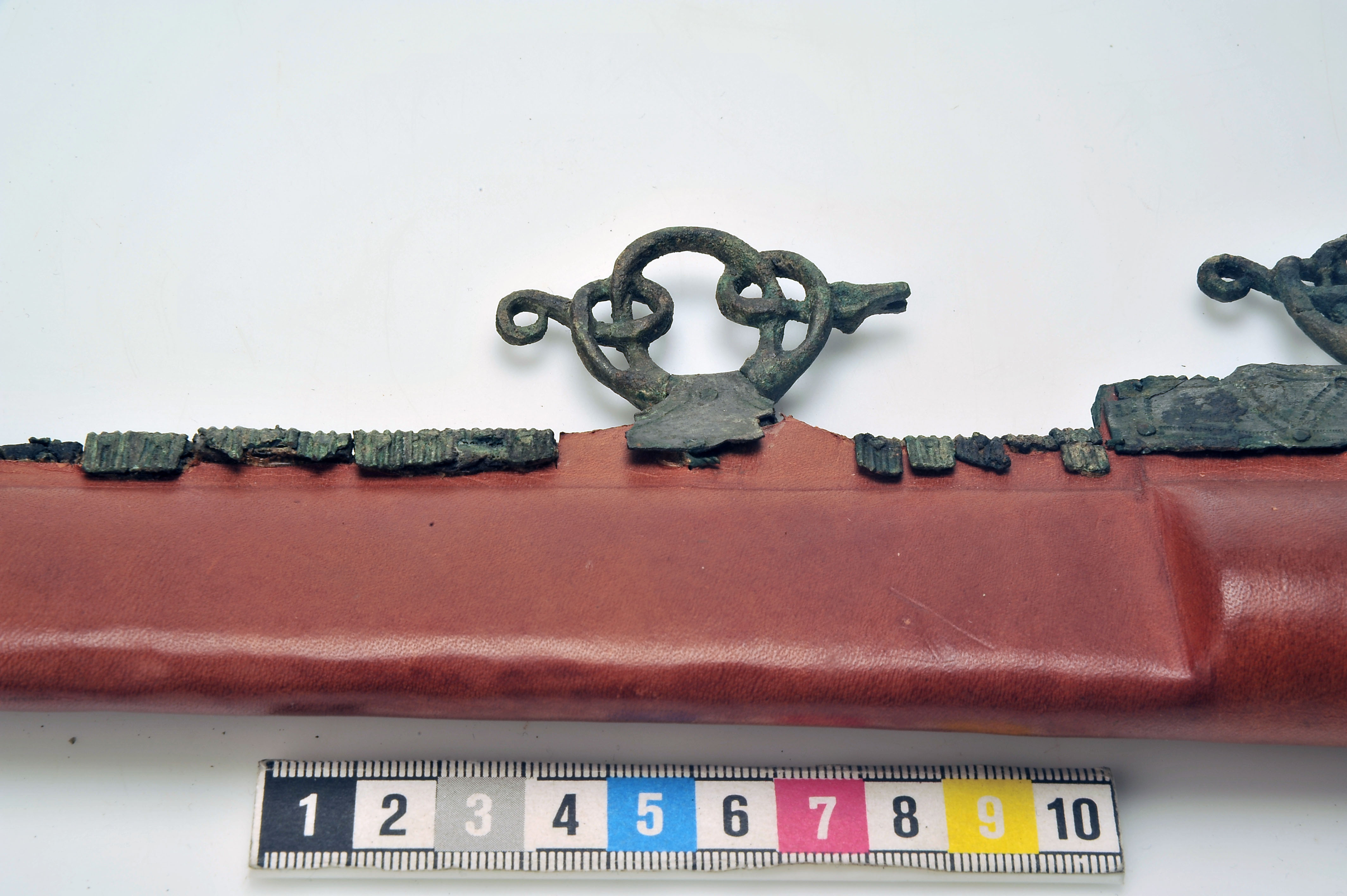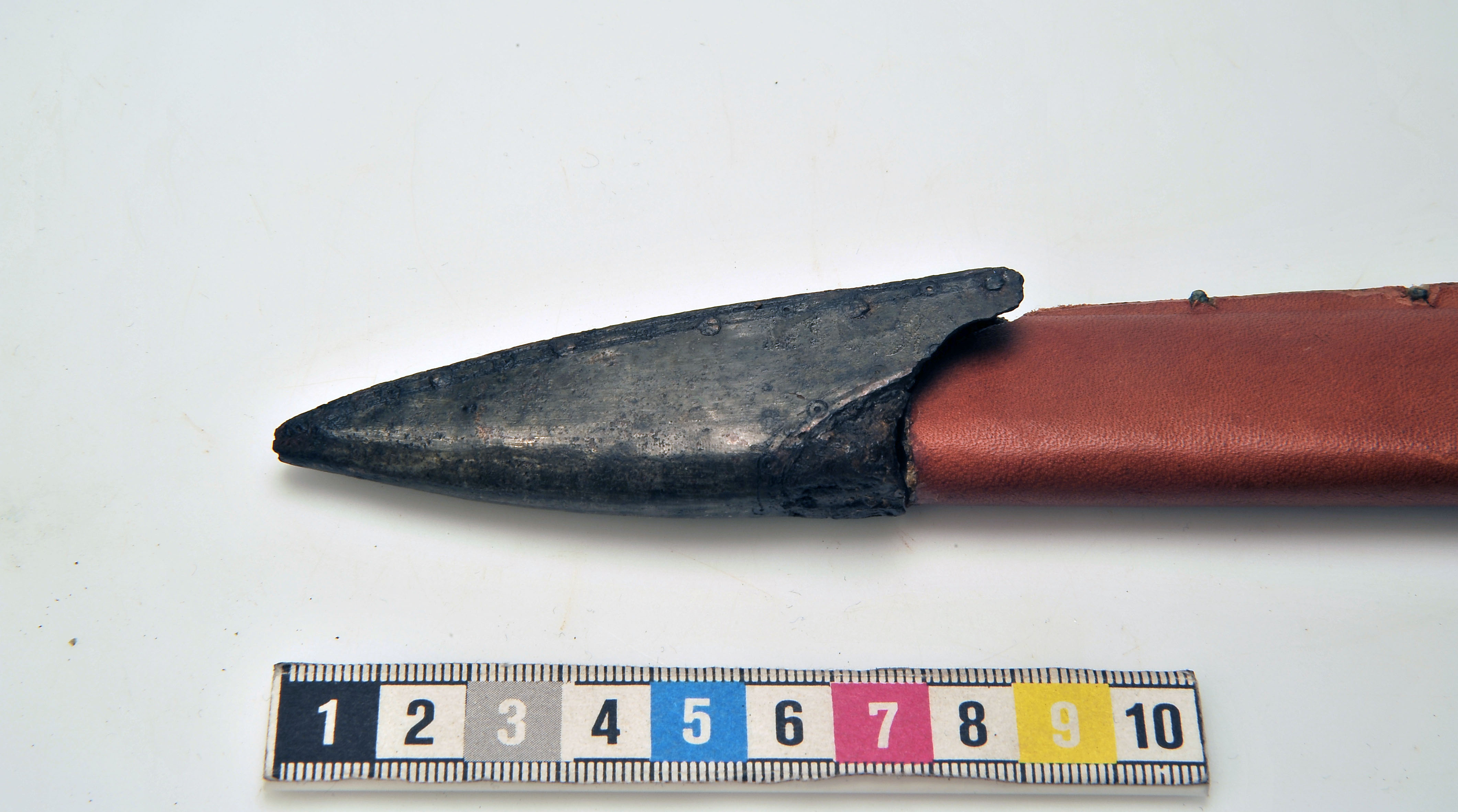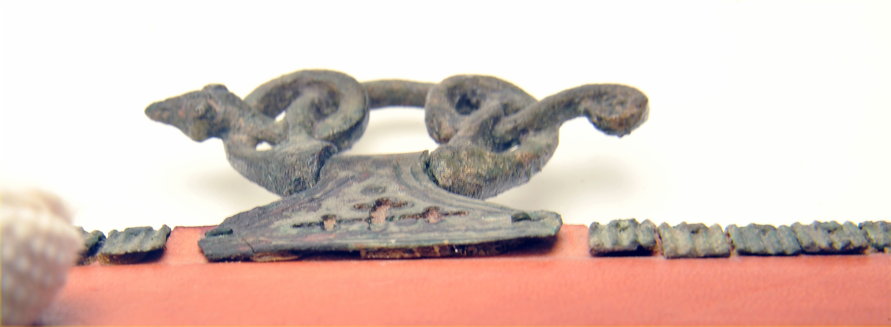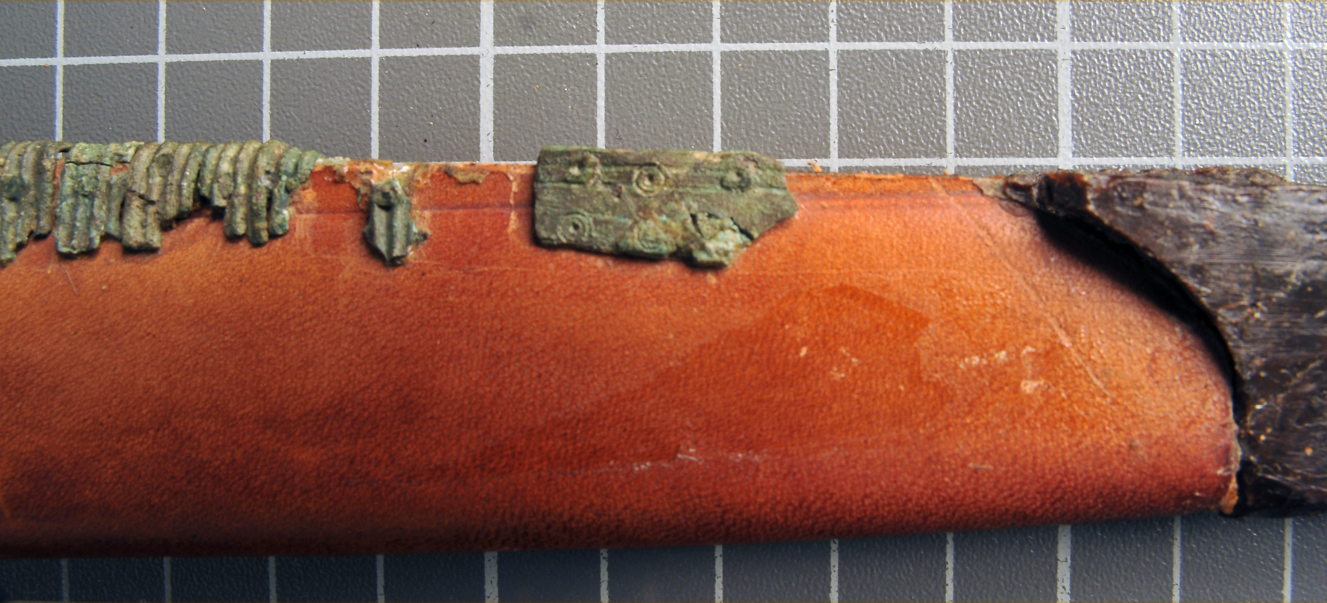 Kantbeslag och doppsko monterade på en rekonstruktion av läderslidan.