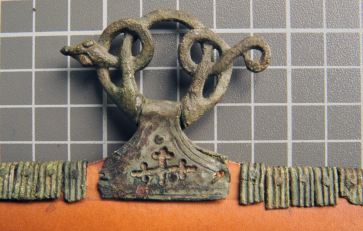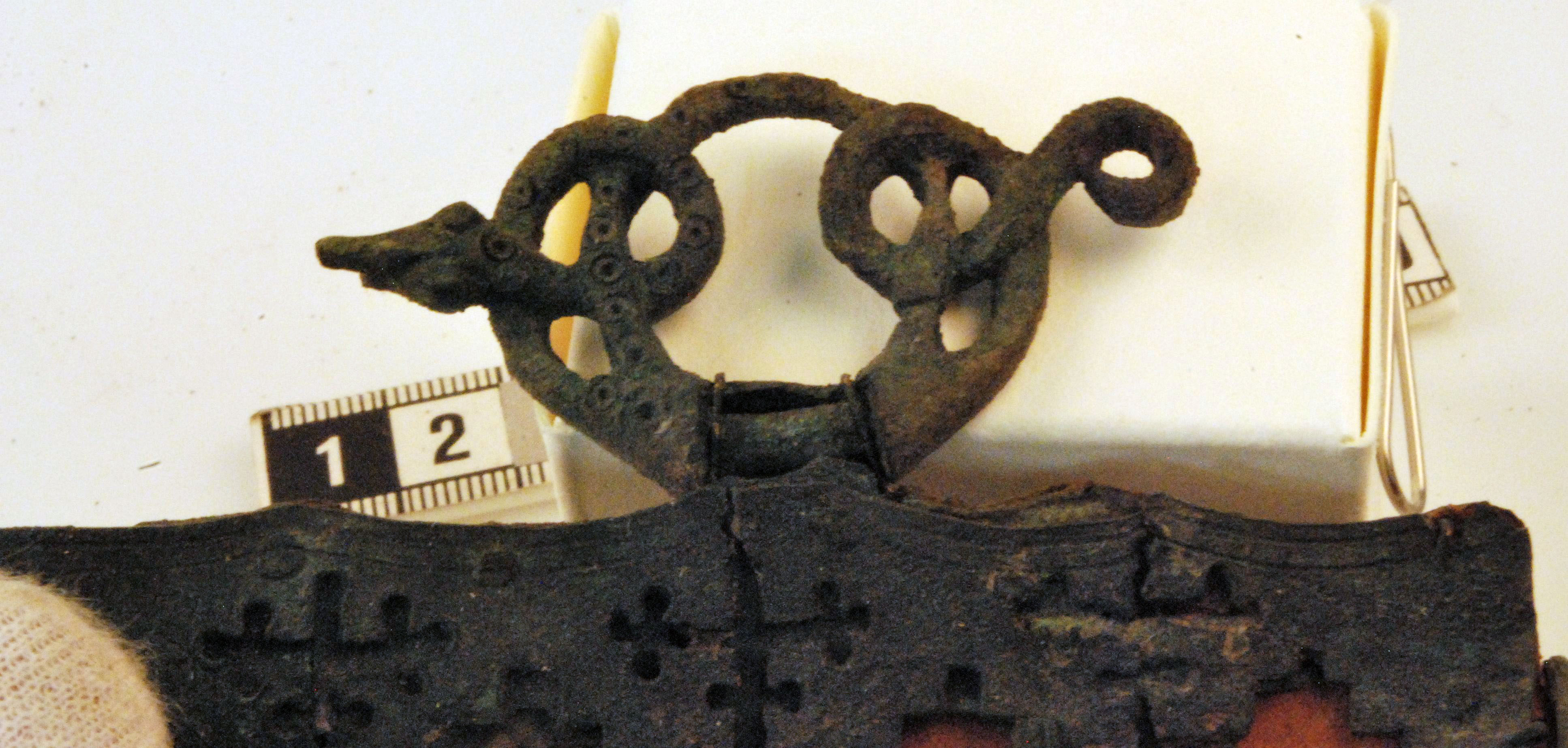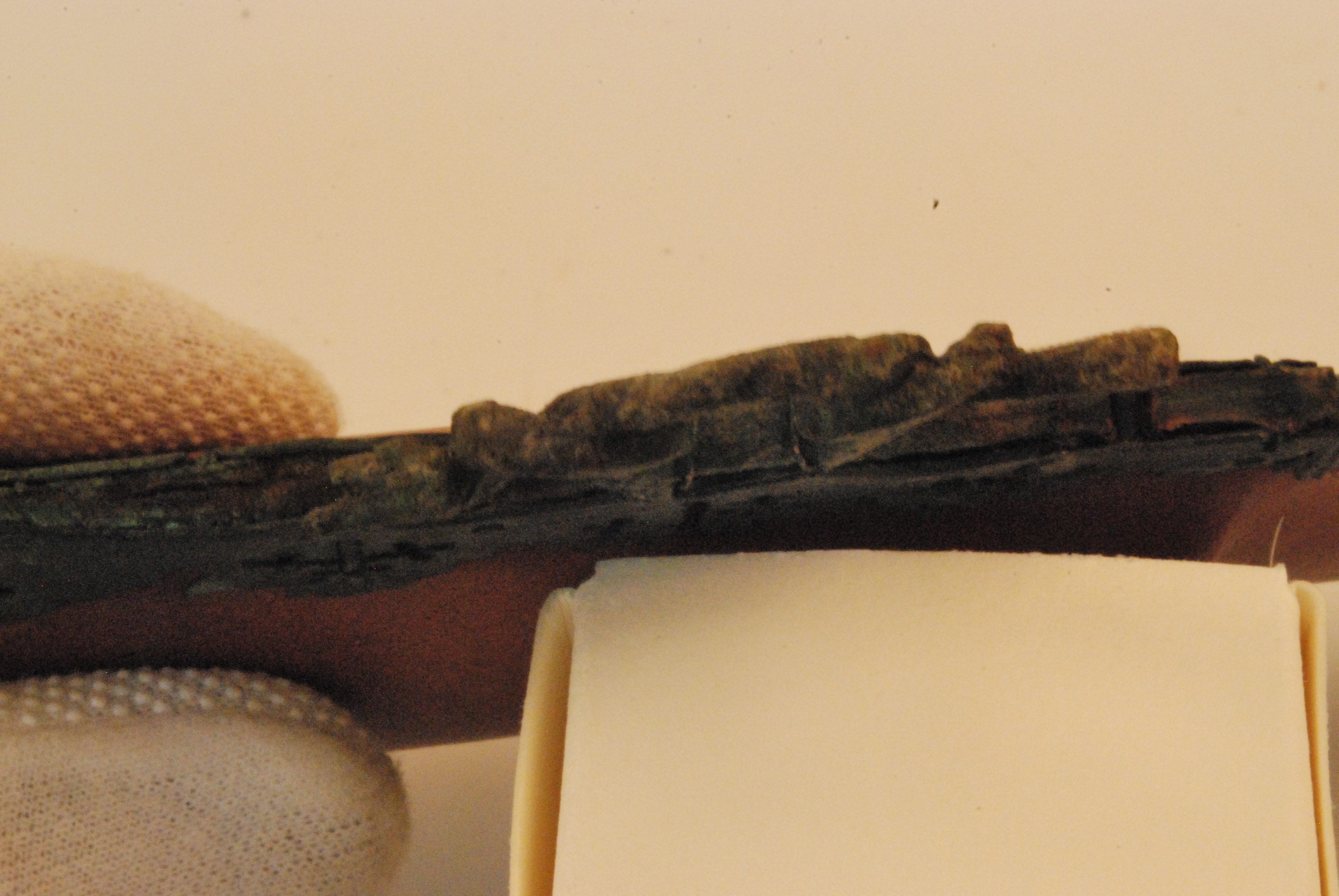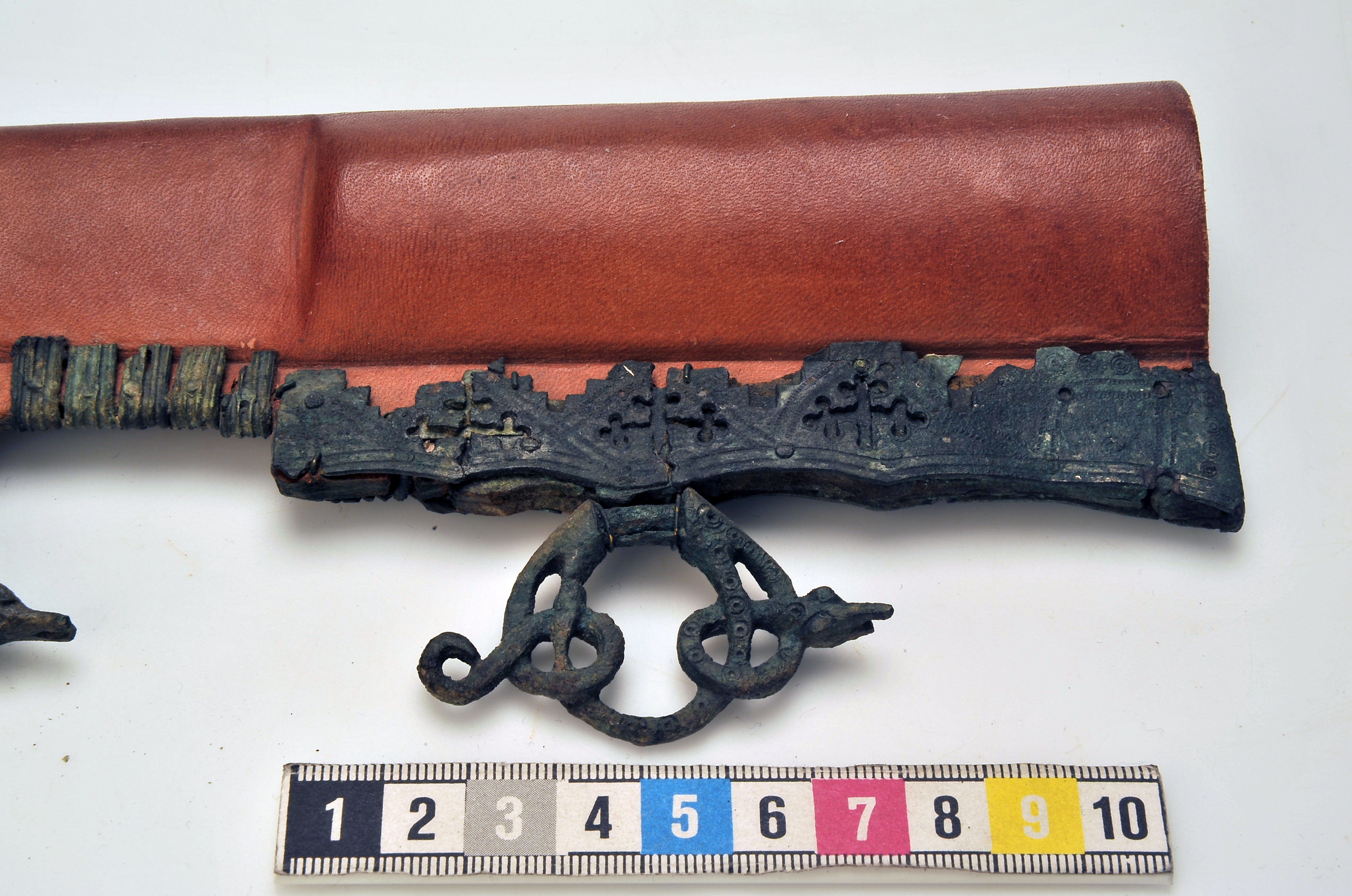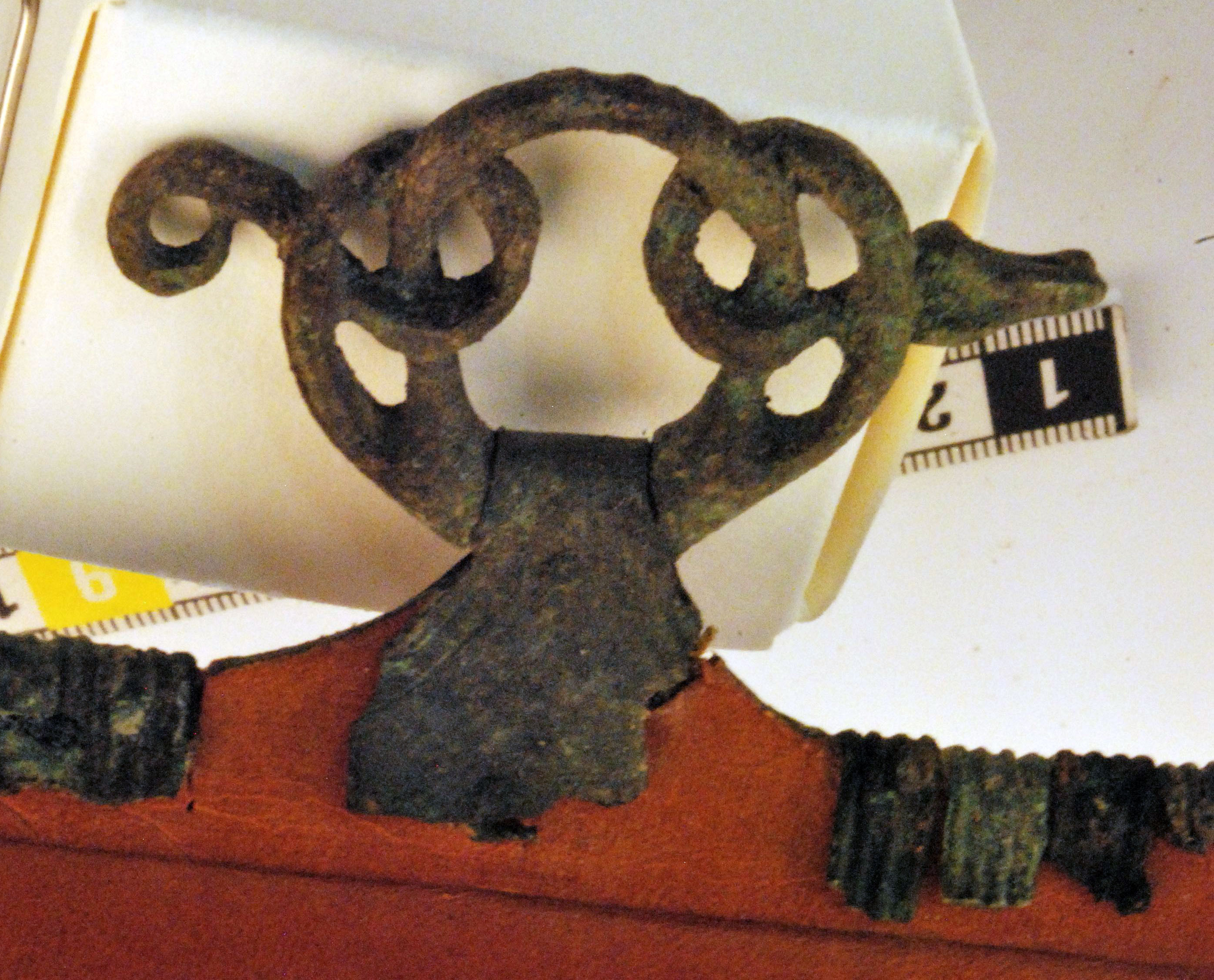 Kantbeslag och doppsko monterade på en rekonstruktion av läderslidan.