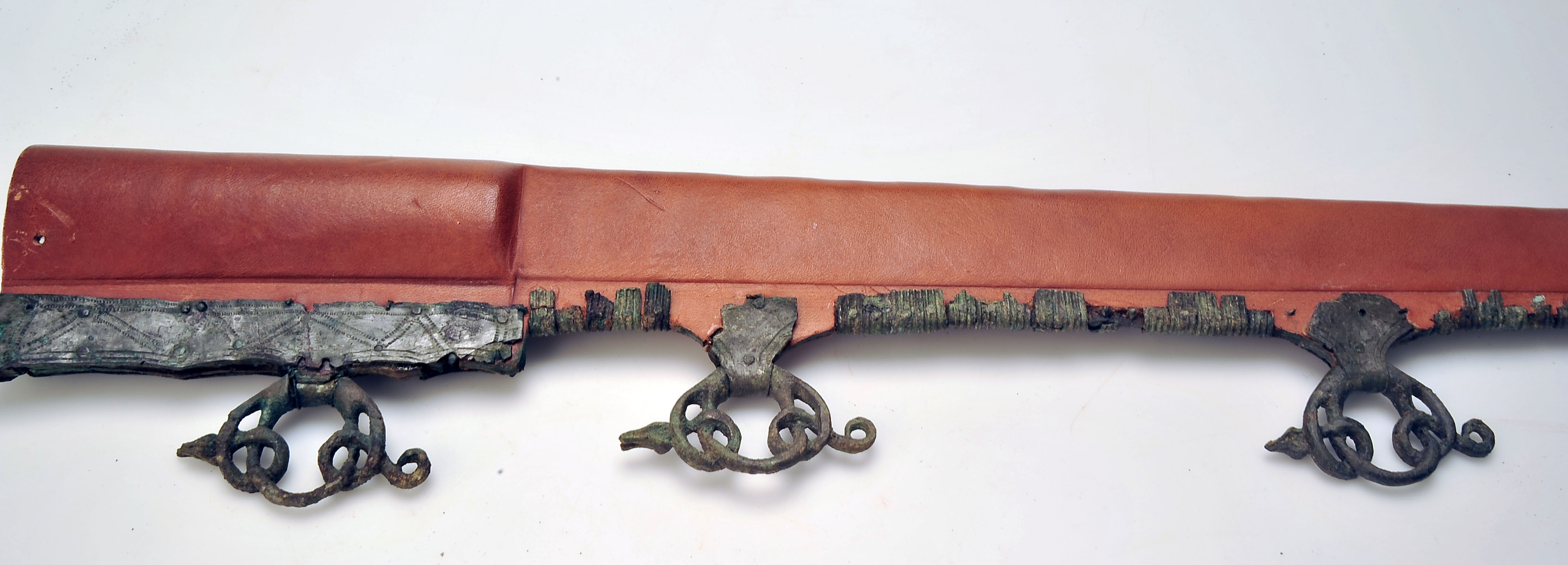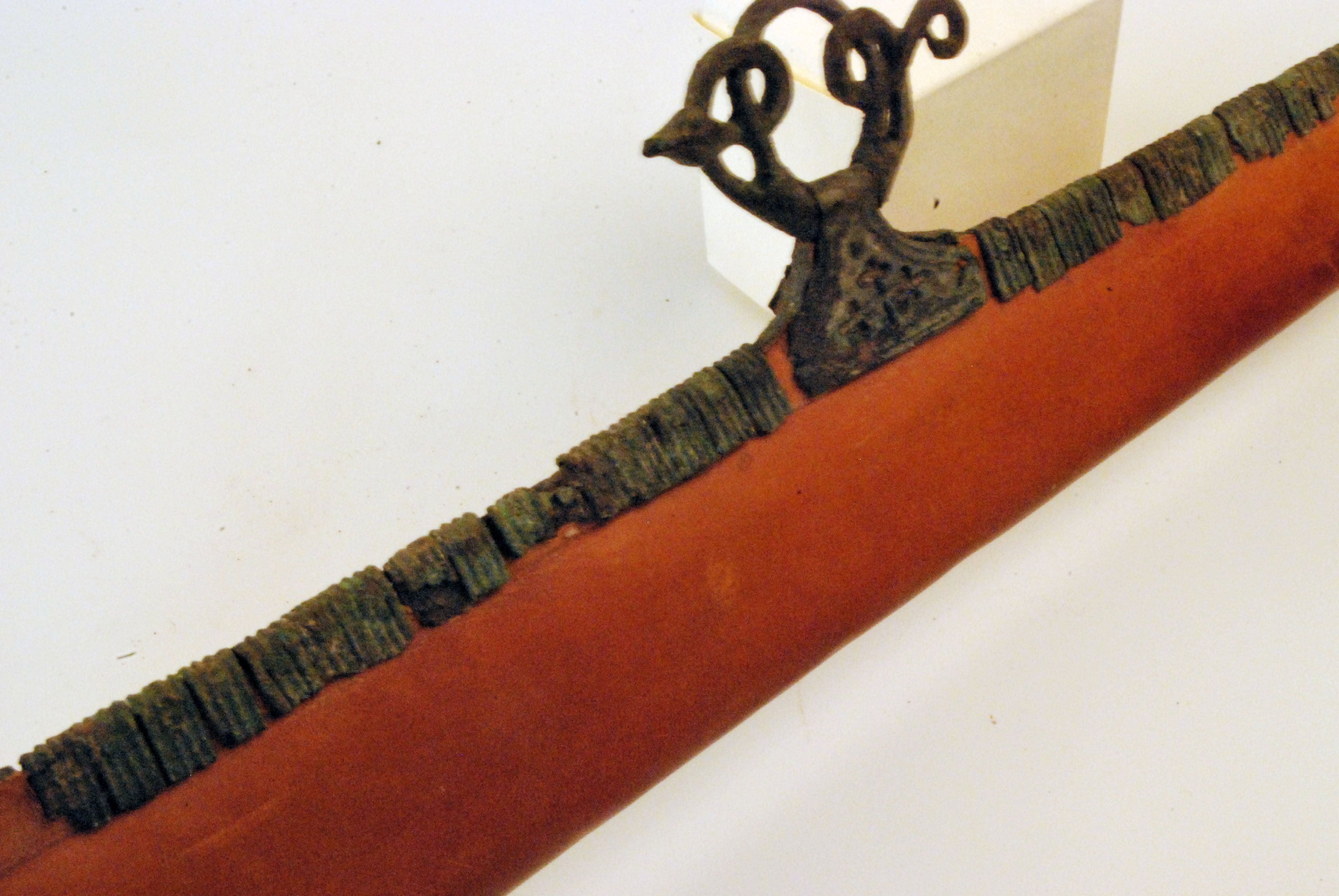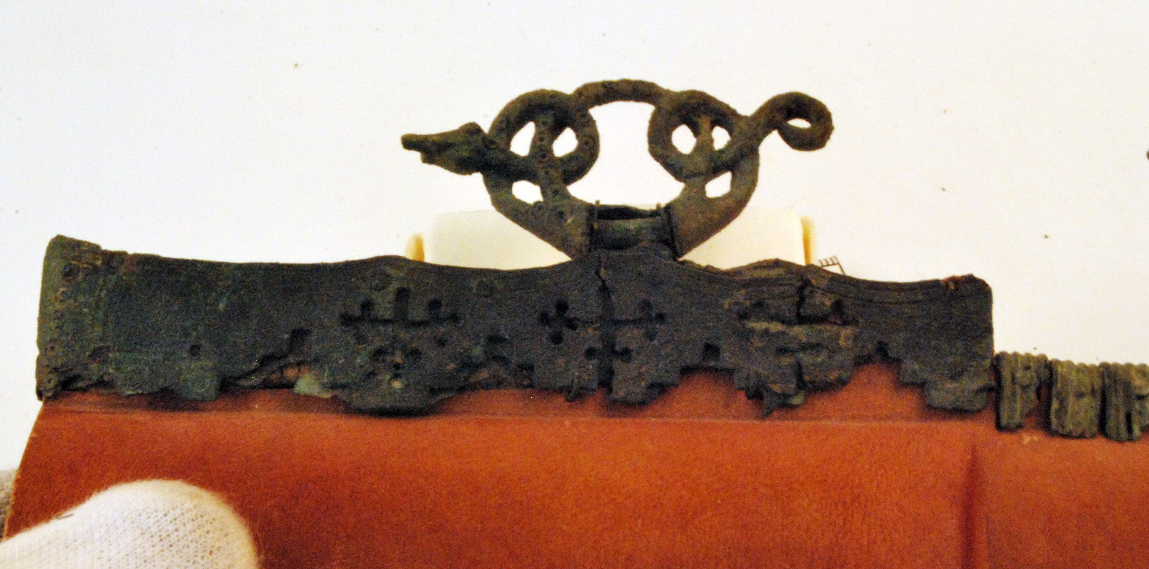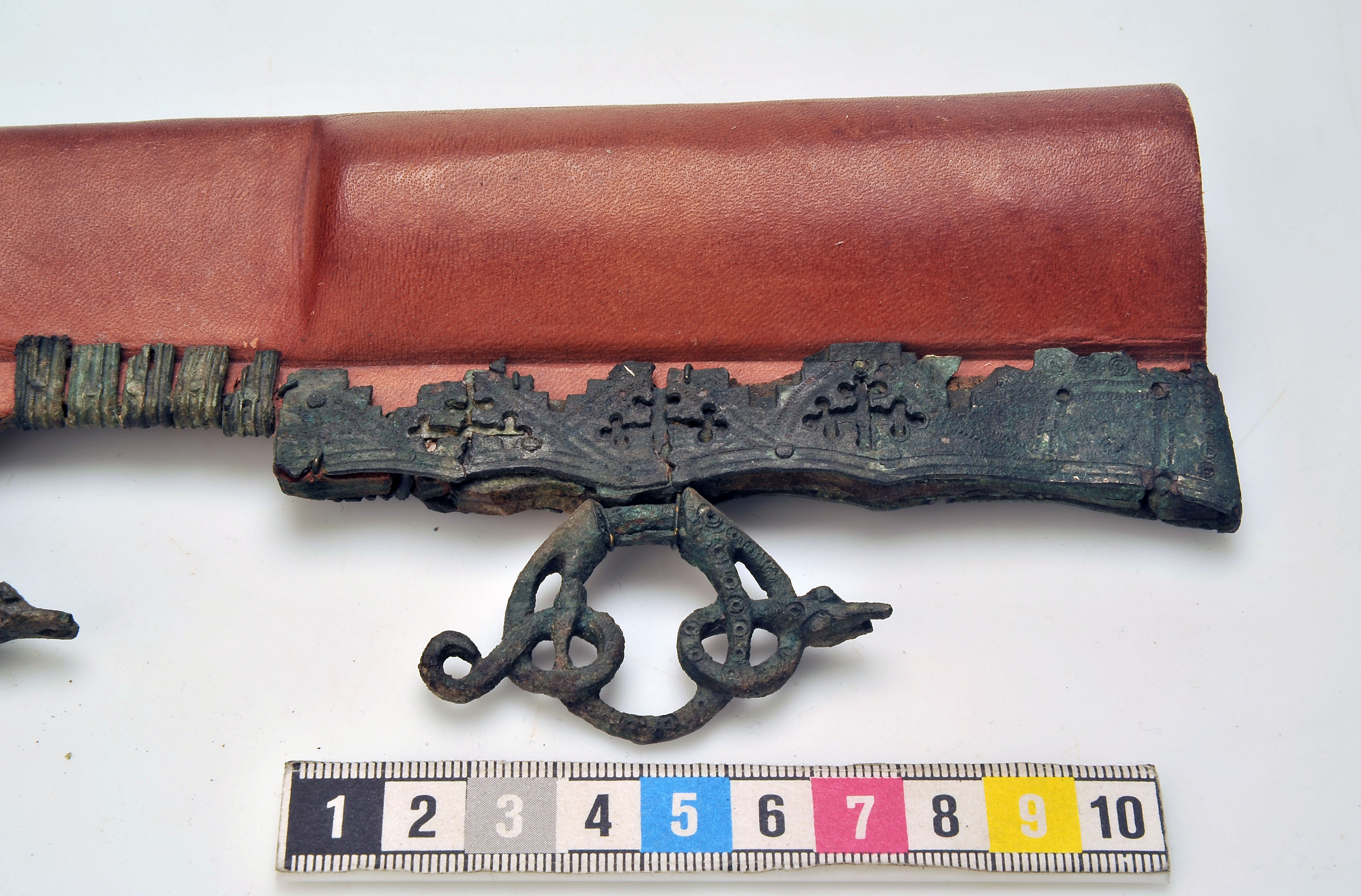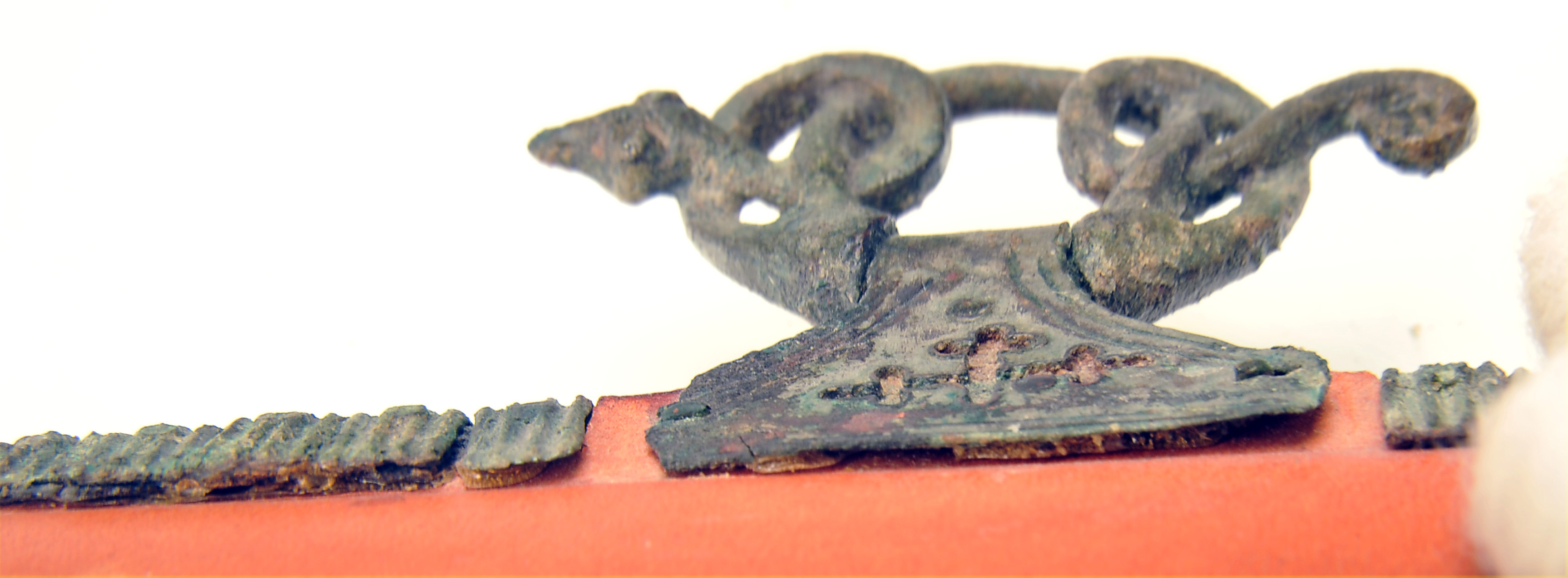 Kantbeslag och doppsko monterade på en rekonstruktion av läderslidan.