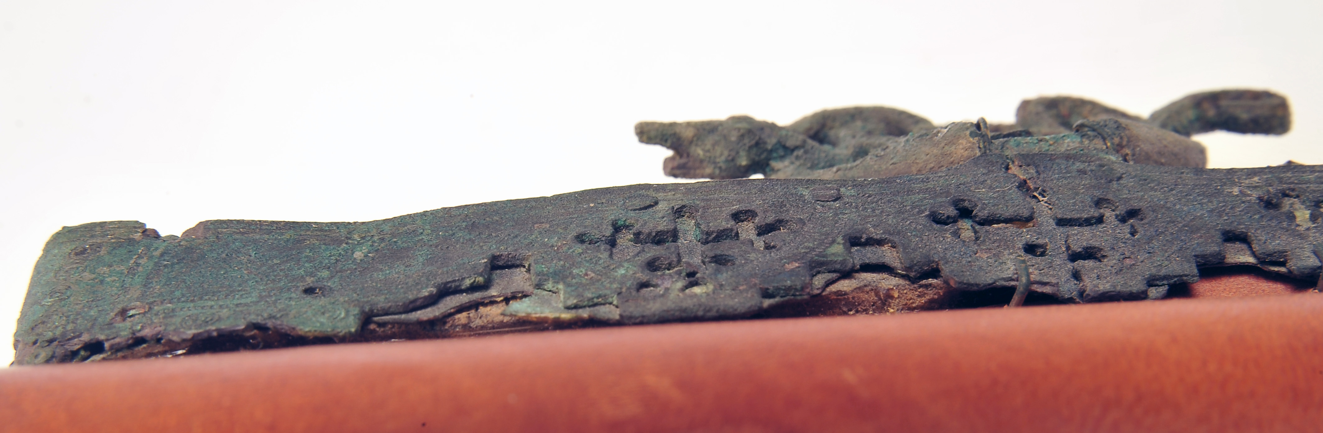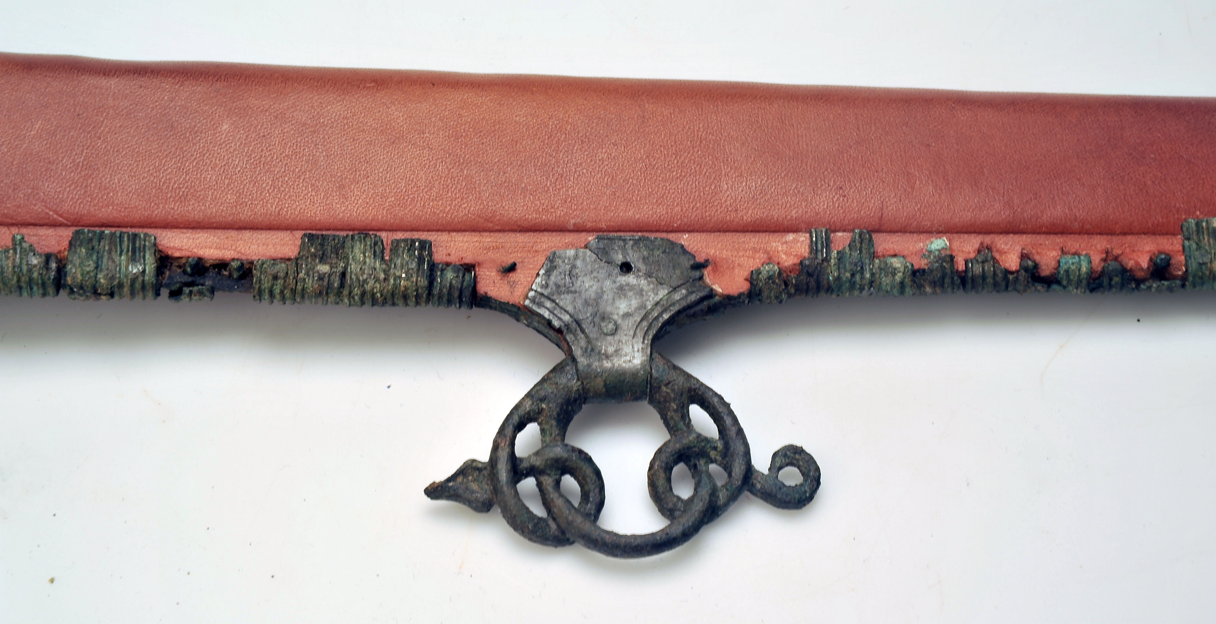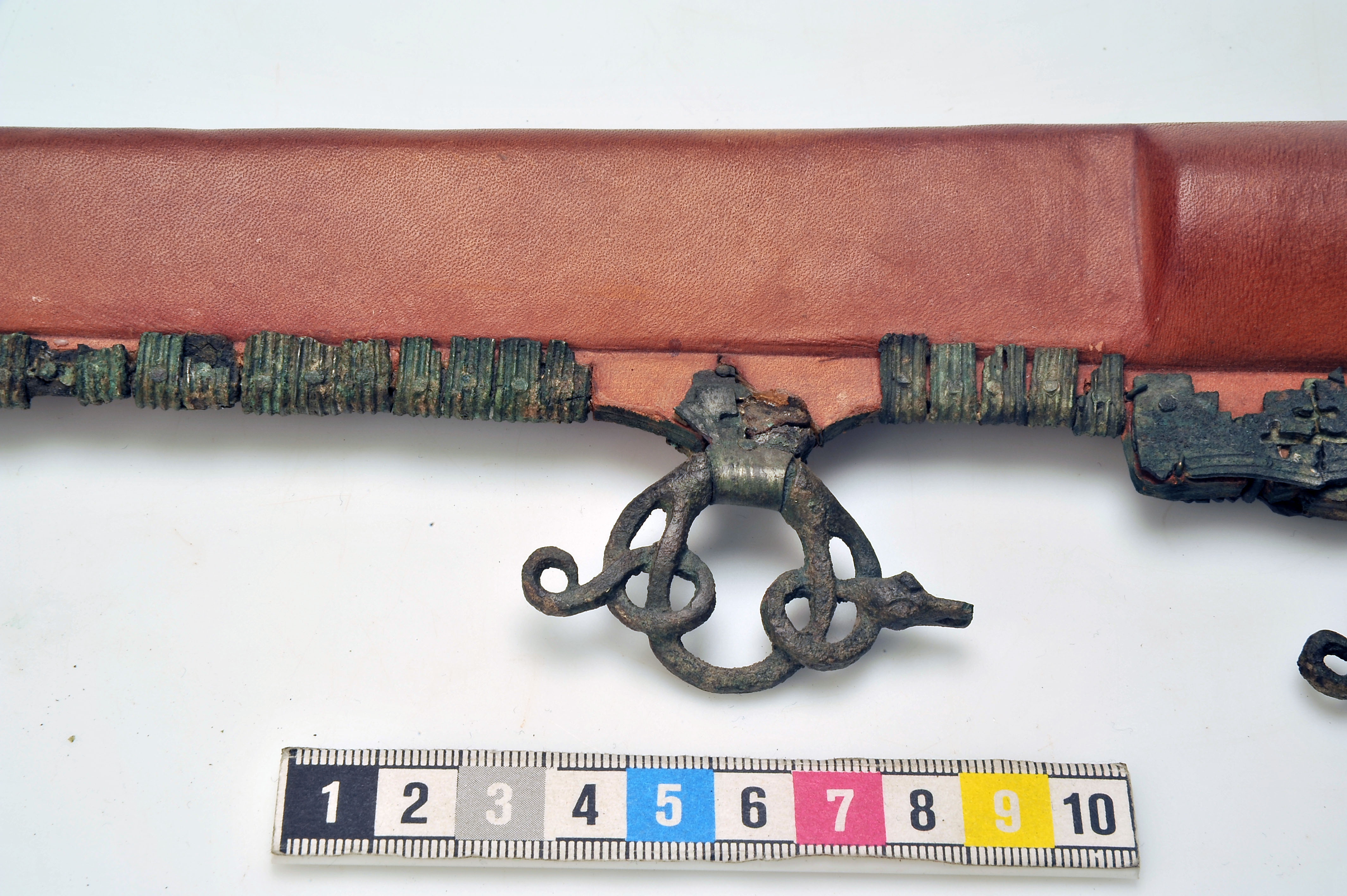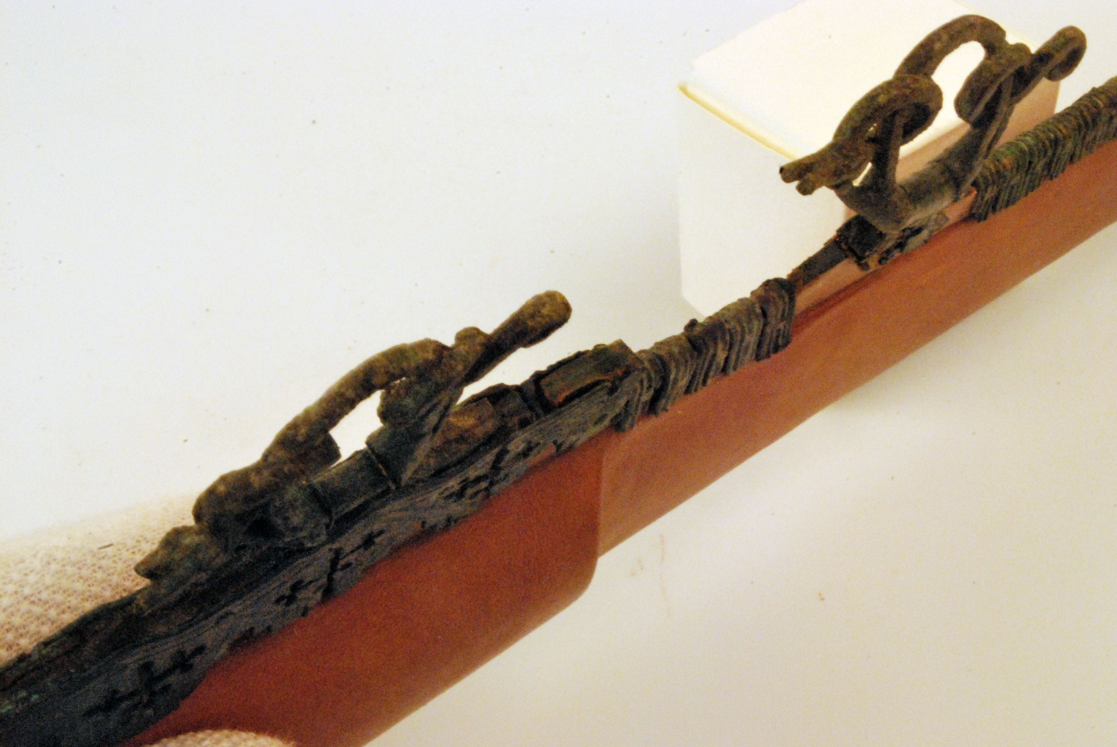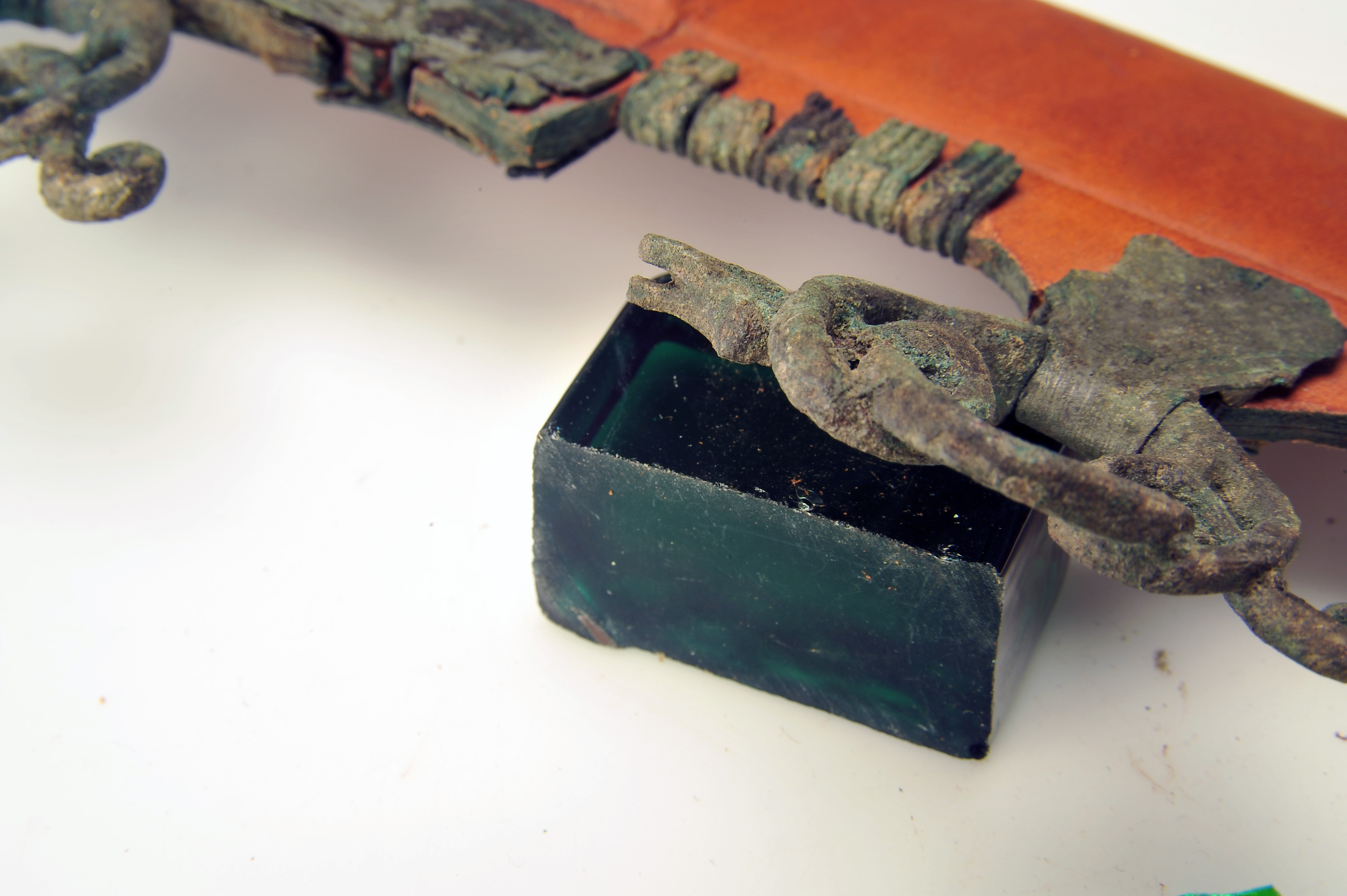 Kantbeslag och doppsko monterade på en rekonstruktion av läderslidan.
