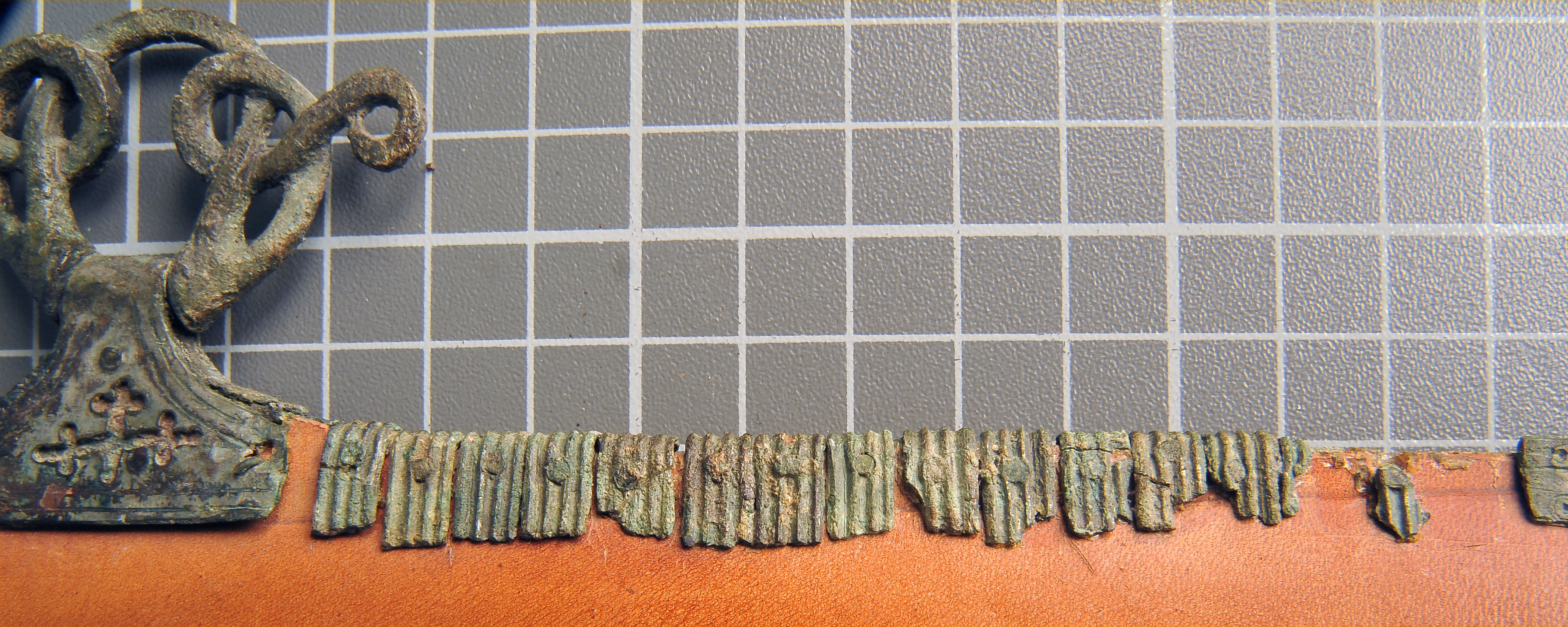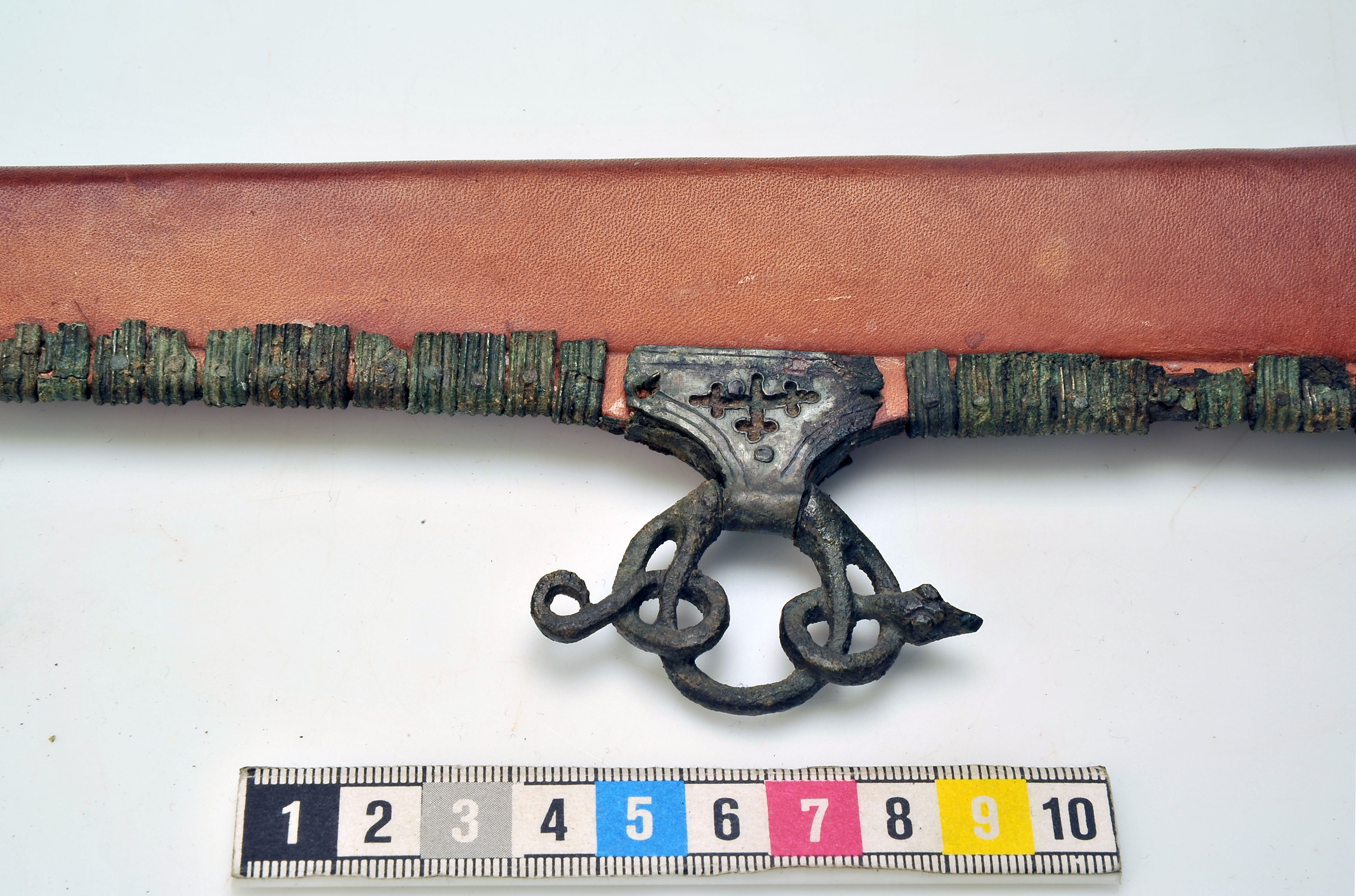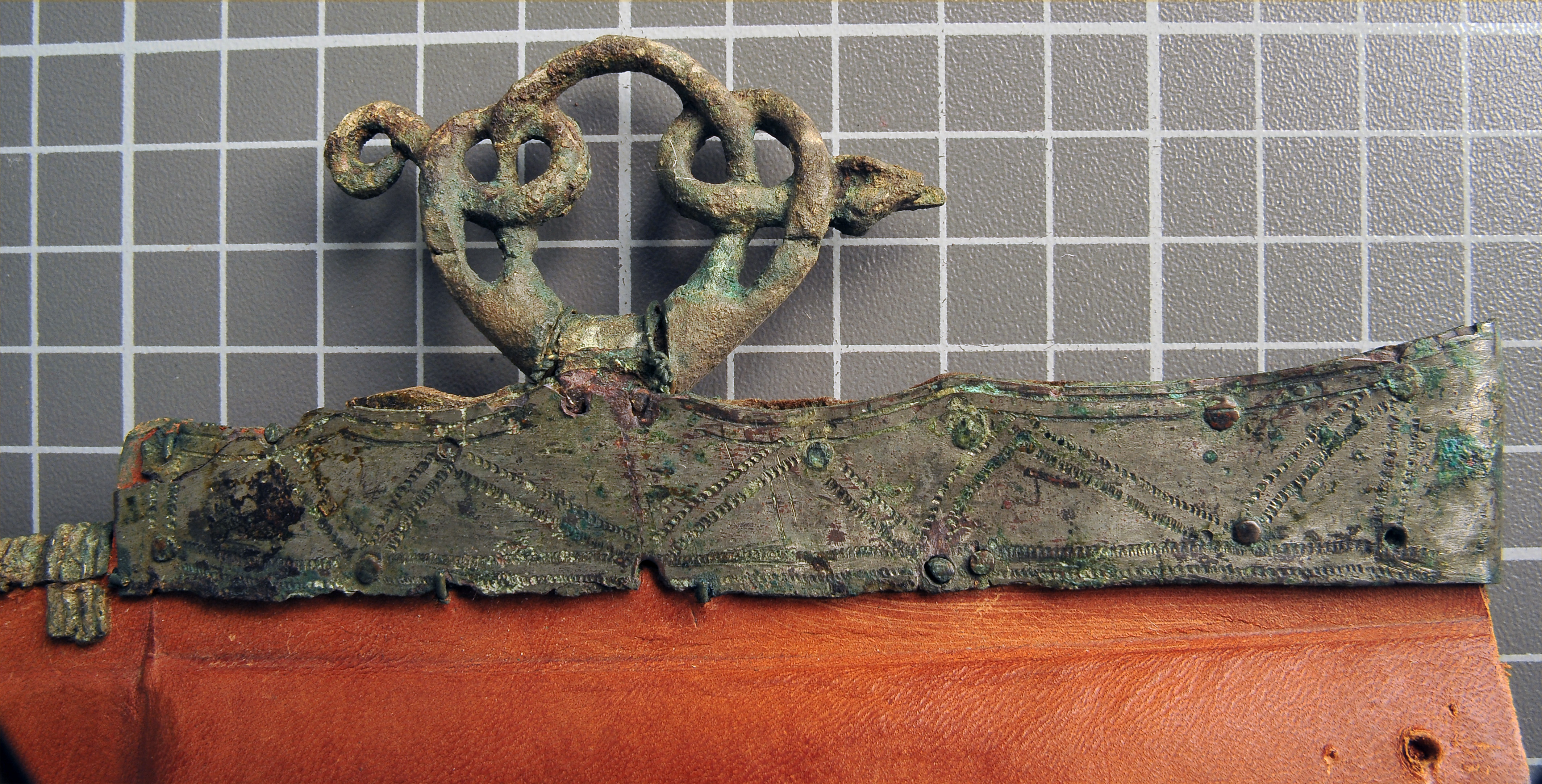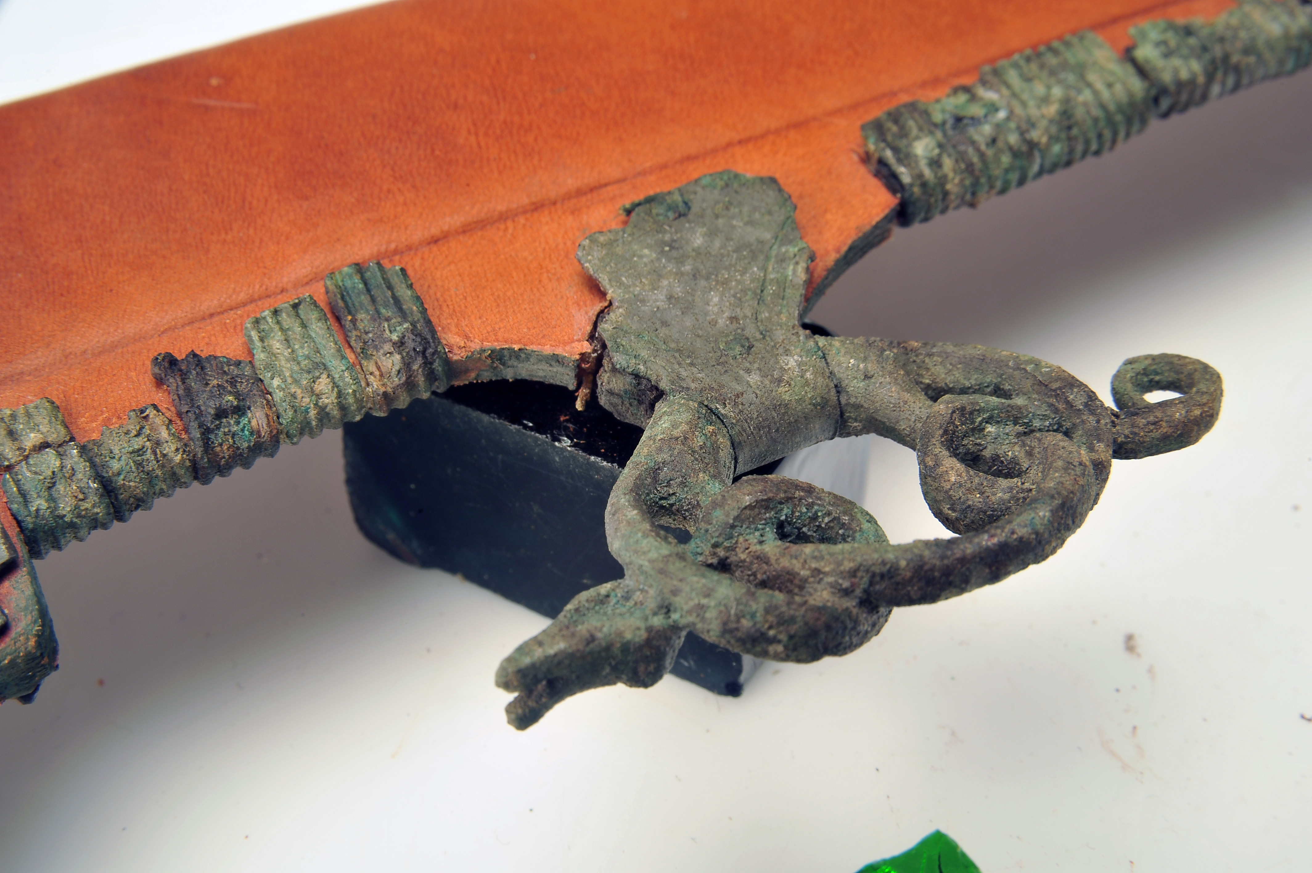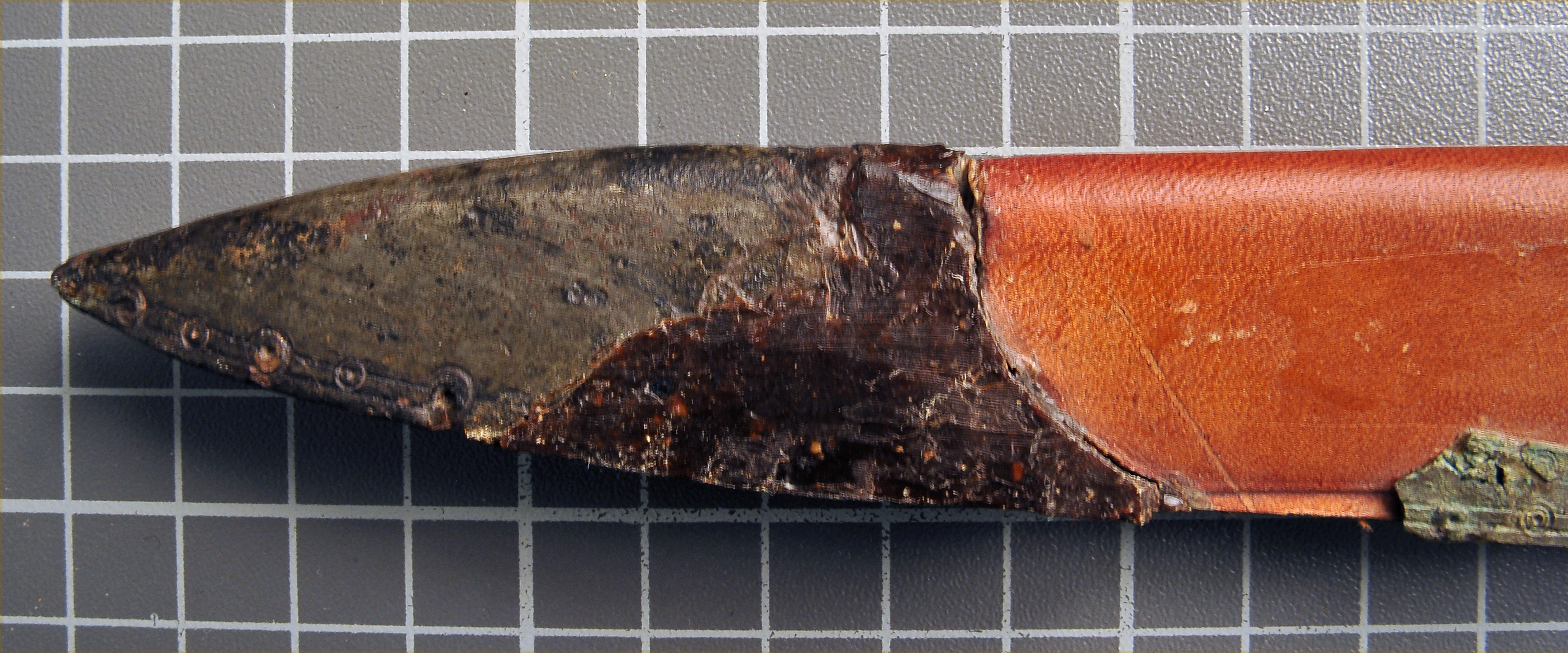 Kantbeslag och doppsko monterade på en rekonstruktion av läderslidan.