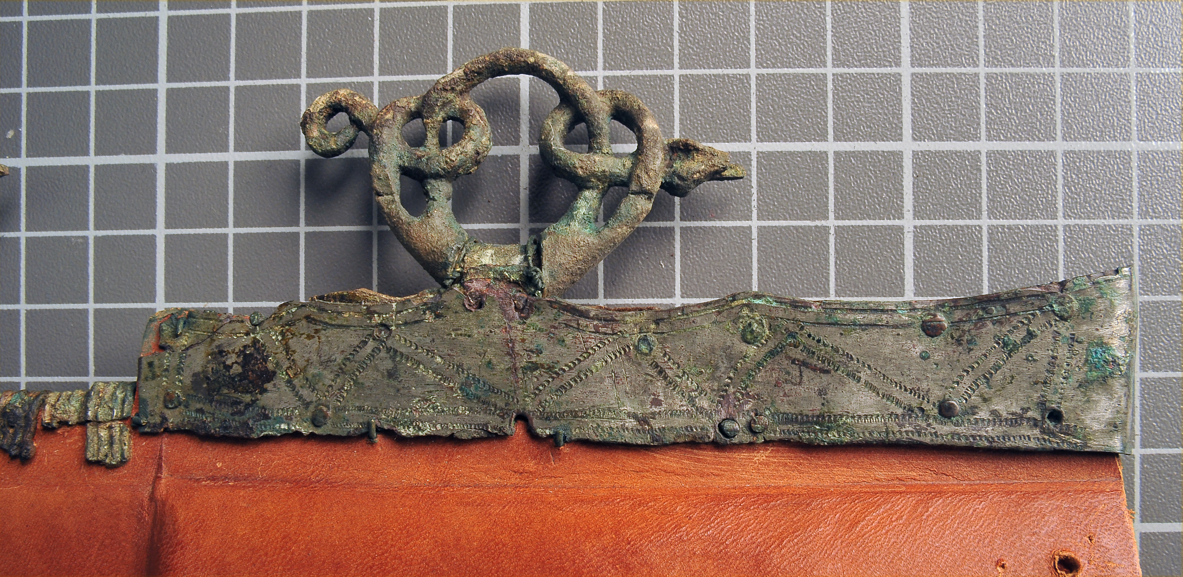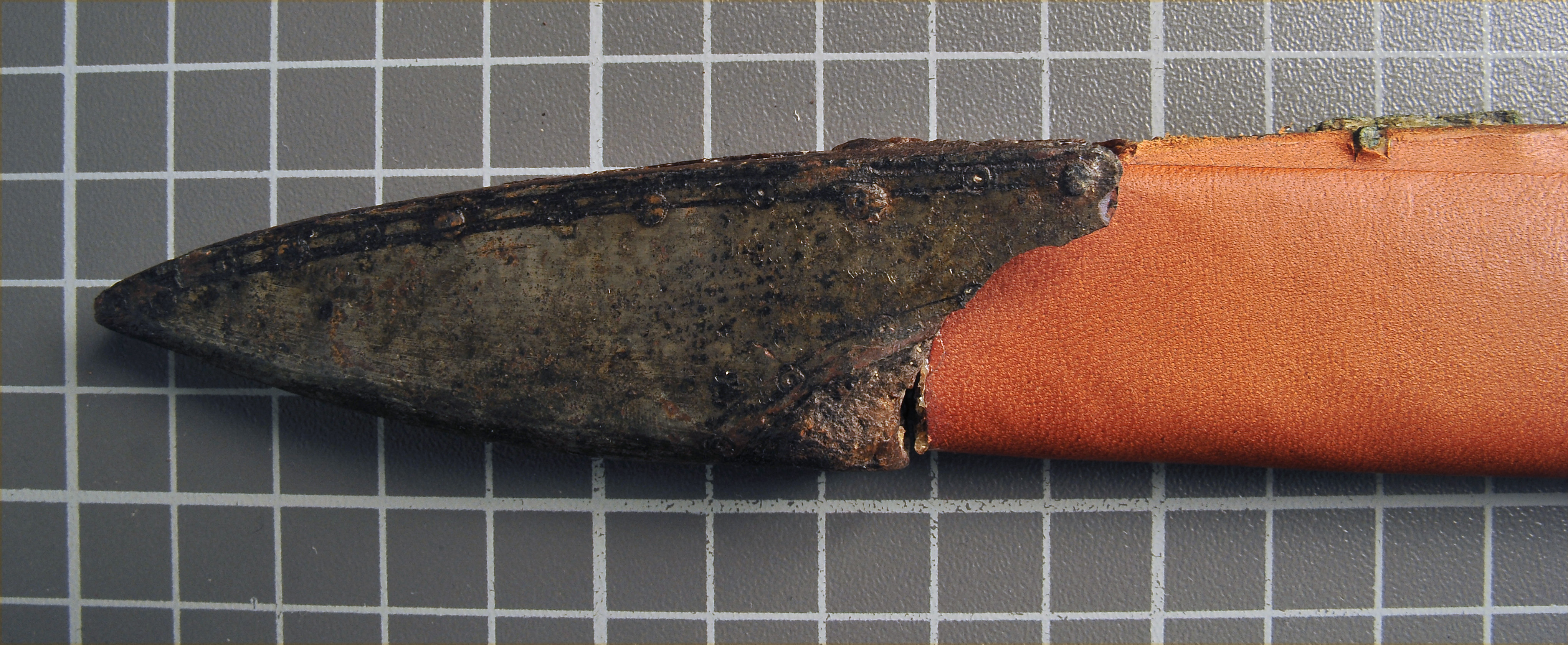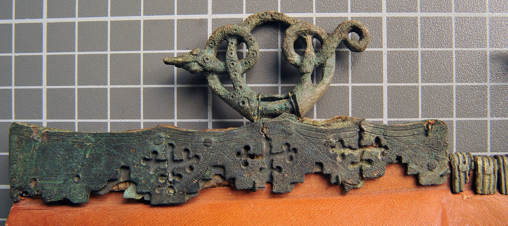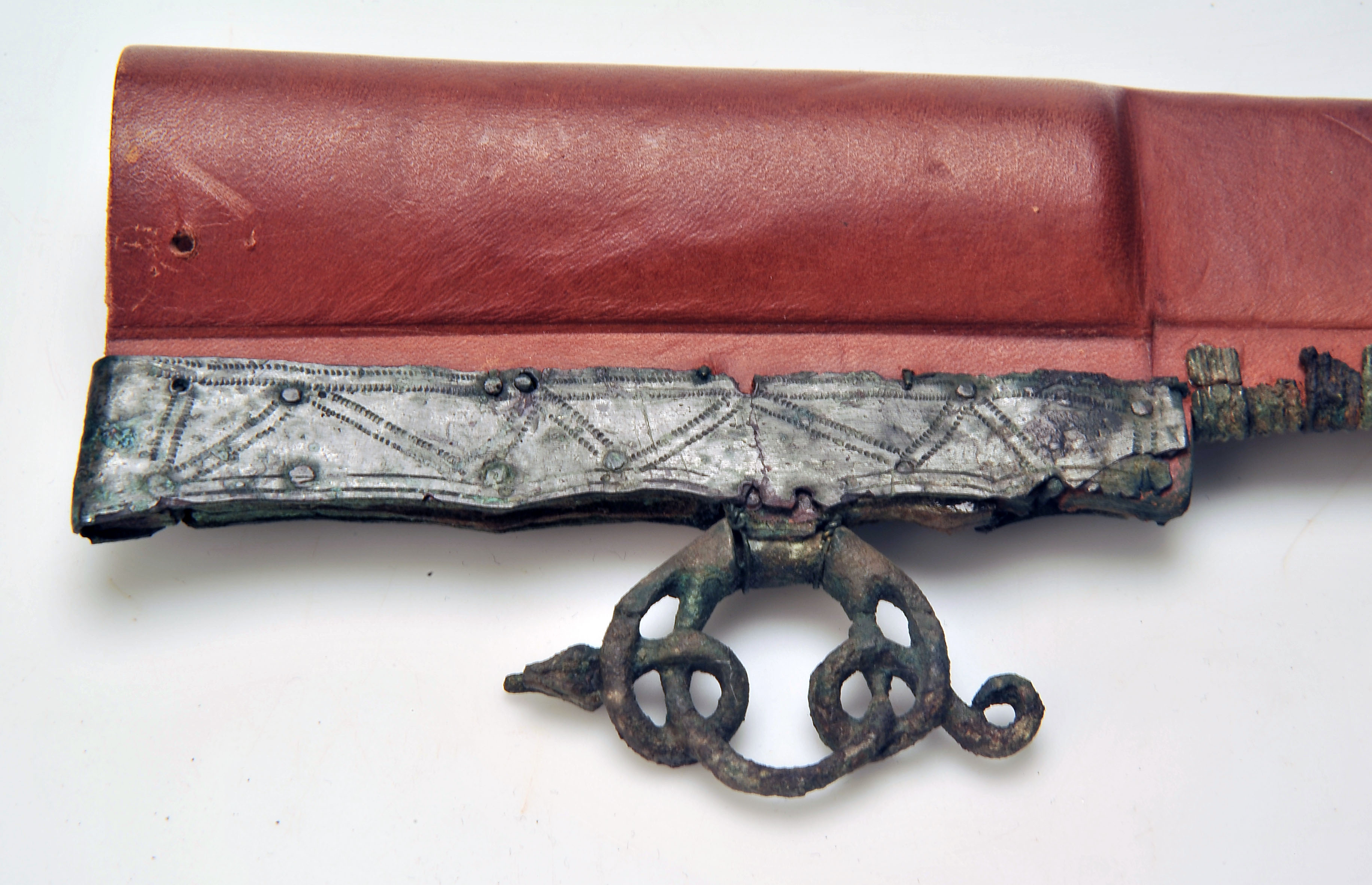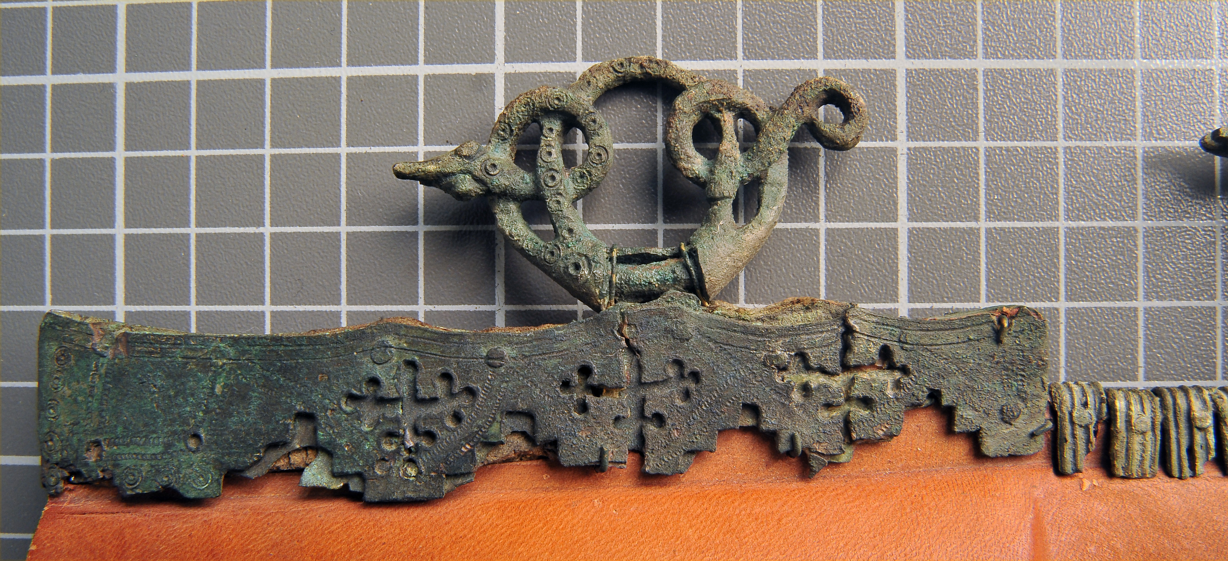 Kantbeslag och doppsko monterade på en rekonstruktion av läderslidan.