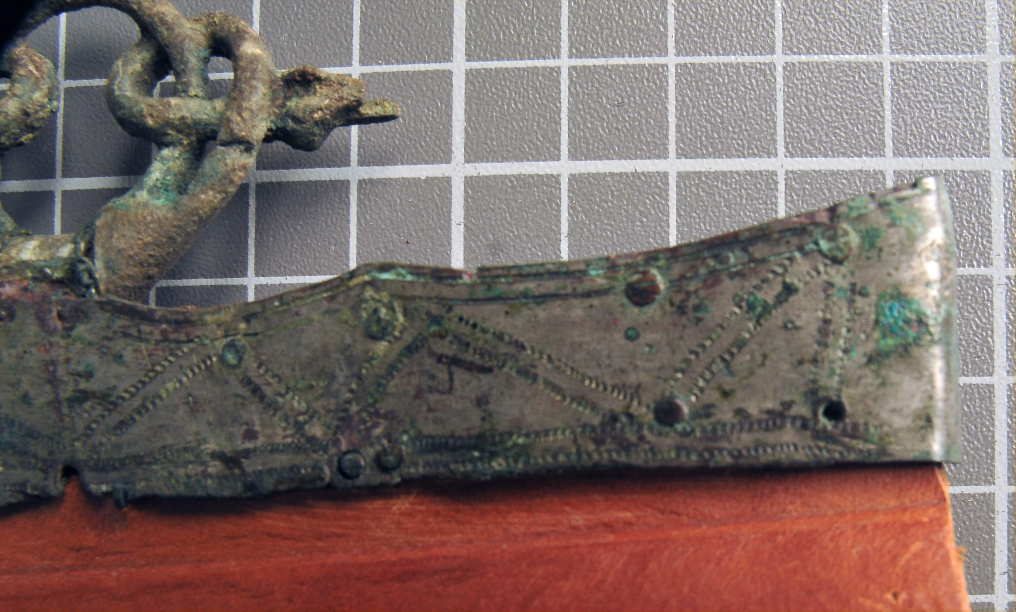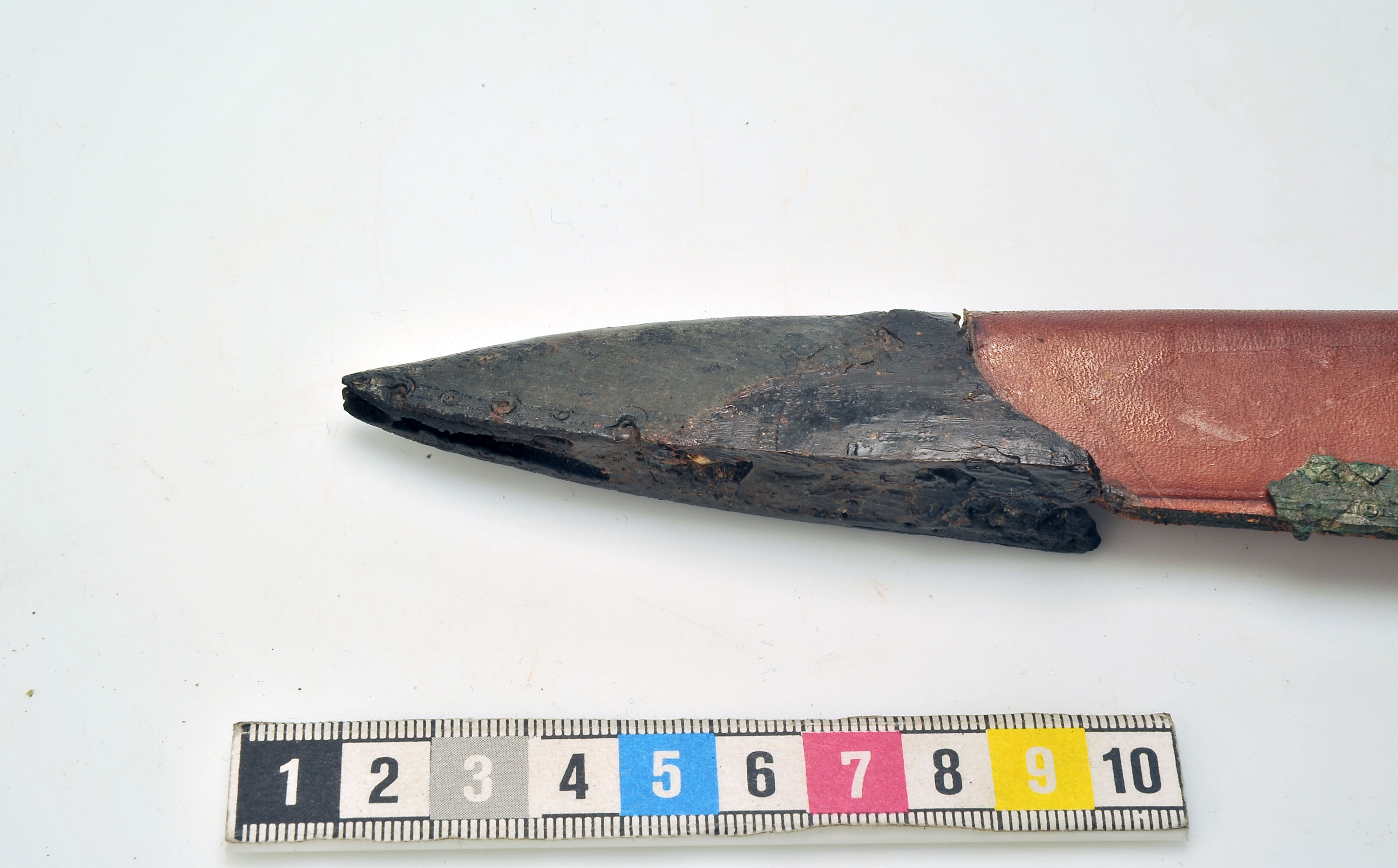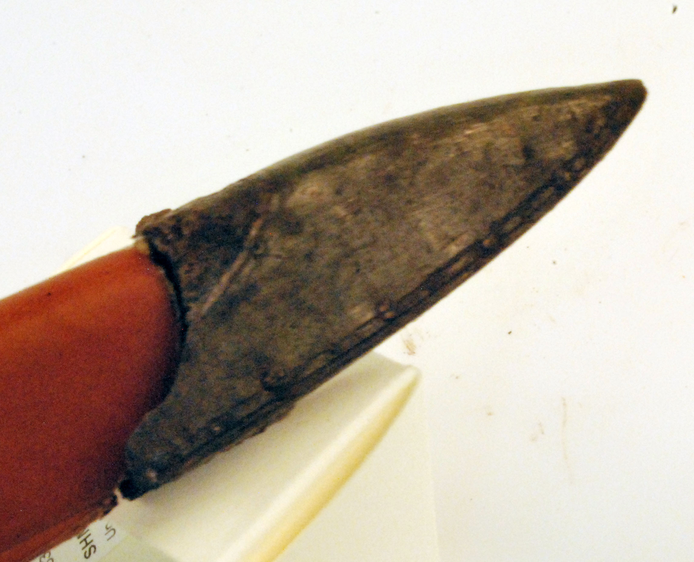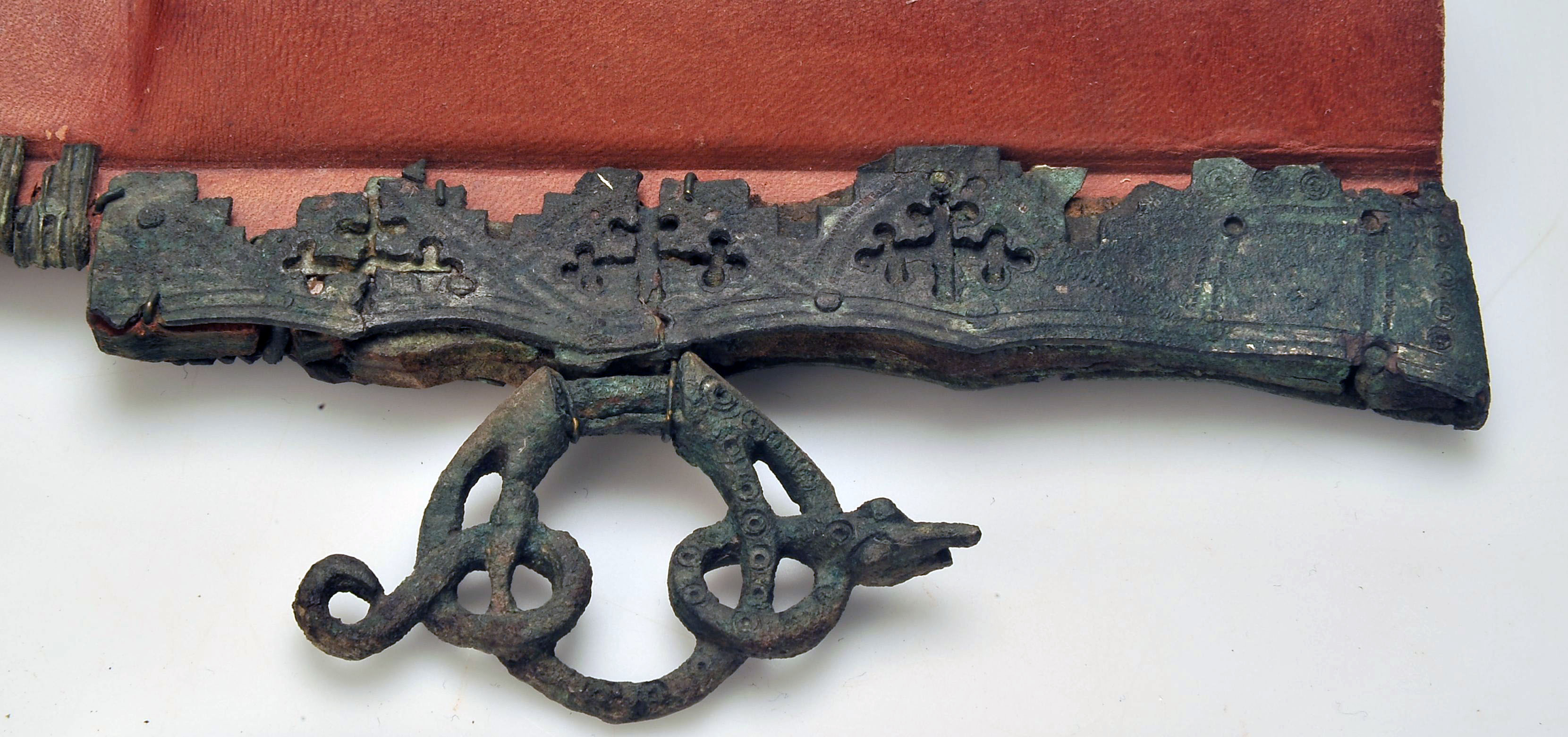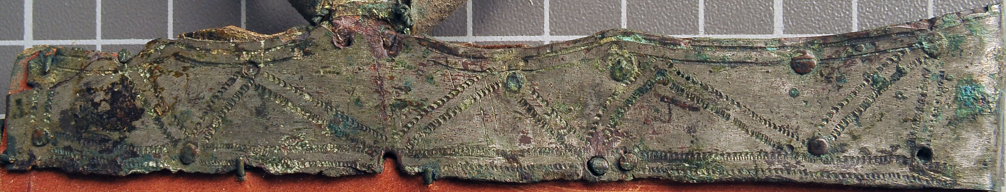 Kantbeslag och doppsko monterade på en rekonstruktion av läderslidan.