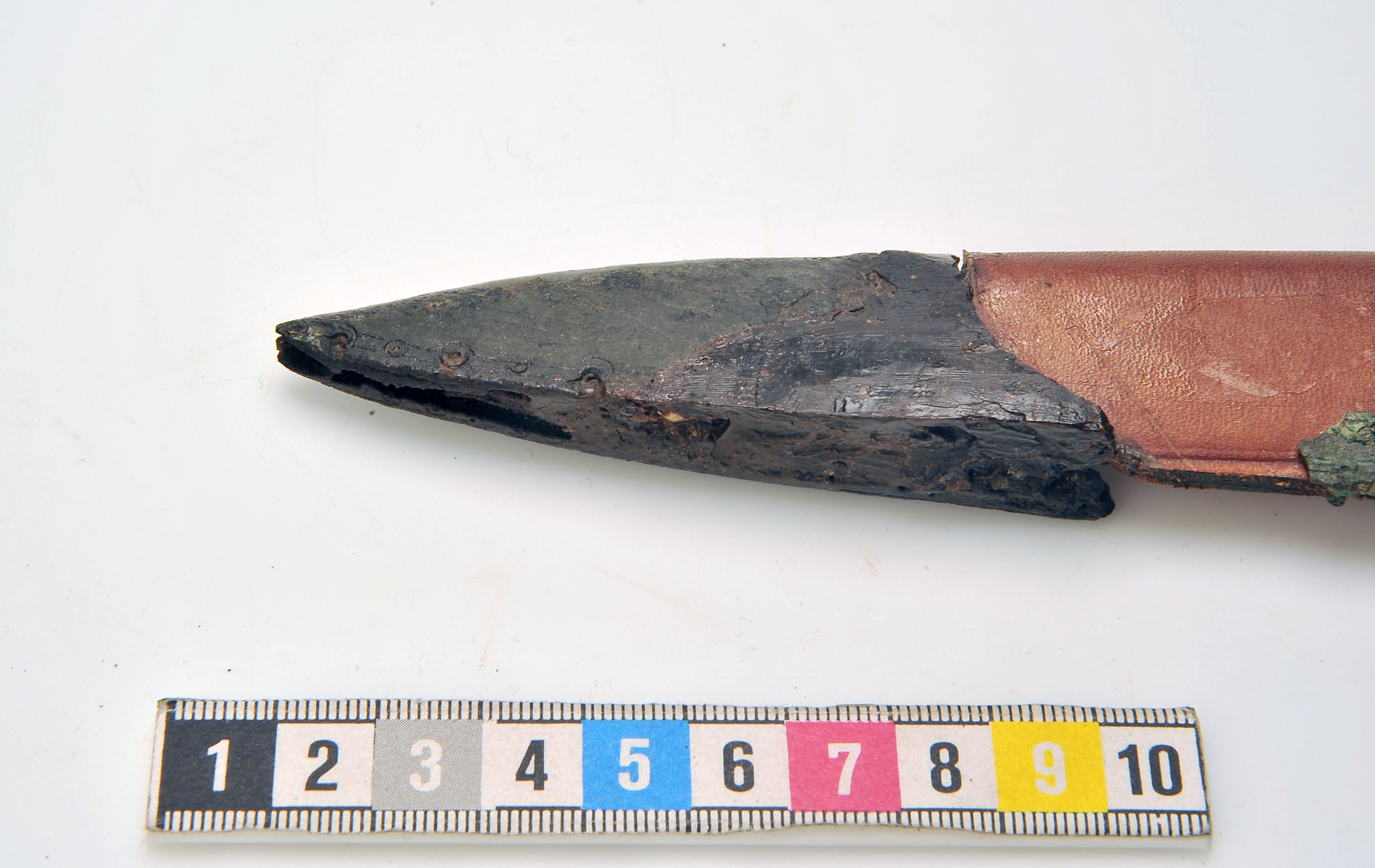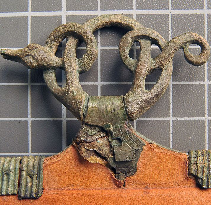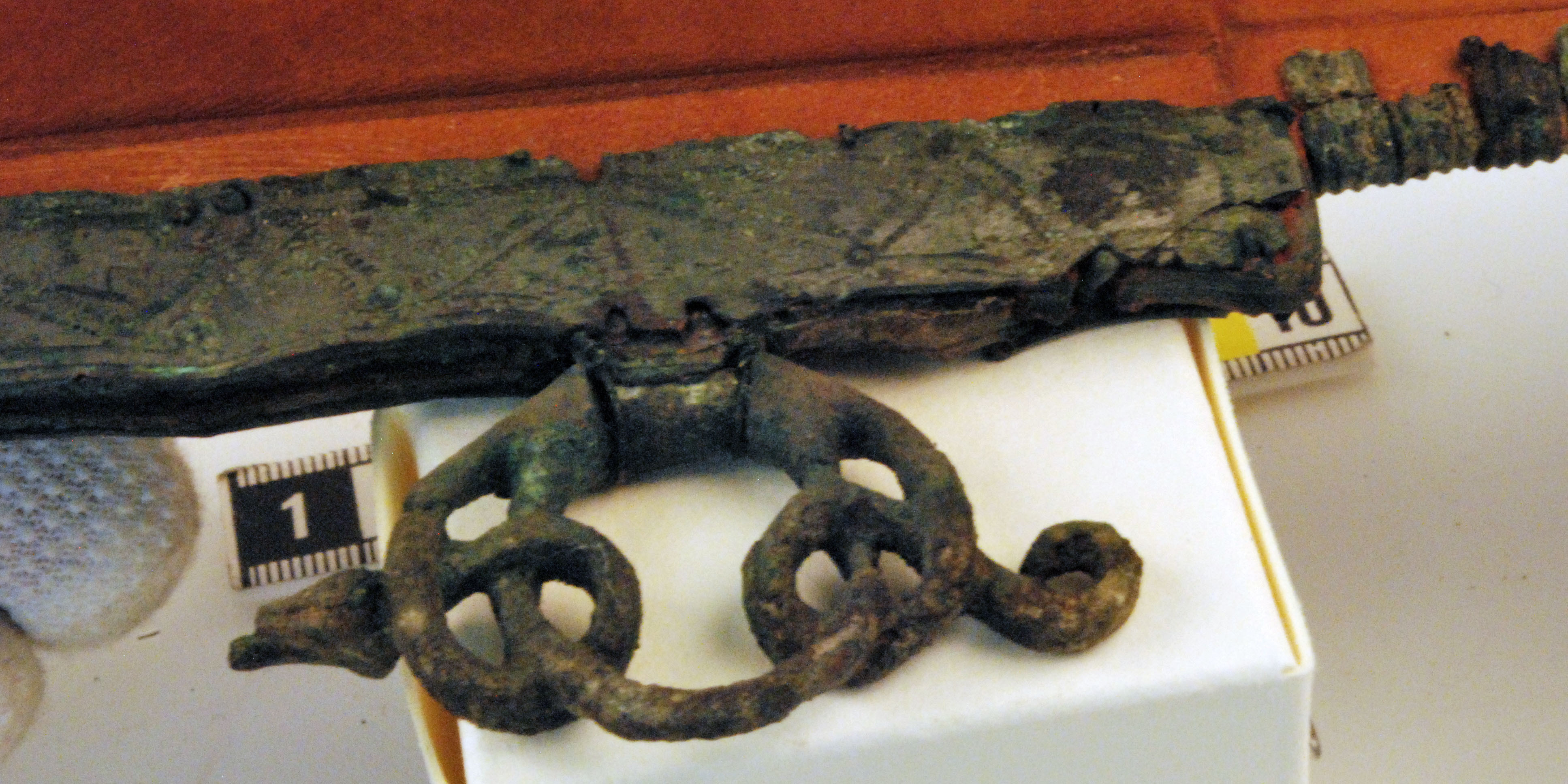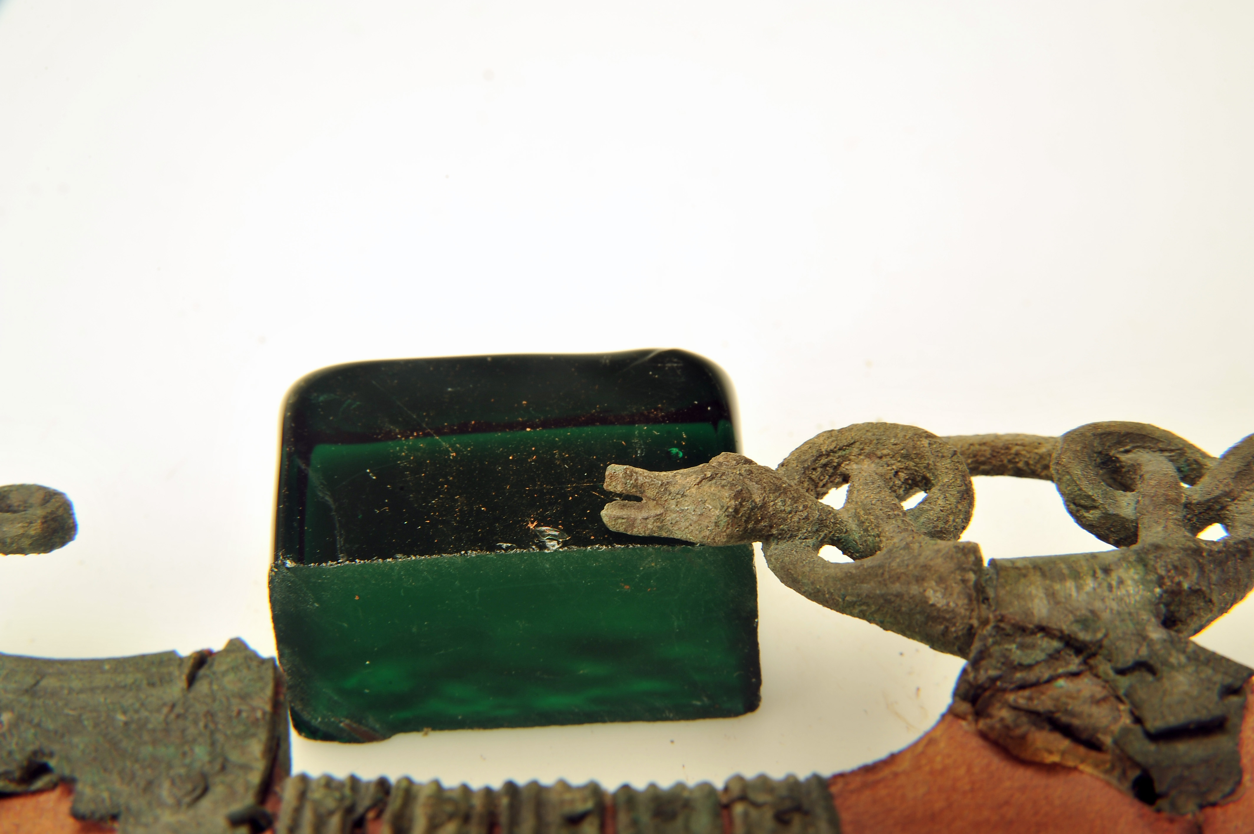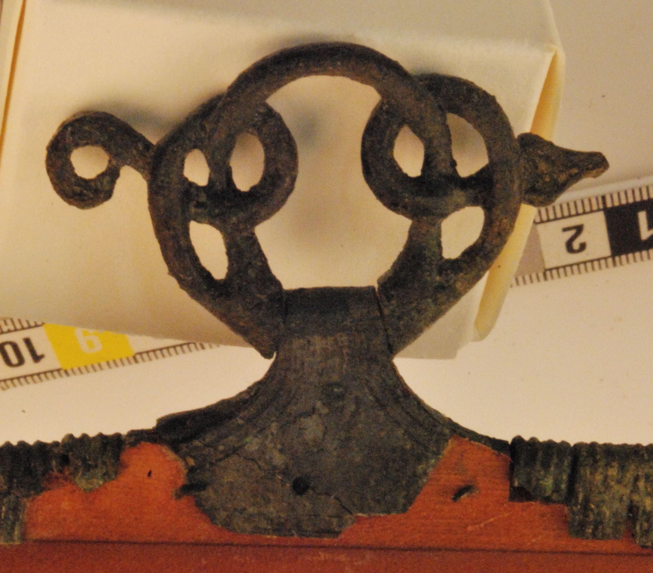 Kantbeslag och doppsko monterade på en rekonstruktion av läderslidan.