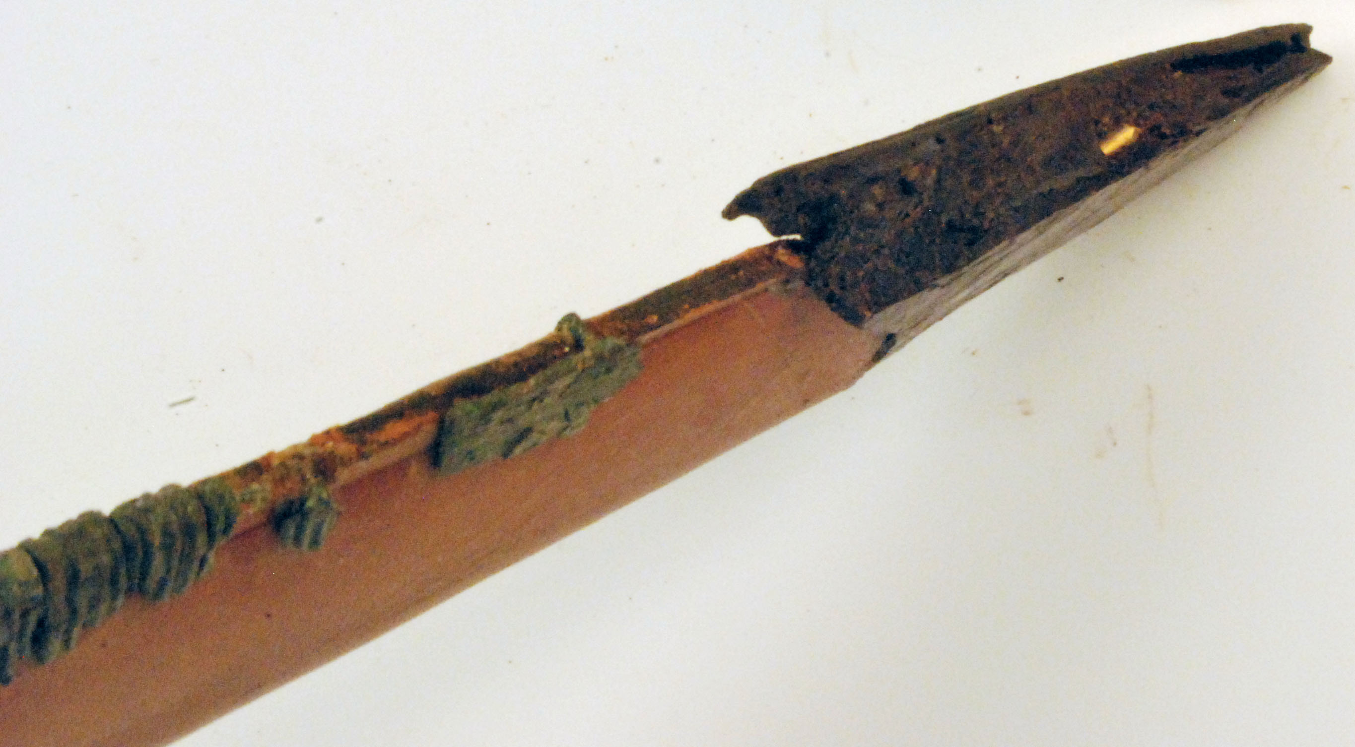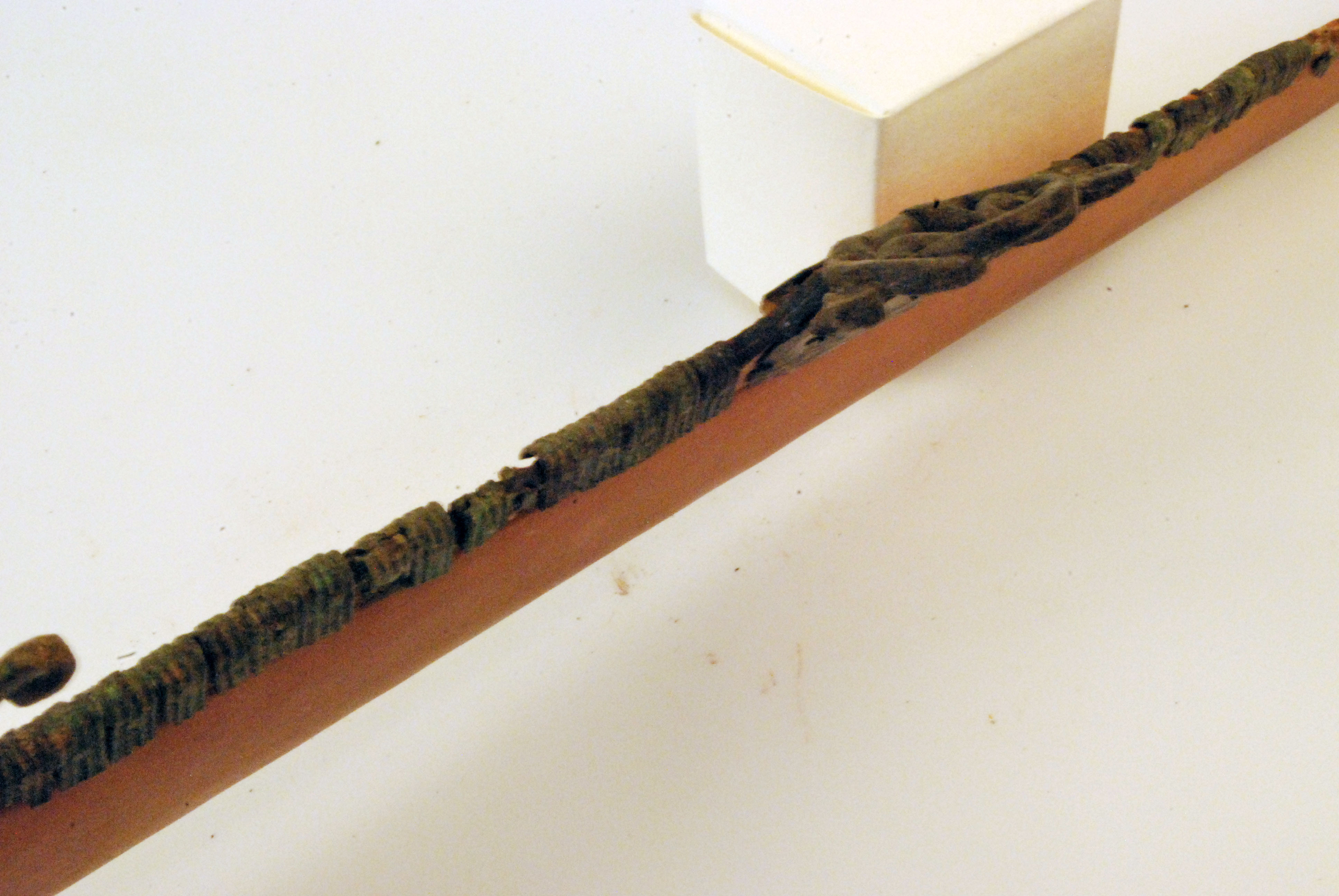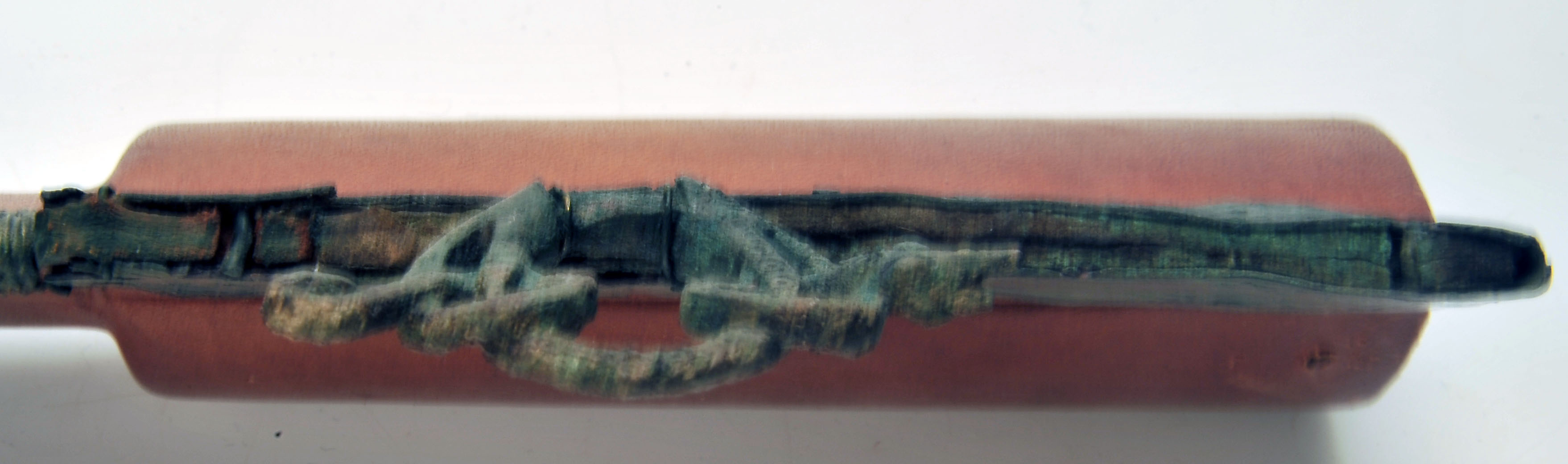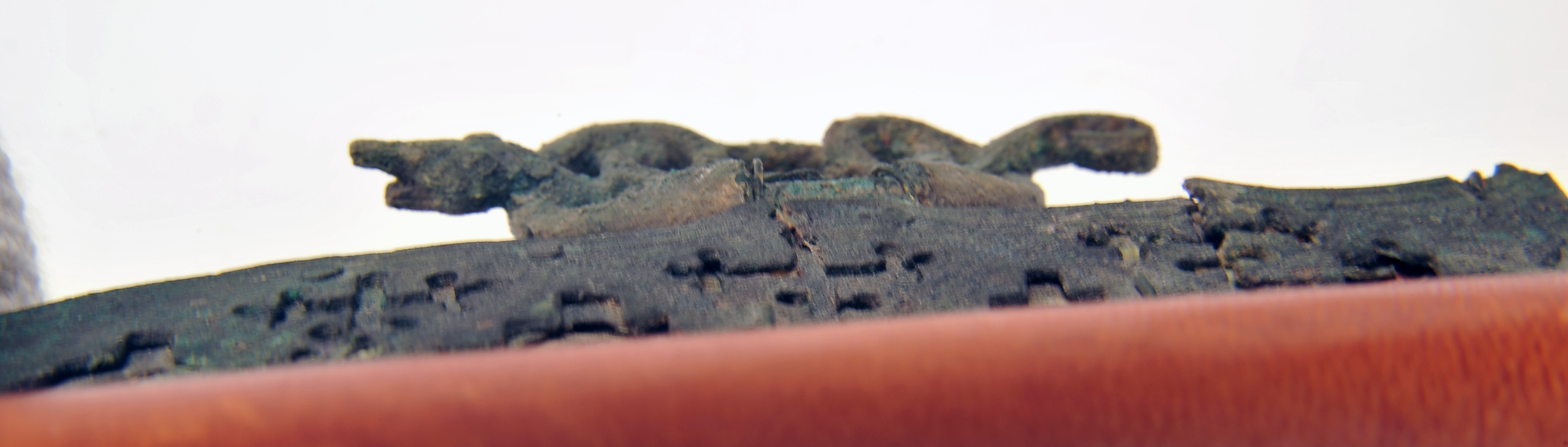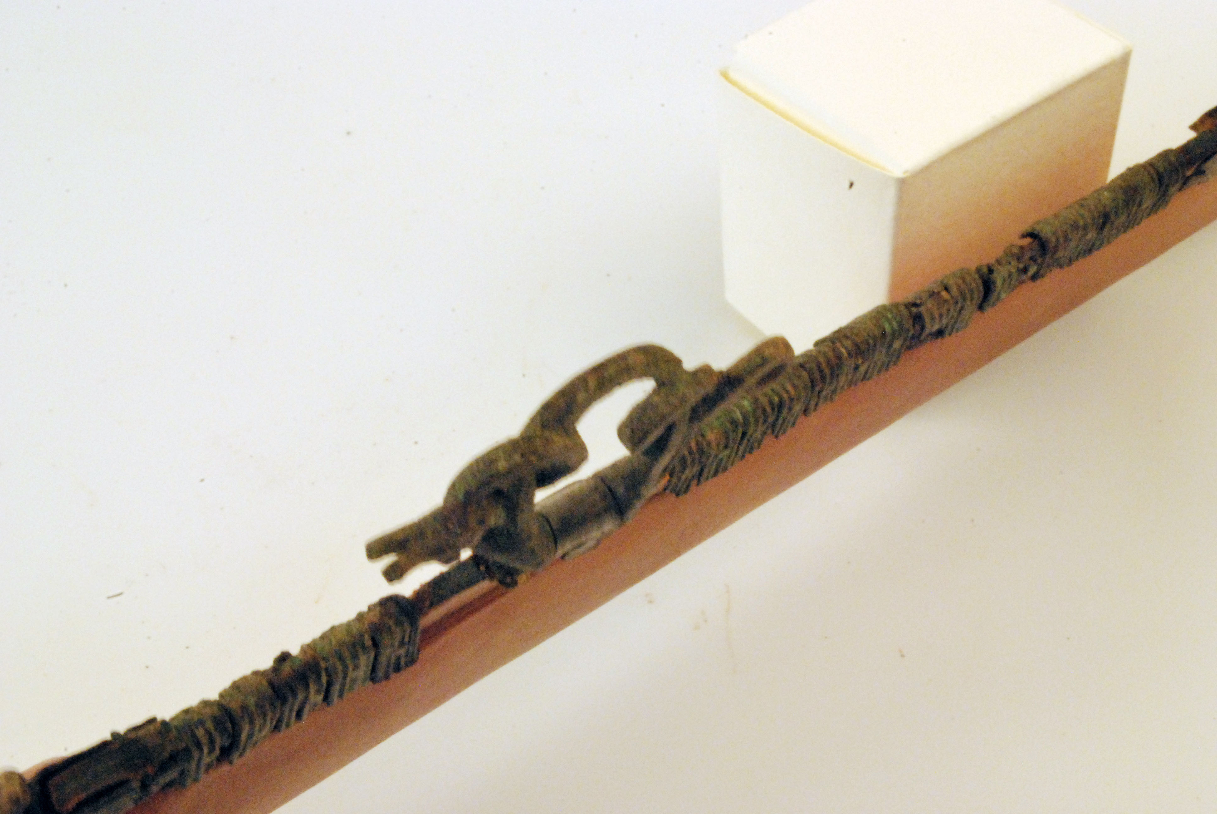 Kantbeslag och doppsko monterade på en rekonstruktion av läderslidan.