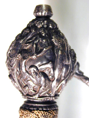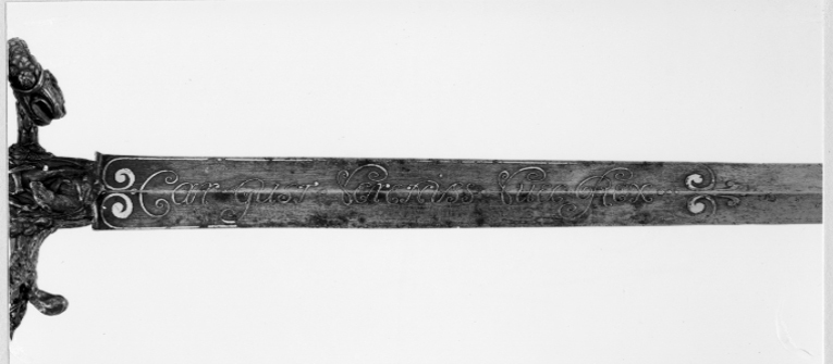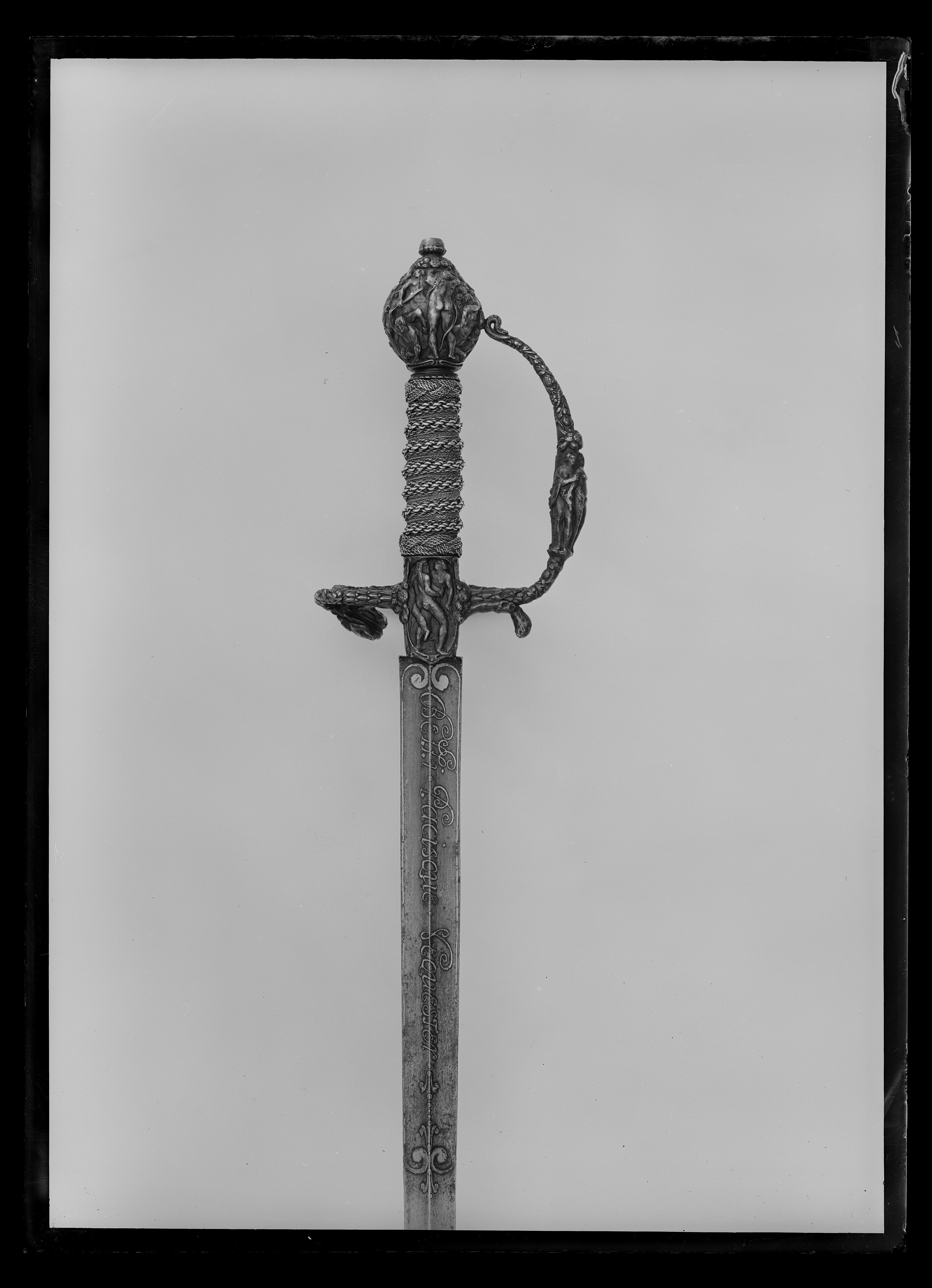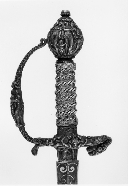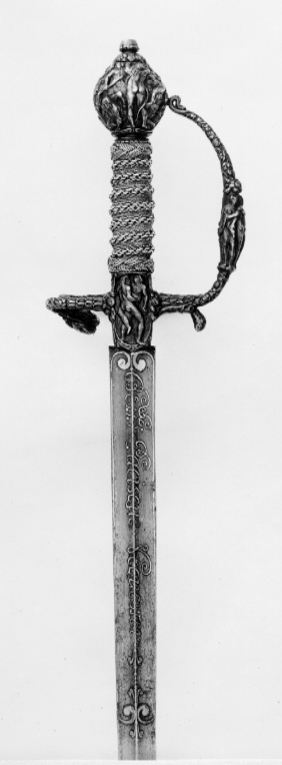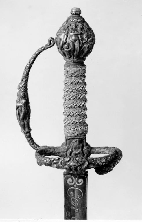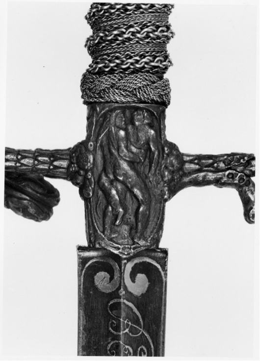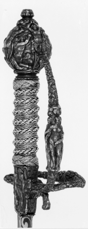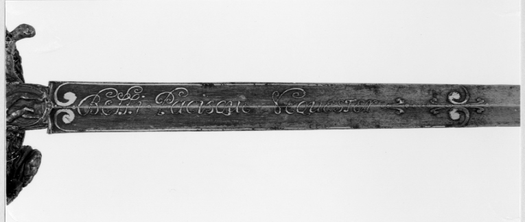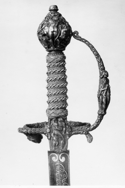 Fäste av mörkanlöpt rikt snidat stål. Knapp bukig, med avsmalnande över- och nederdel. Handbygel tämligen flack med vidgat mittparti. Pareranordningen i övrigt bestående av en oval kryssbygel på utsidan en mycket kort nedåtböjd främre parerstång och en tämligen lång bakre parerstång, spiralformigt böjd utåt-inåt. Den snidade orneringen yttäckande På knappens fram- och baksida en karyatid med uppåtböjda armar, på utsidan mellan karyatiderna figurscen med tre stående nakna kvinnor, nedtill åtföljda av en påfågel och en Cupido, till höger en sittande man med en stav i vänstra handen och ett äpple i den andra (Paris väljer vem som är den skönaste kvinnan, Juno, Venus eller Minerva); på insida en kentaur, en stående naken man, nedtill män som brottas (eventuellt kentauerns strid mot lapitherna. Figurscener återfinns även på handbygelns mittparti i form av stående nakna kvinnor, på kryssets vertikalt, utdragna ut- och insidor (Herkules dödar jätten Antaeus, Herkules bekämpar den den kretensiska(?) tjuren) samt på kryssbygelns mitt i form av en maskaron. Kavellindning av tvinnad tunn silvertråd, omväxlande med sju varv tvinnade grövre trådar av samma material, dessa bestående av två parter, vilka vardera i sin tur utgöras av tvinnade trådar; upptill och nedtill en flätad' krans av tvinnad förgylld tunn silvertråd. Klinga rak, tvåeggad, slipad med två jämnbreda, något konkava skär På starka delen mot nedetsad, blånerad botten förgylld inskription i skrivstil. På utsidan: "Car. Gust. Sereniss. Suec. Rex." På insidan: "Belli. Pacisque. Sequester", (Carl Gustav, den mest strå-lande, konung av Sverige, förmedlare av krig och fred). Inskriptionerna inom en bård av förgylld rak rand, ändarna insvängda.