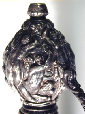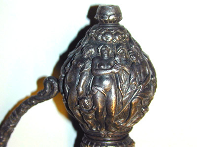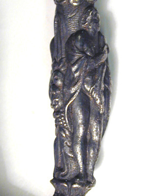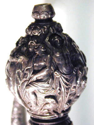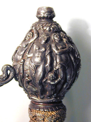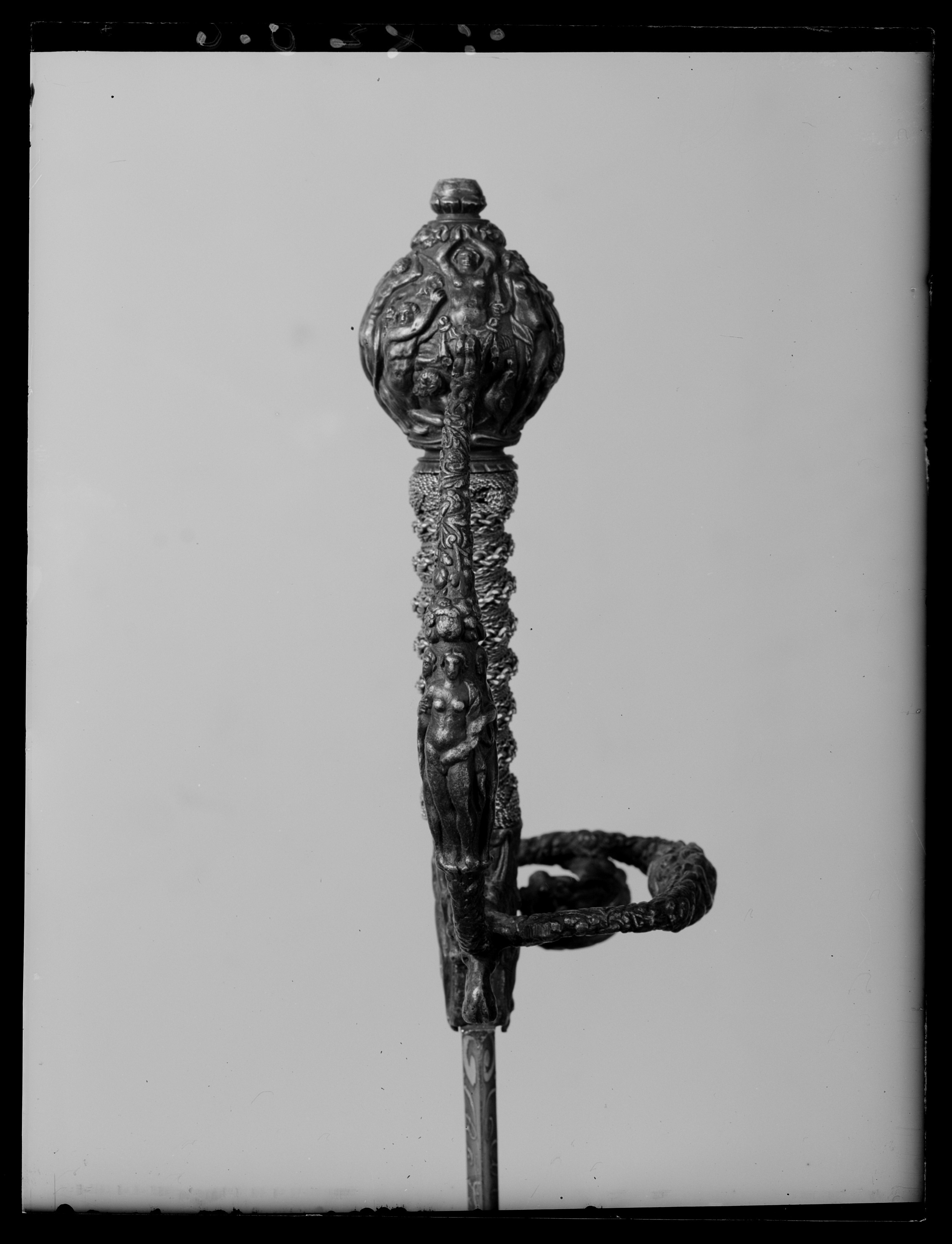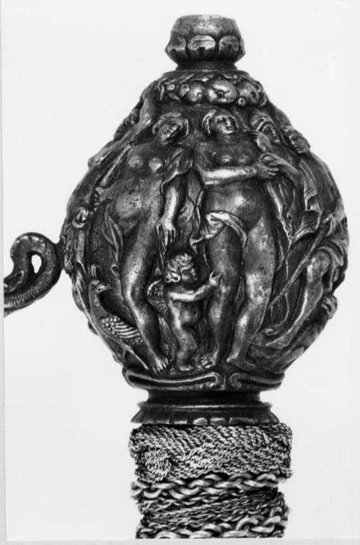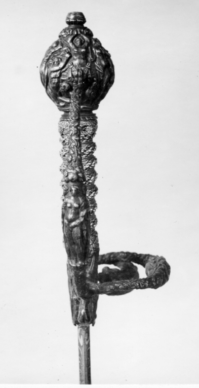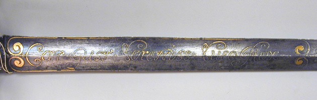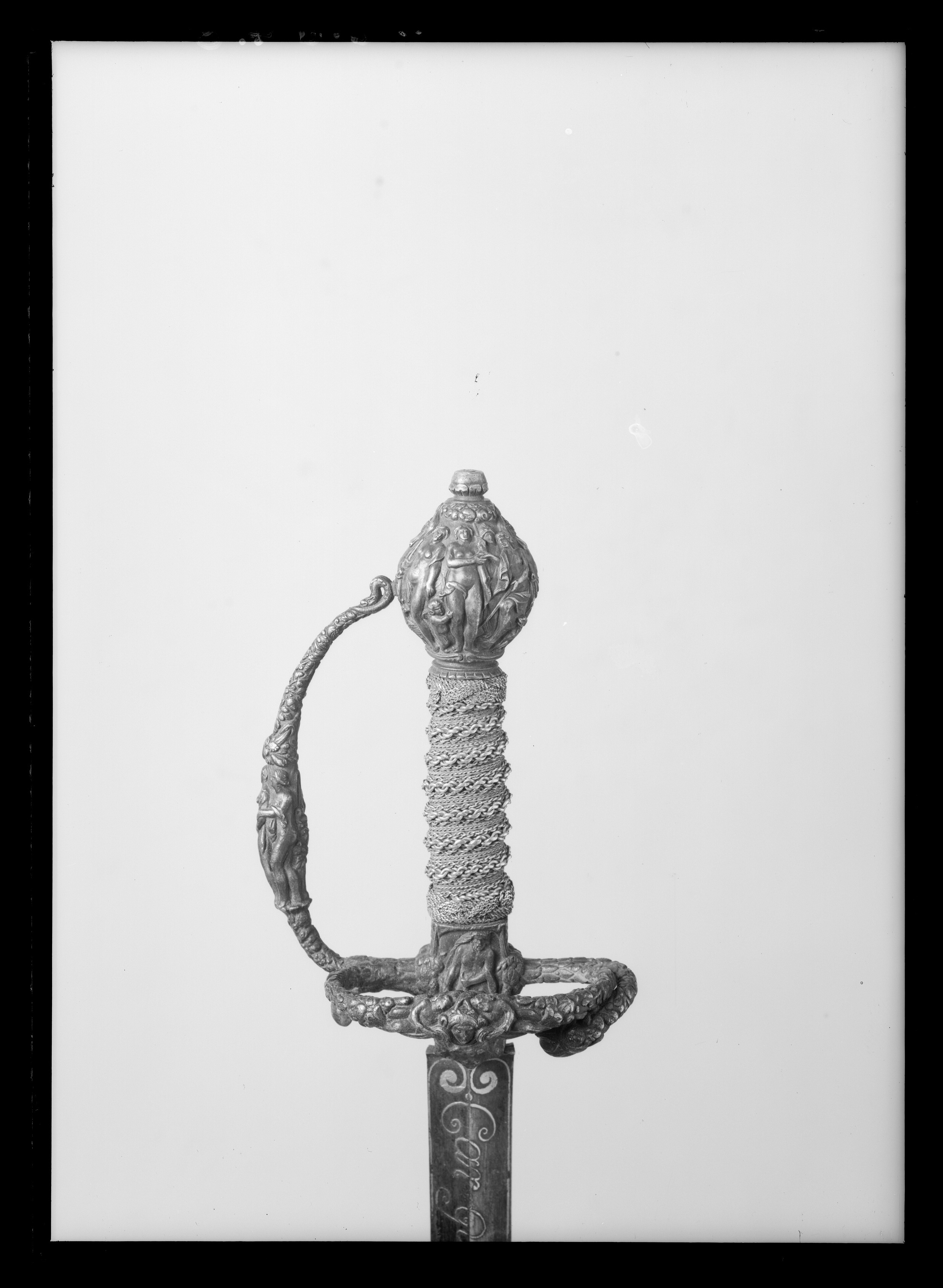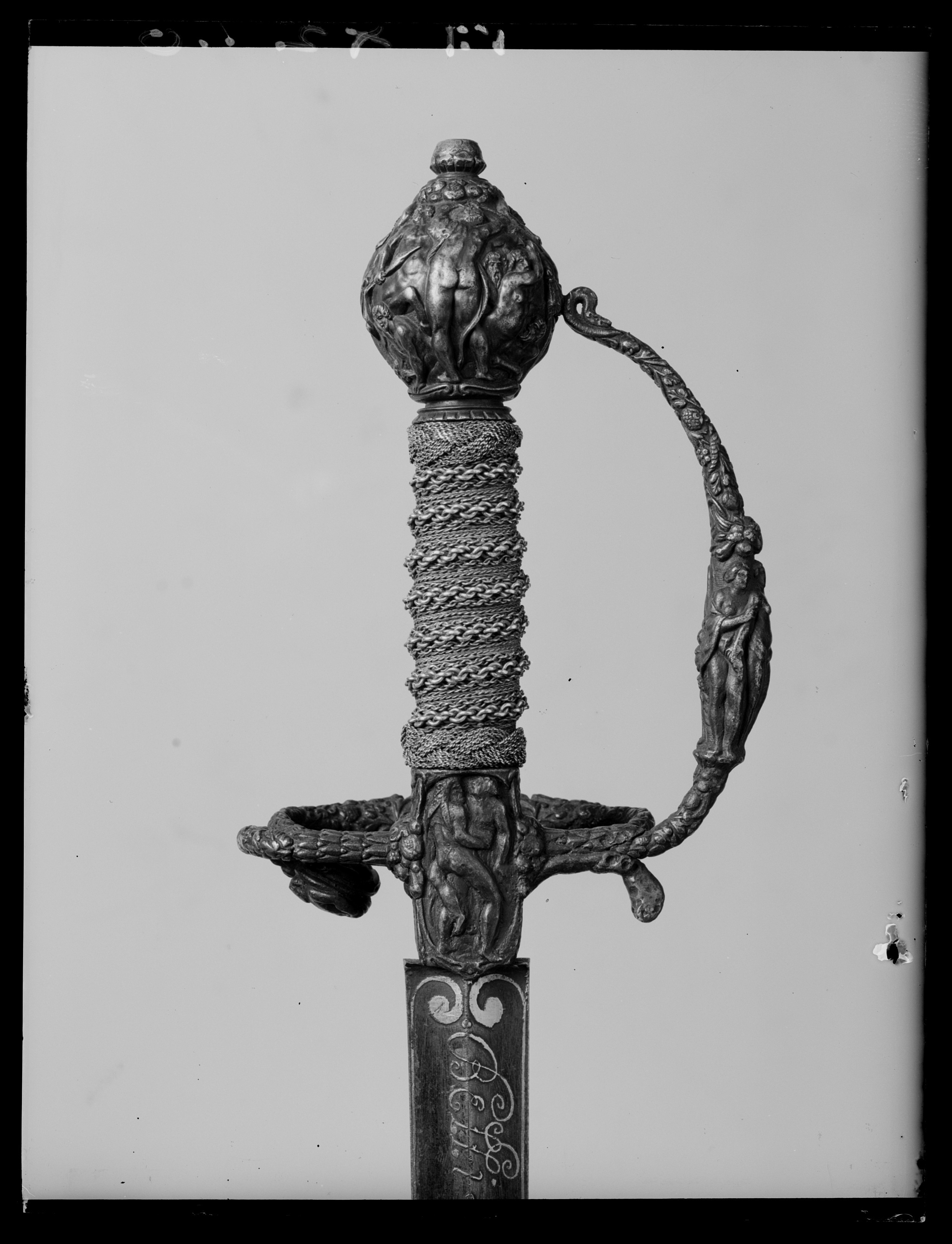 Fäste av mörkanlöpt rikt snidat stål. Knapp bukig, med avsmalnande över- och nederdel. Handbygel tämligen flack med vidgat mittparti. Pareranordningen i övrigt bestående av en oval kryssbygel på utsidan en mycket kort nedåtböjd främre parerstång och en tämligen lång bakre parerstång, spiralformigt böjd utåt-inåt. Den snidade orneringen yttäckande På knappens fram- och baksida en karyatid med uppåtböjda armar, på utsidan mellan karyatiderna figurscen med tre stående nakna kvinnor, nedtill åtföljda av en påfågel och en Cupido, till höger en sittande man med en stav i vänstra handen och ett äpple i den andra (Paris väljer vem som är den skönaste kvinnan, Juno, Venus eller Minerva); på insida en kentaur, en stående naken man, nedtill män som brottas (eventuellt kentauerns strid mot lapitherna. Figurscener återfinns även på handbygelns mittparti i form av stående nakna kvinnor, på kryssets vertikalt, utdragna ut- och insidor (Herkules dödar jätten Antaeus, Herkules bekämpar den den kretensiska(?) tjuren) samt på kryssbygelns mitt i form av en maskaron. Kavellindning av tvinnad tunn silvertråd, omväxlande med sju varv tvinnade grövre trådar av samma material, dessa bestående av två parter, vilka vardera i sin tur utgöras av tvinnade trådar; upptill och nedtill en flätad' krans av tvinnad förgylld tunn silvertråd. Klinga rak, tvåeggad, slipad med två jämnbreda, något konkava skär På starka delen mot nedetsad, blånerad botten förgylld inskription i skrivstil. På utsidan: "Car. Gust. Sereniss. Suec. Rex." På insidan: "Belli. Pacisque. Sequester", (Carl Gustav, den mest strå-lande, konung av Sverige, förmedlare av krig och fred). Inskriptionerna inom en bård av förgylld rak rand, ändarna insvängda.