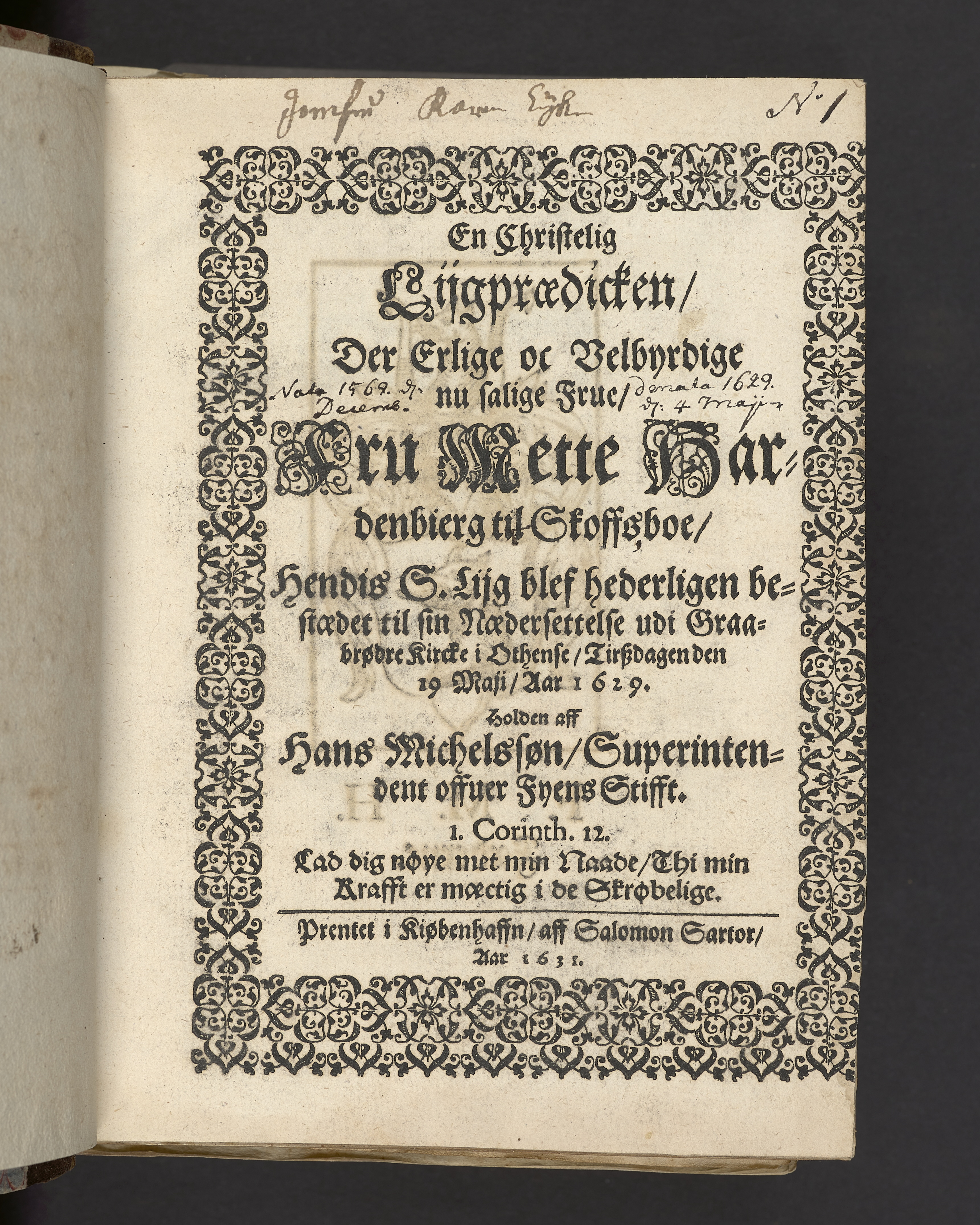 En Christelig Lijgpraedicken/ Der Erlige oc Velbyrdige nu salige Frue/ Fru Mette Hardenbierg til Skoffsboe/ Hendis s. lijg blef hederligen bestaedet til sin Naedersettelse udi Graabrødre Kircke i Othense/ Thißdagen den 19 Maji/ Aar 1629. Holden af Hans Michelsøn/ Superintendent offuer Fyens Stifft. ...Prentet i Kiøbenhaffn/ aff Salomon Sartor/ Aar 1631.