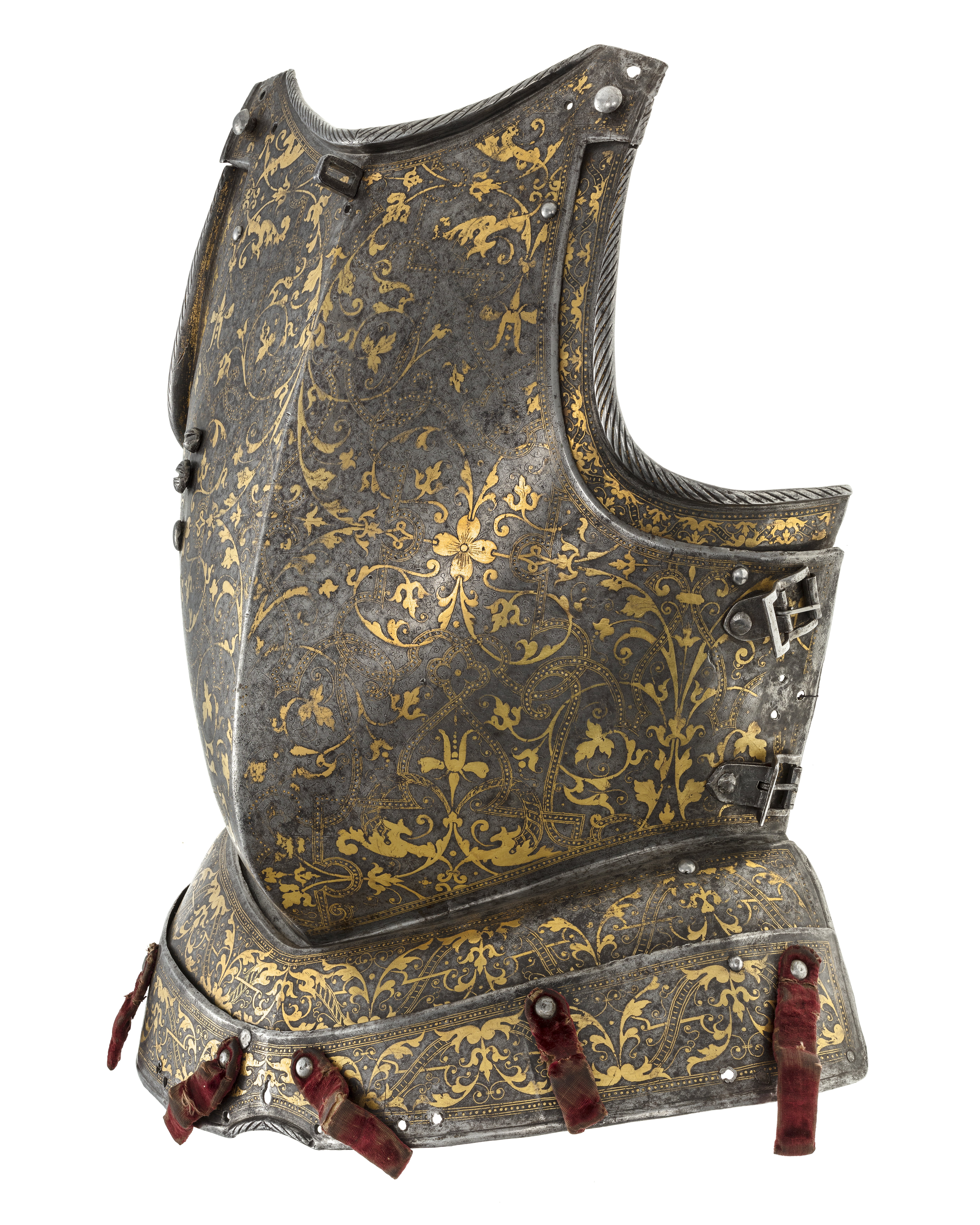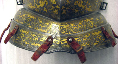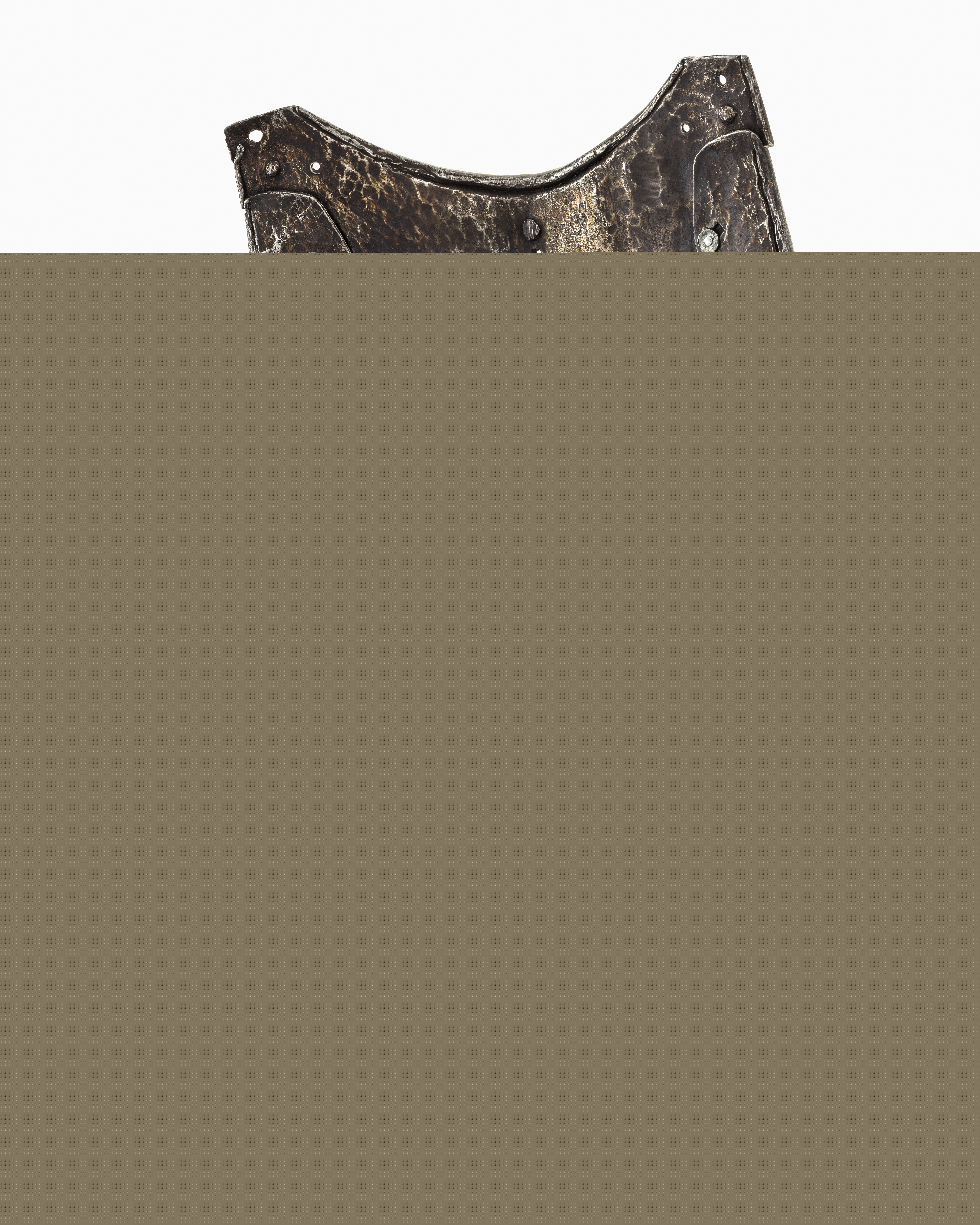 Driven stålplåt med på utsidan förgylld dekor mot mörk bakgrund. Insidan brunaktig med tydliga hammarslag. Sammanlagt två delar. Fast monterad på harnesk nnr 23386. Bestående av två välvda skenor sammanfogade omlott med nitar. Fästad på harneskets krage med nitar i sidorna, ej löstagbar. Övre kant rundad med sidorna något bredare. Harneskets mittås fortsätter över ner över skenorna. Kanterna raka, släta och lätt fasade inåt. Nedersta skenans nedre kant omvikt och rundsmidd med i mitten rundad konkav urtagning där kanten även är repstavsfilad. Över denna ett nyckelhålsformat hål. På nedre skenan fäst sex sämskade läderremmar klädda med röd sammet, l 60 mm. De yttre något längre, 100 mm. Fäst i övre änden med en kullrig nit. Dekor: Hela ytan blånerad. Mot fint skrafferad yta ett slingrande rankmönster av påslaget guldbleck och prickpunsade kantlinjer. Dessutom ett oregelbundet mönster av 5 mm breda band längs kanterna och genom rankorna. Banden består av i mitten försänkta punkter fyllda med guld, på var sida två tunna linjer av påslaget guld med en yttre linje av punsade prickar. Kragen nertill förgylld