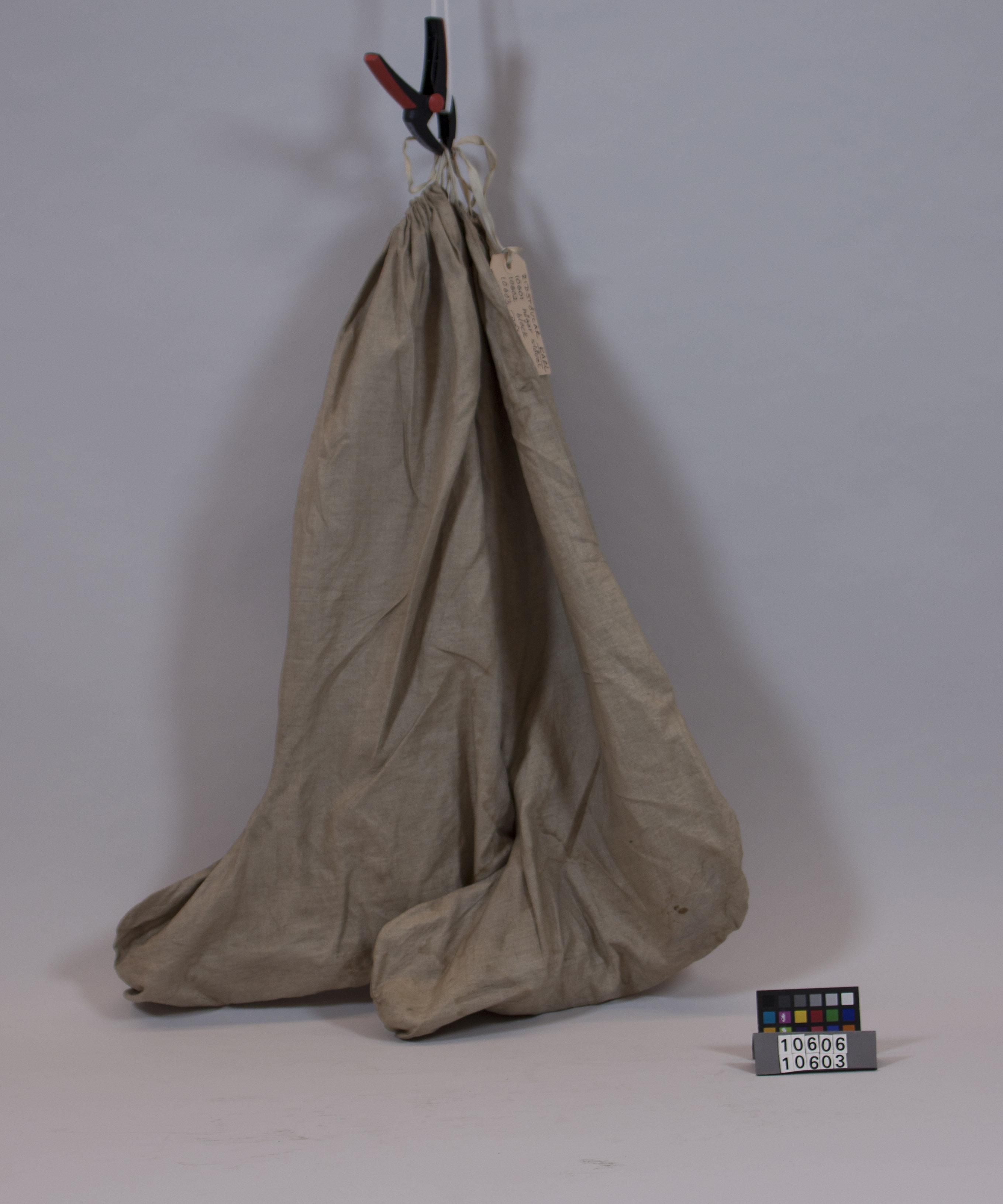 Påse av oblekt linne med dragsko upptill, däri trätt vitt bomullsband. I bakkanten sprund. Knäppning med vit "pärlemor"knapp.