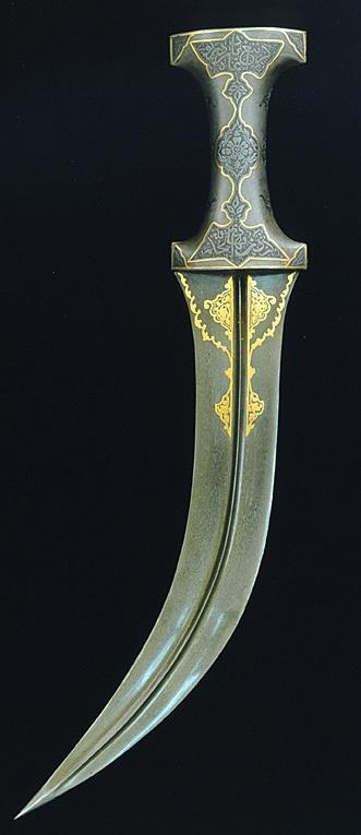 Timglasformigt fäste av trä, klätt med tunt mörkanlöpt stål med ovalt tvärsnitt med dekor av konturerade fält inneslutande etsade arabiska skrivtecken samt på mitten en blomma. Utmed kanterna och runt fälten tunna linjer av påslaget guld. Klinga, böjd, tvåeggad, damaskerad, mörkanlöpt med upphöjd mittås utmed hela lägden. Vid basen på båda sidor rank och blomornament av påslaget guld.
