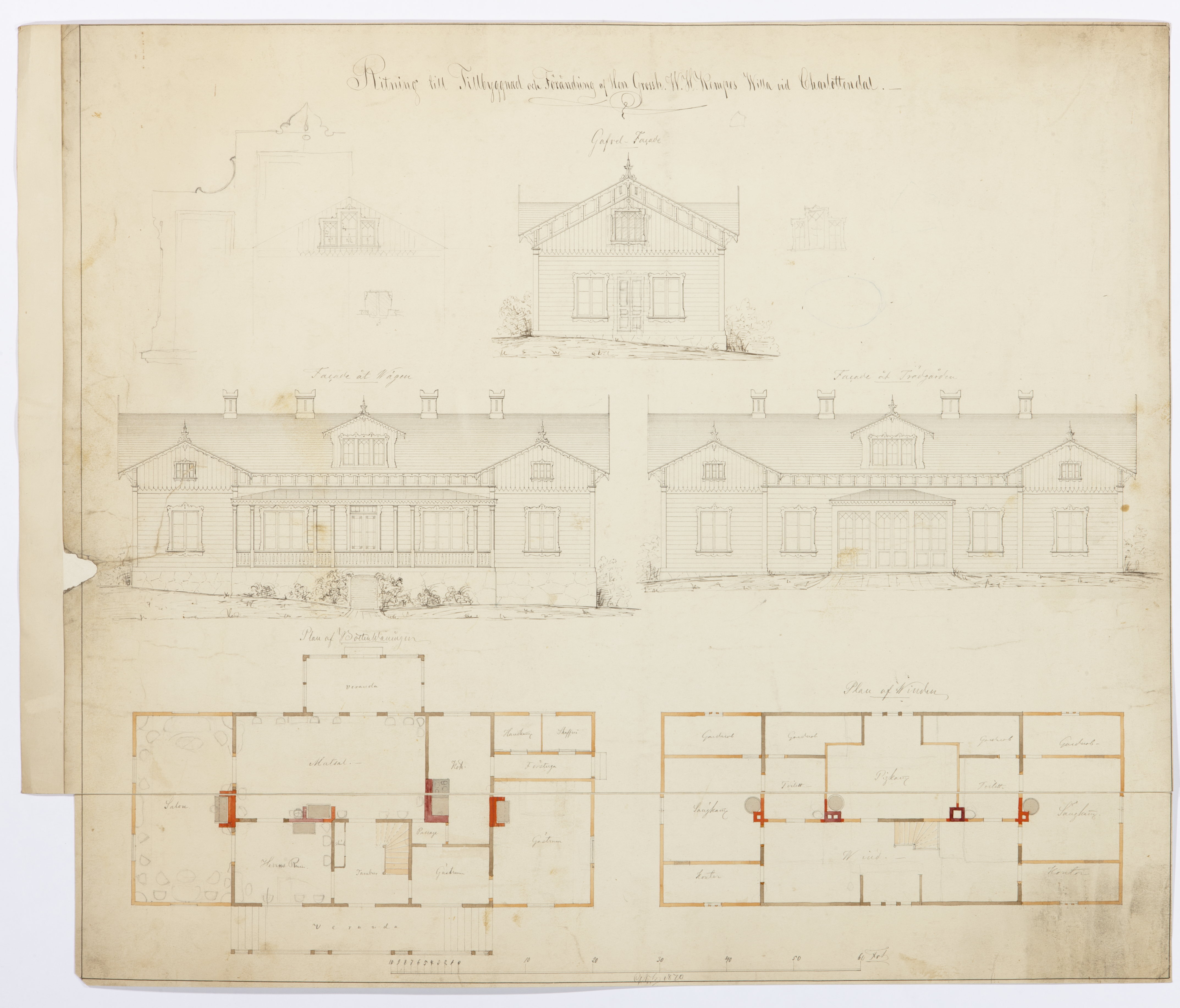 Byggnadsritningar. Charlottendal, Brännkyrka sn. Ritning till tillbyggnad och förändring av herr grossh. W.H.Kempes villa vid Charlottendal. Fasader och planer. 1870. Tuschteckning och färger på papper, 73,5 X 64,5 cm., uppklistat på kartong.