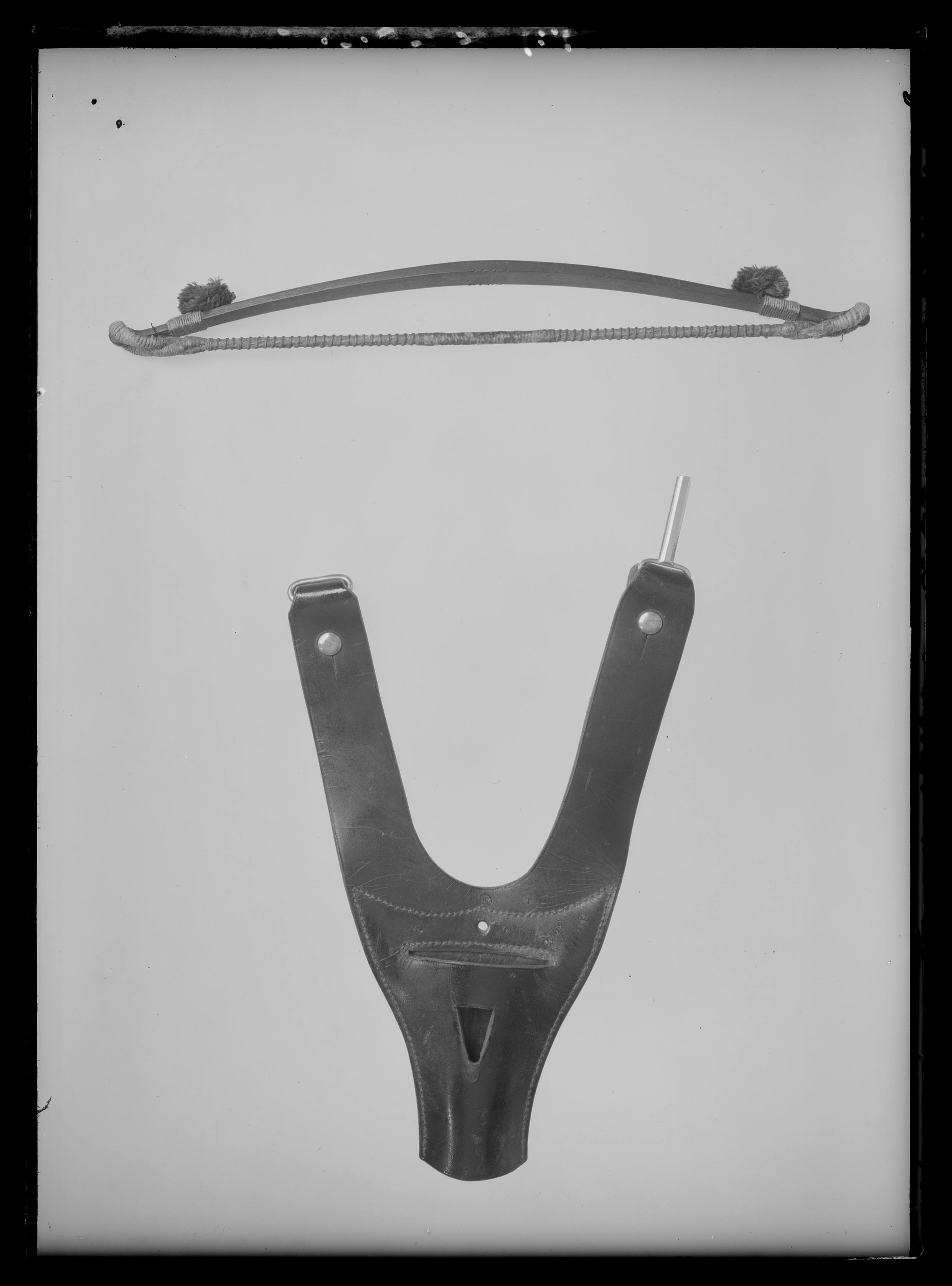 Koppelhylsa av svärtat, blankt läder med två snett uppåtriktade bärremmar, den ena med uppåtriktad, smal bygel av förgylld mässing, den andra med tvärställd bygel av samma material.