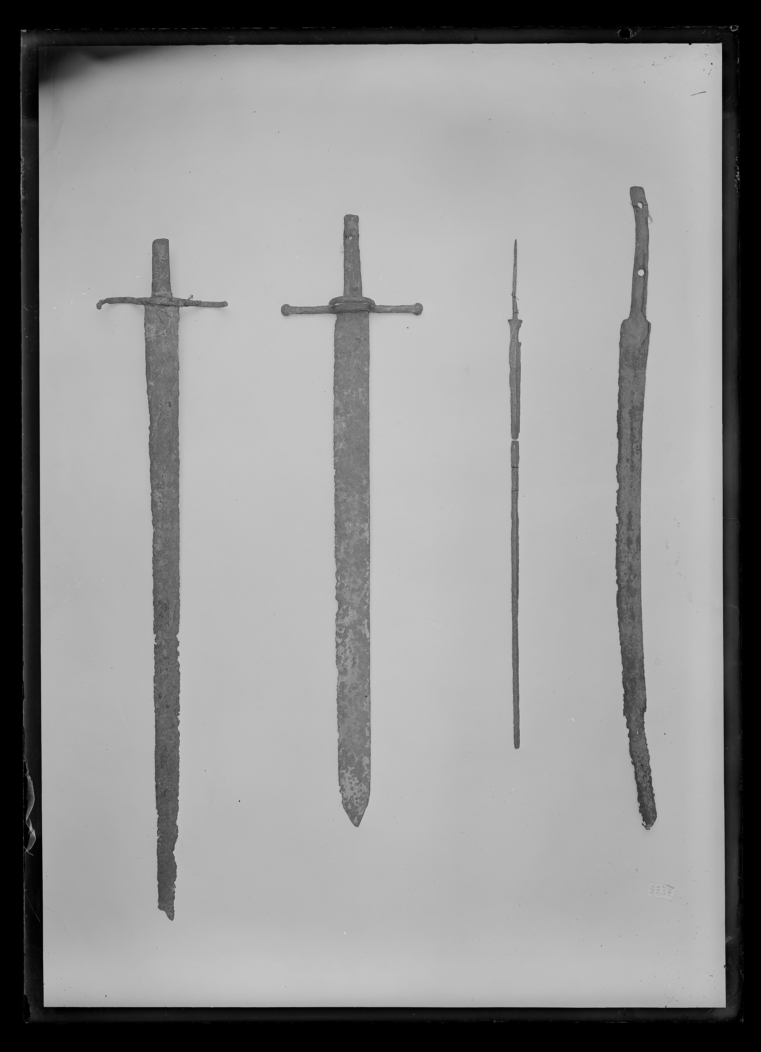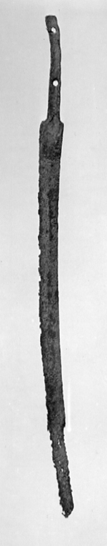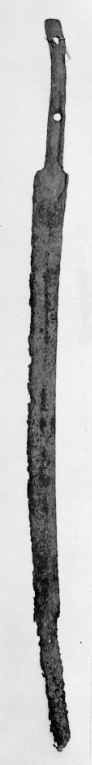 Vapnet i sin helhet med mörkbrun ytbeläggning (över gravrostskadorna). Tånge platt, utsidan med förhöjda kanter, överdelen framåtböjd; genom över- och nederdelen ett runt hål (för kavelns fastsättande). Klinga eneggad, böjd, asvårt rostskadad, i synnerhet vid spetspartiet. Utmed eggsidan kan en bred, grund hålkäl skönjas.