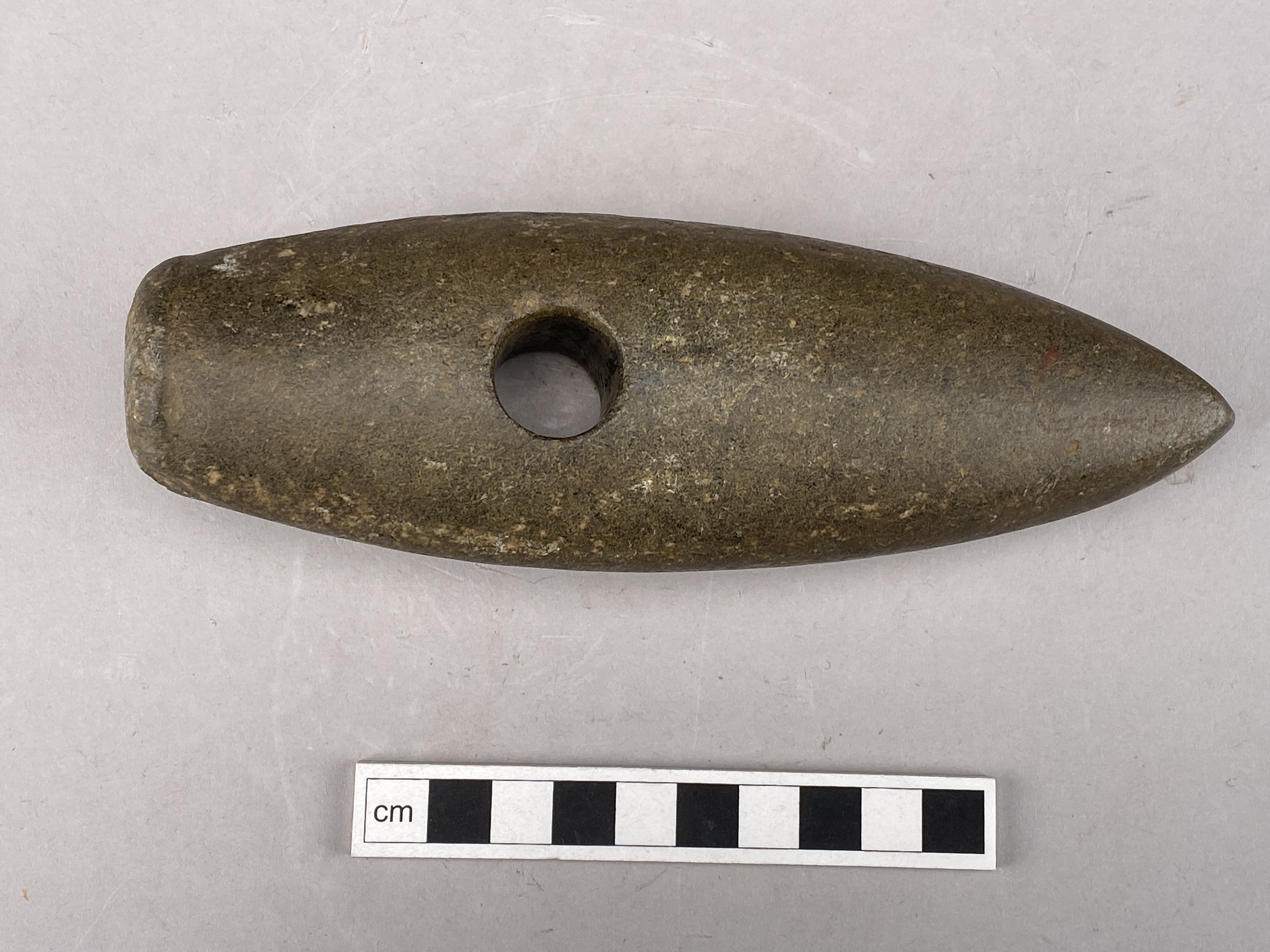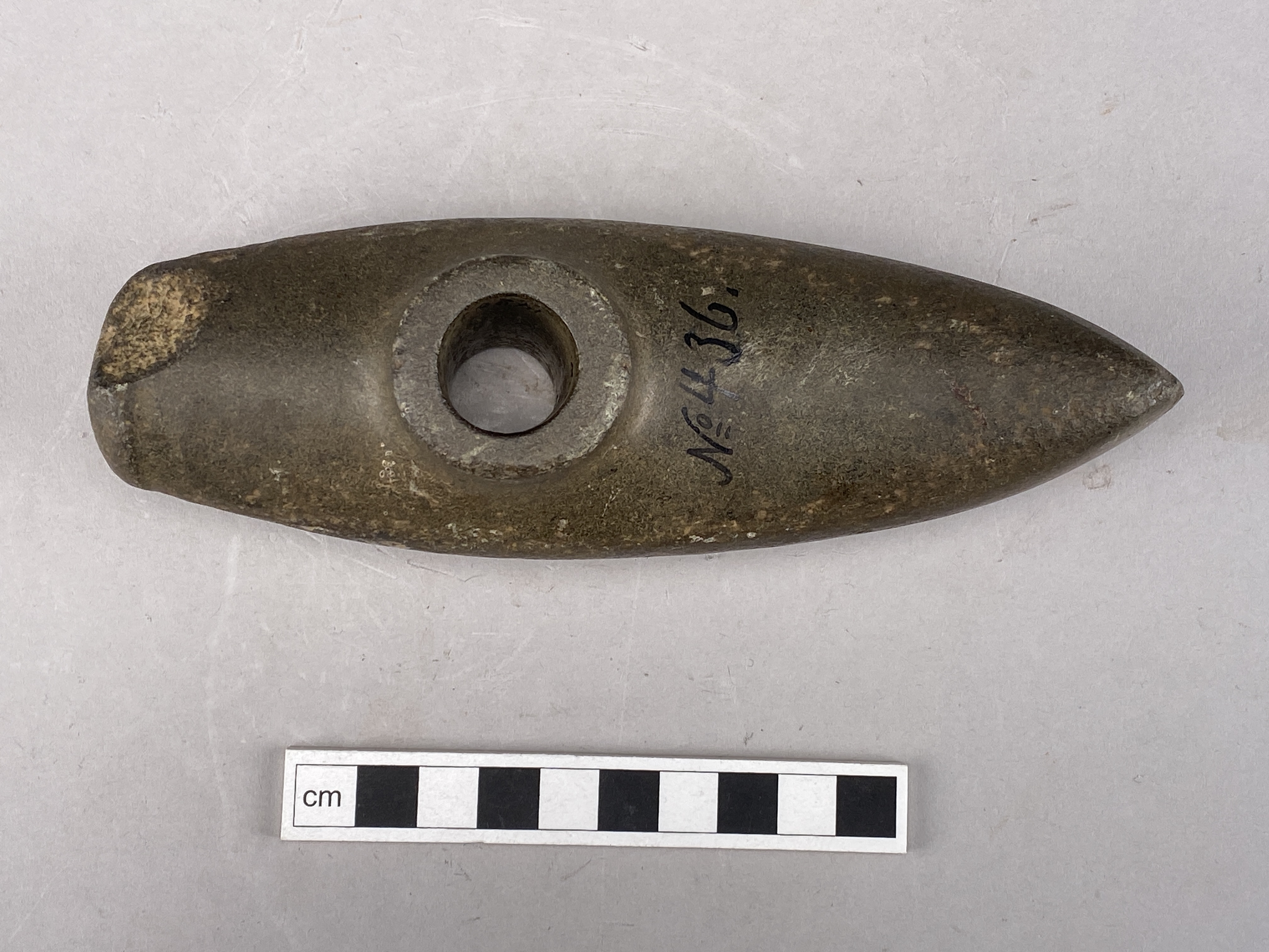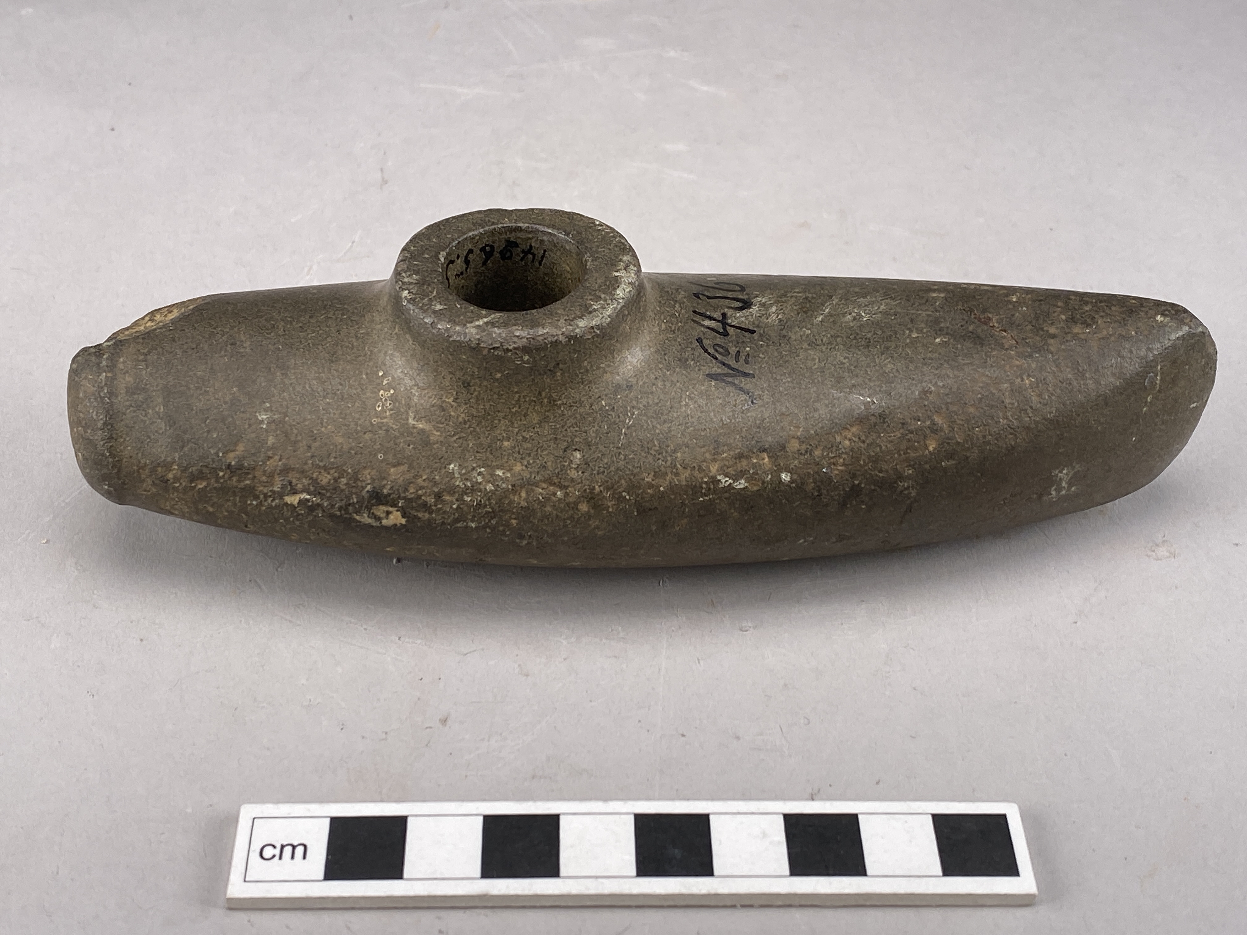 Hel båtyxa utan skuldror med rundovalt nacktvärsnitt, skaftholk och nackknipp. Skada på nacken.