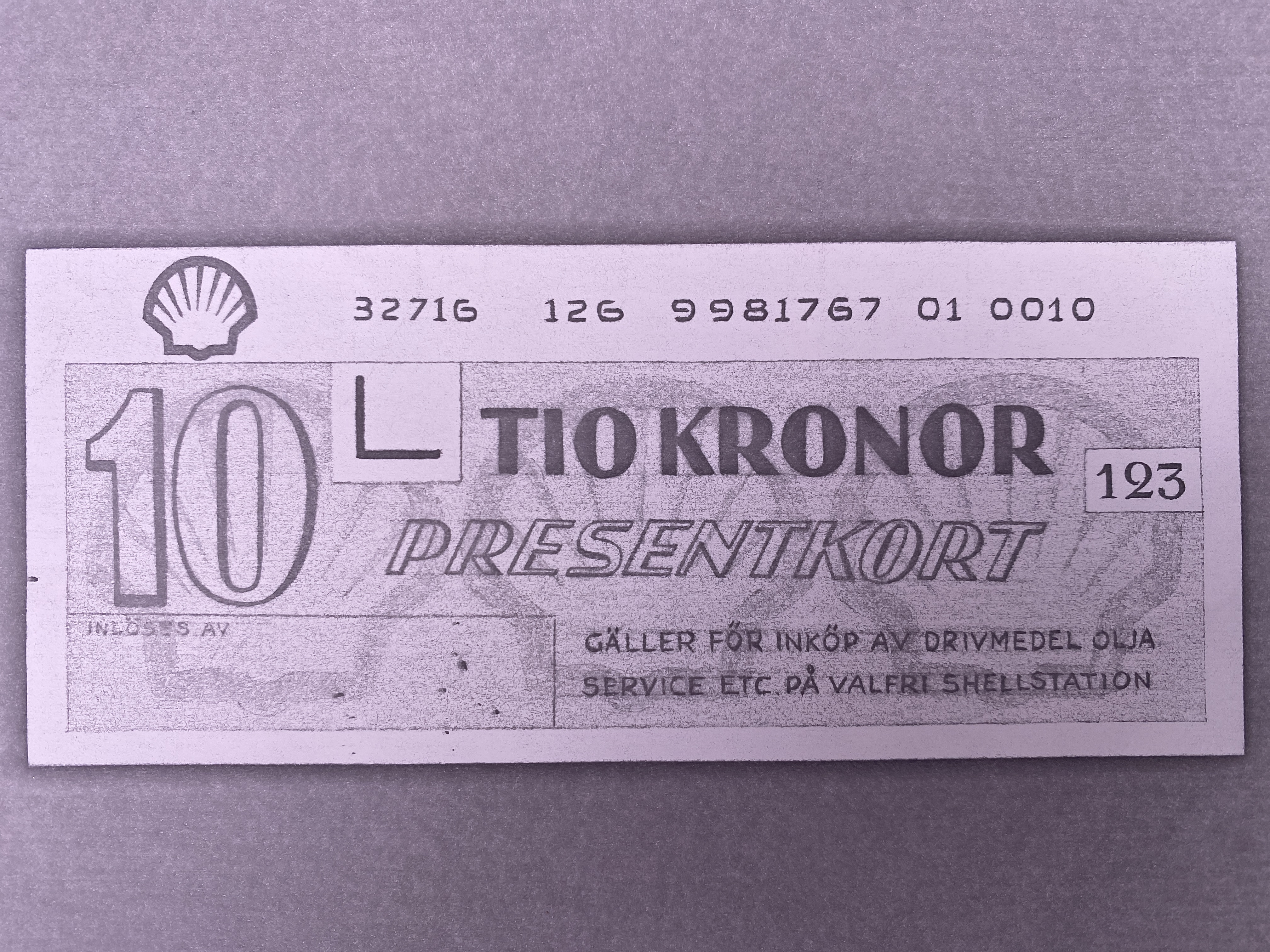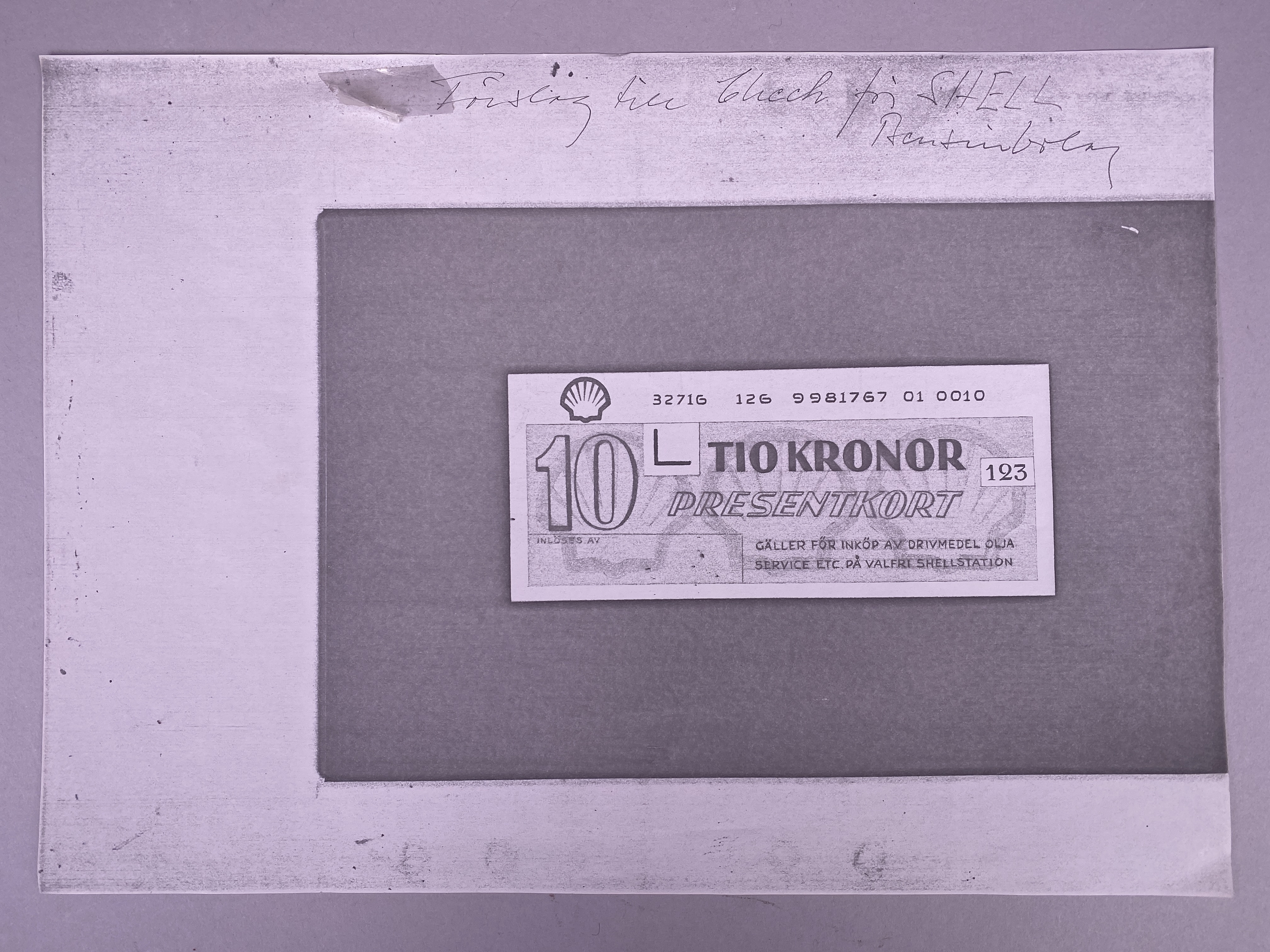 Fotostatkopia av skiss/förslag till presentkort (10 kronor) vid köp av drivmedel, olja, service etc. på valfri Shellstation. Hör ihop med skiss 3145713, båda odaterade.