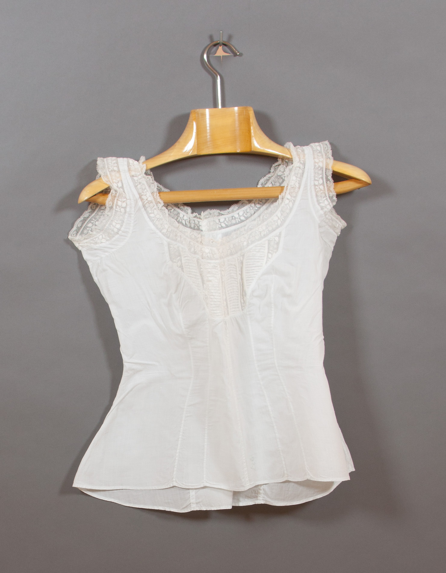 Figursydd, ärmlös blusskyddare, sk camisol av vit, tunn bomullsbatist skuret i sex delar. Mitt fram är infällt ett parti med stråveck och band med blommotiv. Ringningen och ärmringningen är ytterst dekorerade med en knypplad spets och innanför med ett vitbroderi. I ringningen sitter en dragsko med ett smalt bomullsband. Linnet knäpps bak med elva tygöverklädda knappar, 9 mm i diameter. Mitt fram nedtill broderat Victorias monogram i blått under kunglig krona.